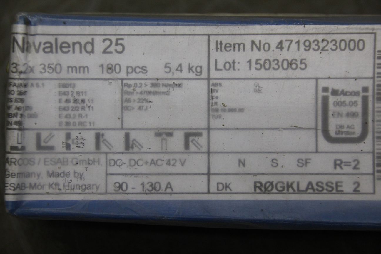 Stick electrodes 3.2 x 350-Type: Navalend 25-Price: per package-Number: 2 packages available-Weight per package: 5.3 kg