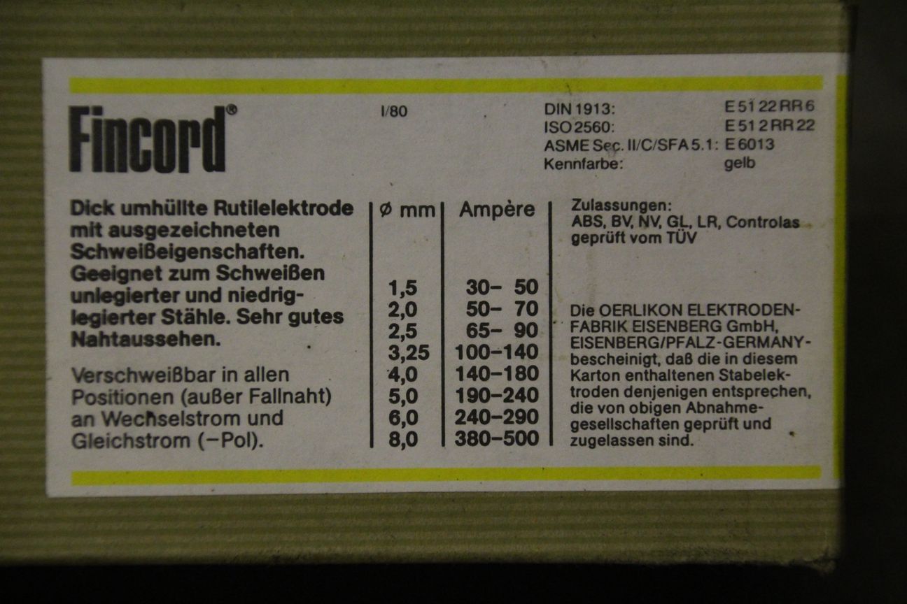Stick electrodes 5.0 x 450 -Type: Fincord Price: per package -Number: 4 packages available -Weight per package: 5.5 kg