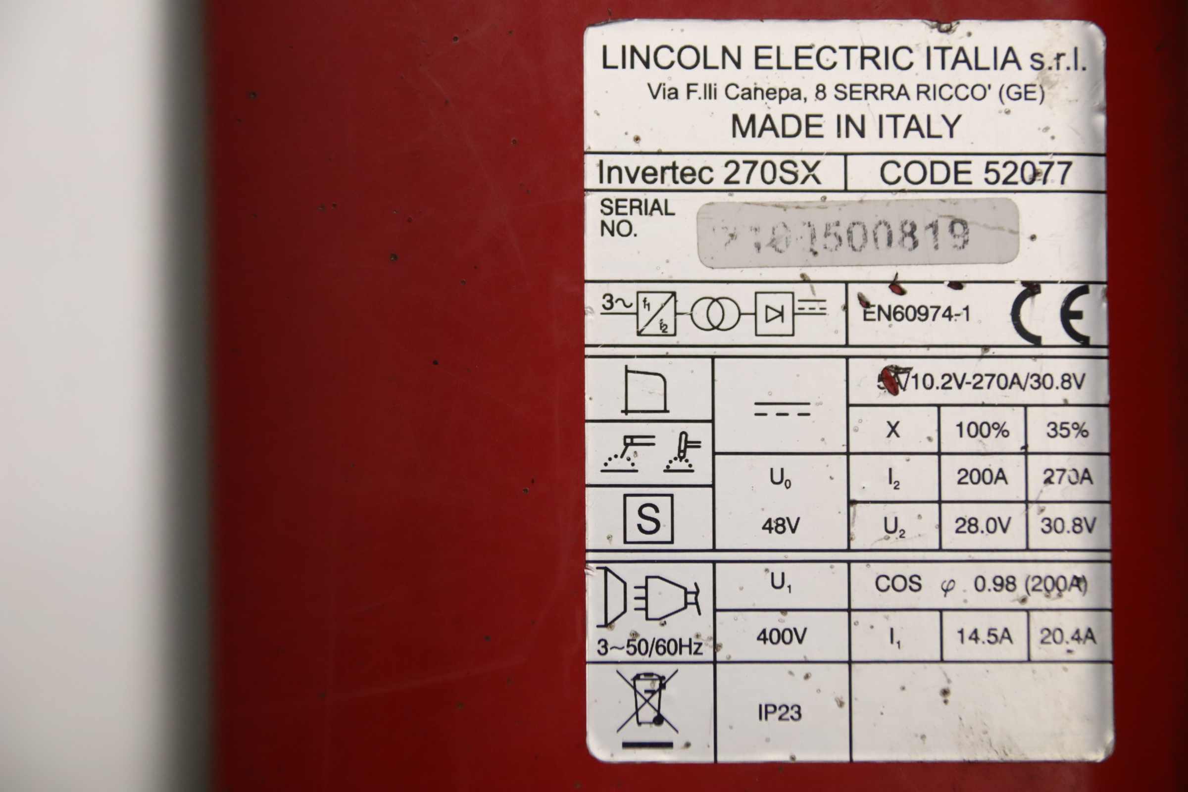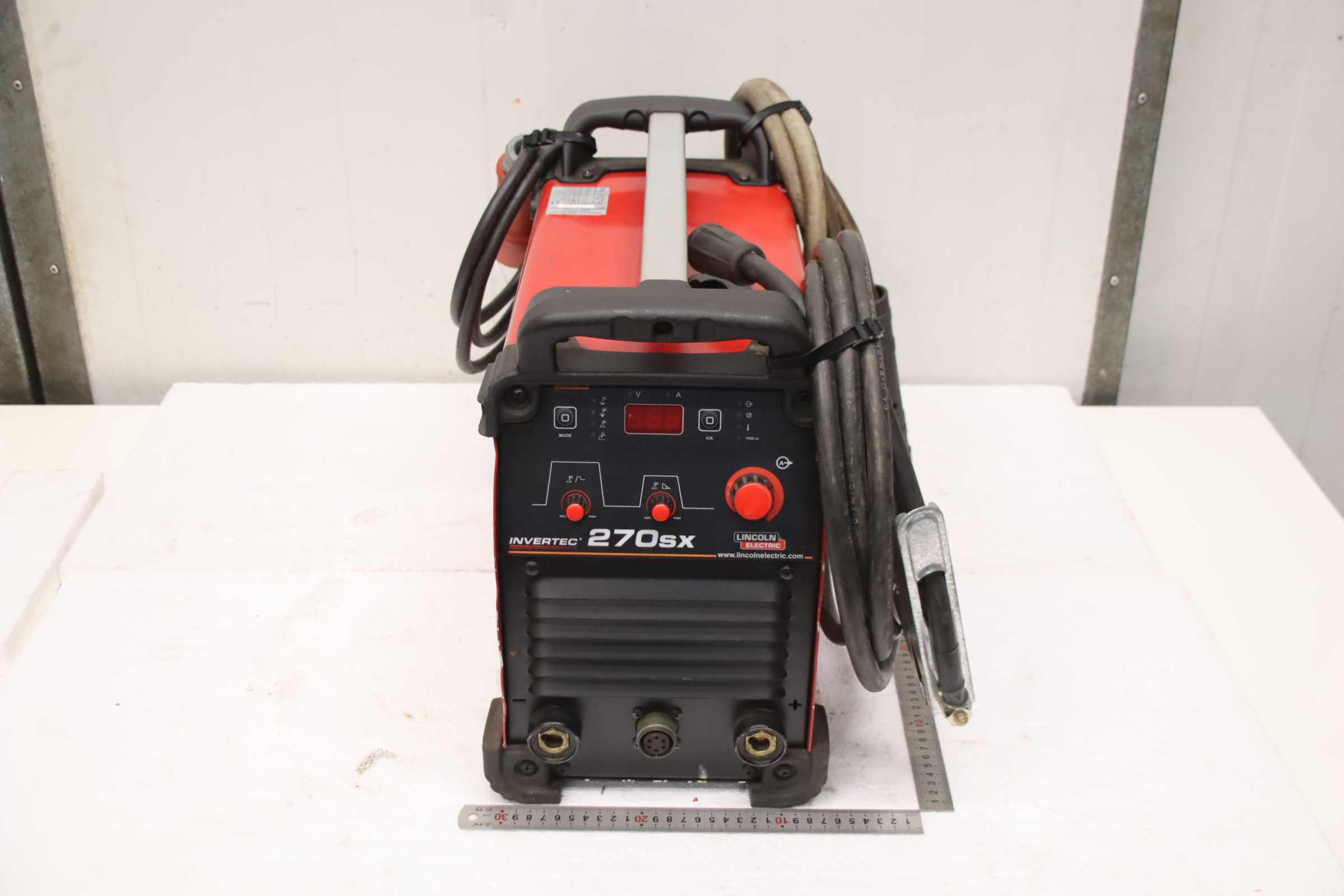 TIG welding machine, inverter welding machine, TIG welding machine, inverter welding machine -Manufacturer: Lincoln Electric, TIG welding machine, inverter welding machine type Invertec V270-SX -Welding power: max. 270 A -ground cable -Dimensions: 600/300/H390 mm -Weight: 31 kg