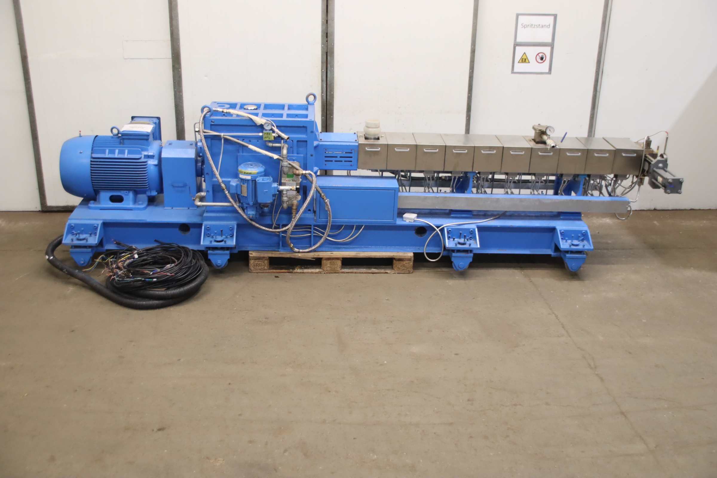 Extruder, co-rotating twin screw extruder, twin screw extruders, plastic injection molding machine -Engine power: 55 kW - Output: approx. 200 to 300 kg/h -Screw diameter: 51.7 mm -Speed: 60-400 rpm -Dimensions: 1250/4530/H1080 mm -Weight: 3000 kg