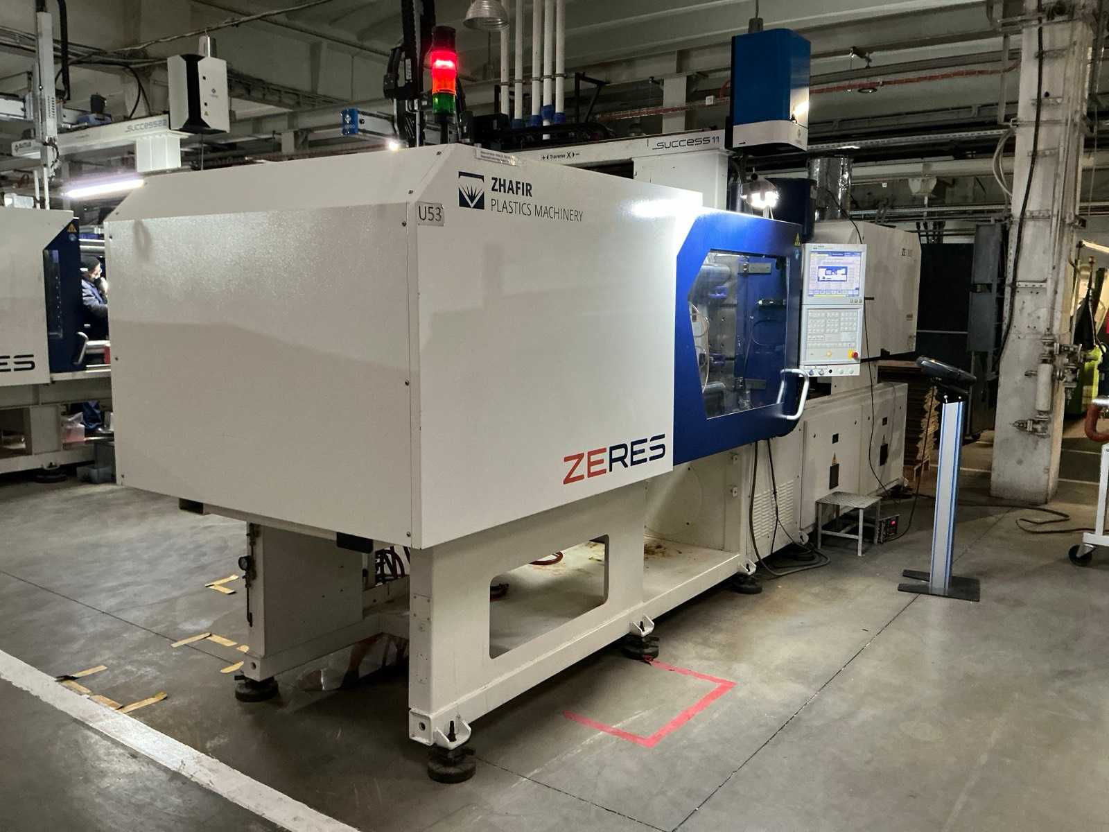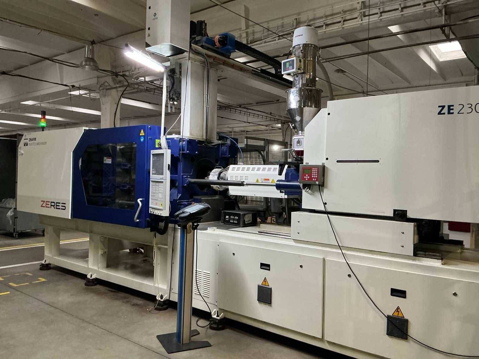 Injection Unit Screw Diameter: Ø 55 Injection Volume: approx. 517 cm³ Injection Pressure: up to 2,000 bar Injection Rate: approx. 220 cm³/s Plasticizing Capacity: approx. 35 g/s (PS) Screw L/D Ratio: 22:1 Nozzle Contact Force: 60 kN Clamping Unit Clamping Force: 2,300 kN (230 t) Clamping System: Zhafir Zeres all-electric toggle system Platen Size (H × V): approx. 850 × 800 mm Mould Opening Stroke: 470 mm Max. Daylight Opening: approx. 940 mm Min. Mould Height: 220 mm Ejector Stroke: 150 mm Ejector Force (fwd / back): 50 / 30 kN Drive & Control Drive Type: All-electric servo drive Installed Power: 47 kW Full Load Current: 79 A Short Circuit Current: 25 kA Power Supply: 400 V / 50 Hz / 3-phase Control System: Zhafir SIGMATEK HMI touchscreen control Equipment / Features Drive Concept: Fully electric servo system for high precision and energy efficiency Operation: Quiet opera ...