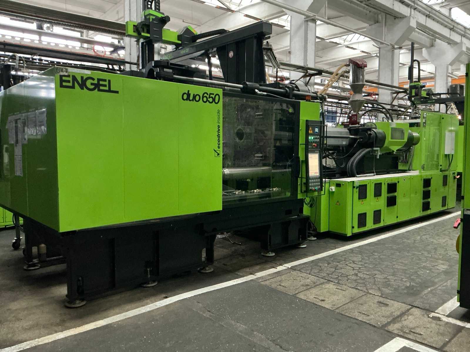 Injection Unit Screw Diameter: Ø 70 Injection Volume: approx. 1,540 cm³ Injection Pressure: up to 1,800 bar Injection Rate: approx. 500 cm³/s Plasticizing Capacity: approx. 95 g/s (PS) Nozzle Contact Force: 120 kN Clamping Unit Clamping Force: 6,500 kN (650 t) Clamping System: ENGEL Duo two-platen design Platen Size (H × V): approx. 1,600 × 1,500 mm Mould Opening Stroke: 900 mm Max. Daylight Opening: approx. 1,600 mm Min. Mould Height: 450 mm Ejector Stroke: 250 mm Ejector Force (fwd / back): 110 / 70 kN Drive & Control Drive Type: Servo-hydraulic (ecodrive inside) Hydraulic System Pressure: up to 160 bar Pump Motor Power: 45 kW Total Installed Power: approx. 65 kW Power Supply: 400 V / 50 Hz / 3-phase Control System: ENGEL CC300 touchscreen control Equipment / Features Clamping System: Two-platen design for compact footprint and high stability Energy Efficiency: Servo-hy ...