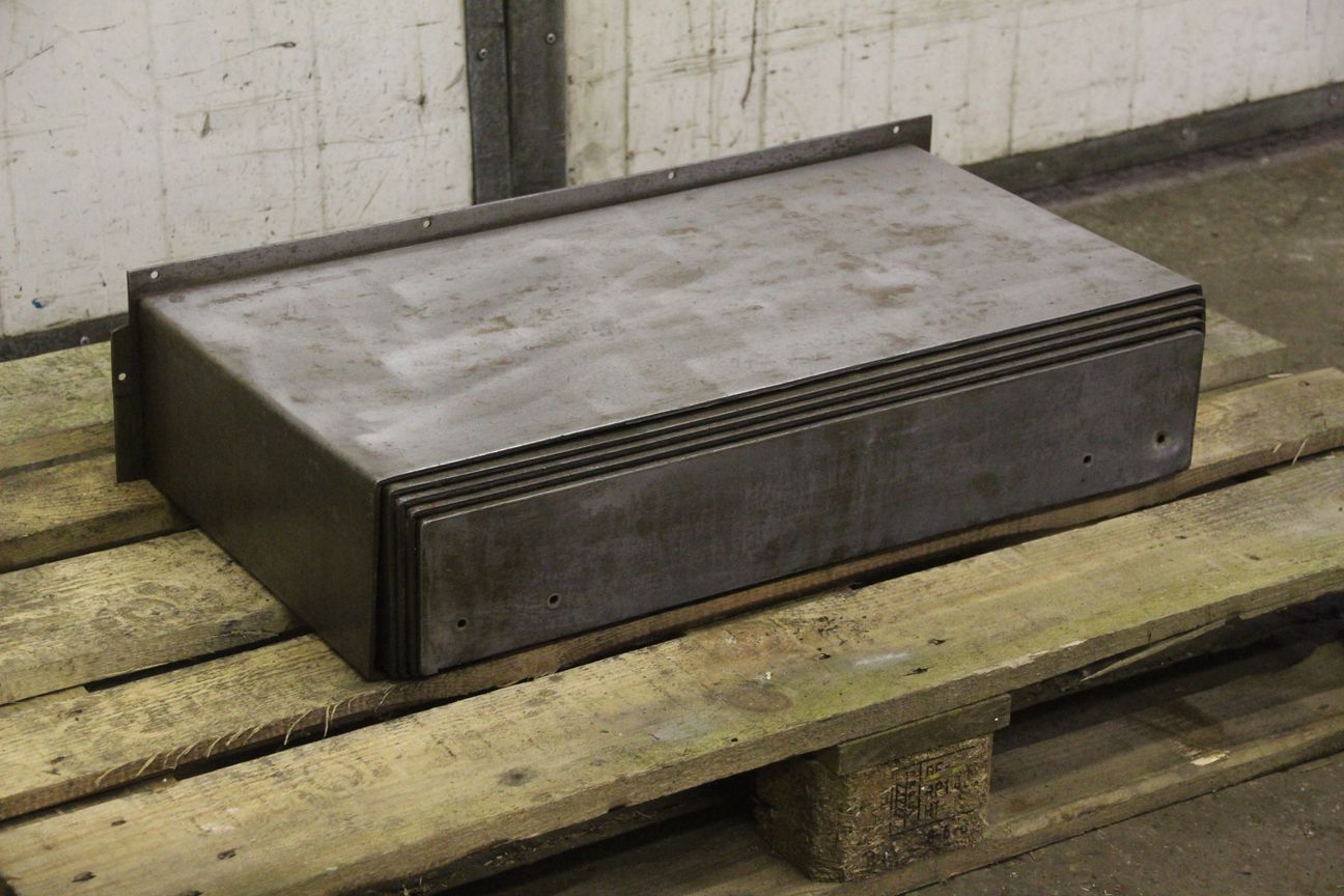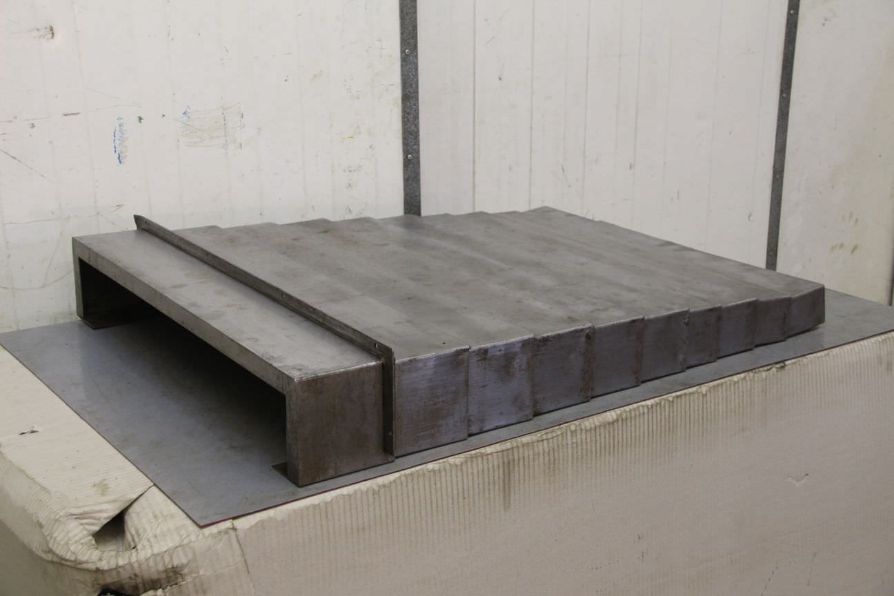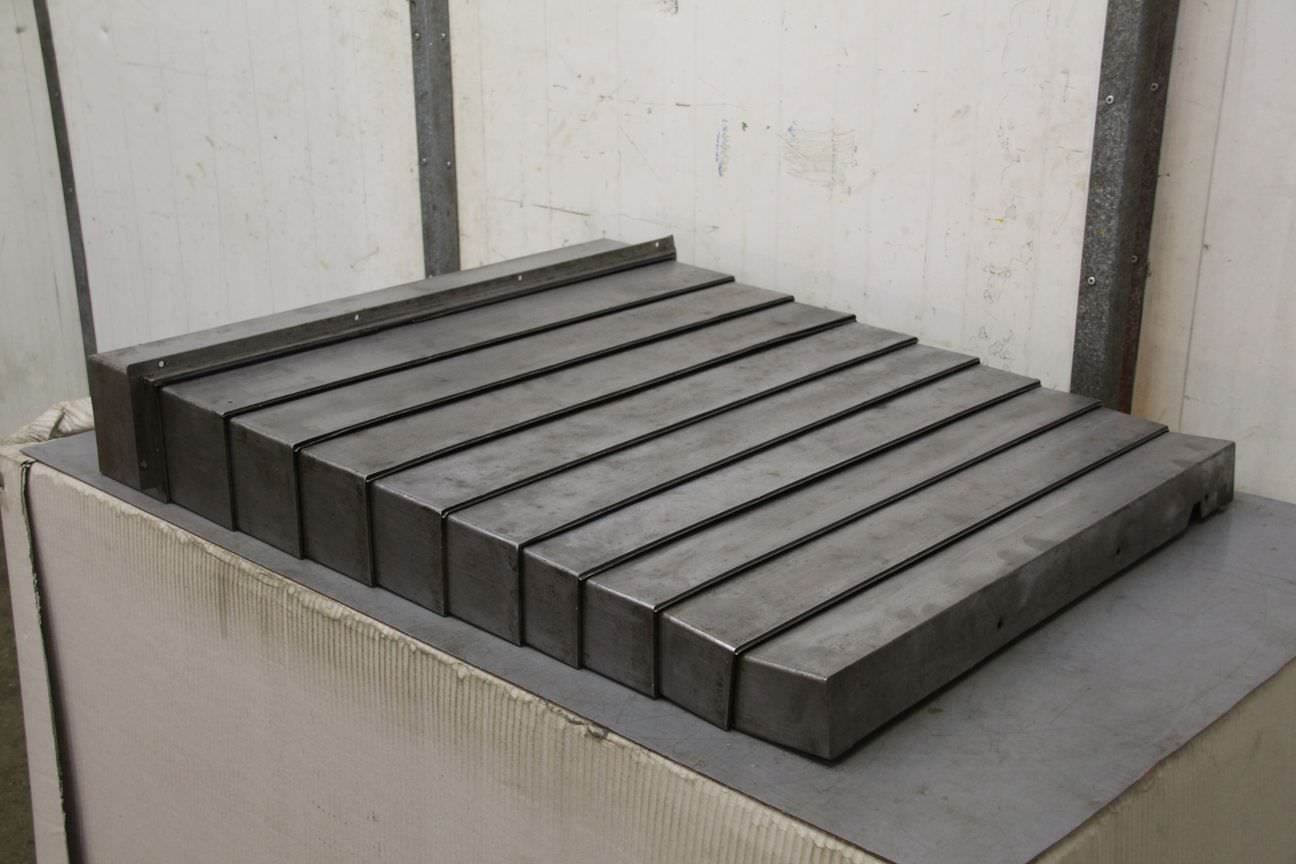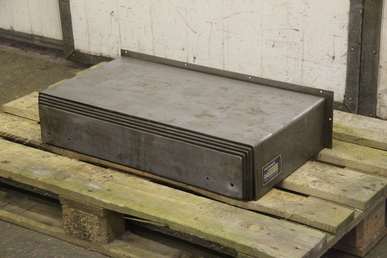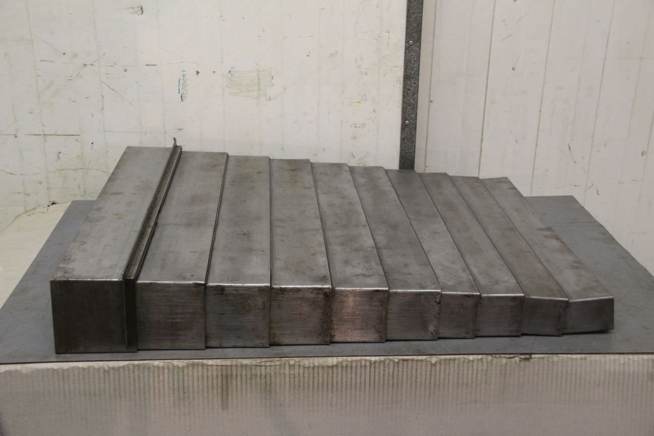 Lamellar aprons, samurai aprons, machine protection, protective cover, bellows, protective cover system, protection system, guide protection,-Cover comes: from a WMW boring mill-for guide inside dimensions: 100 x 725 mm-Extractable: mm-Dimensions: 950/820/H150 mm-Weight: 30 kg