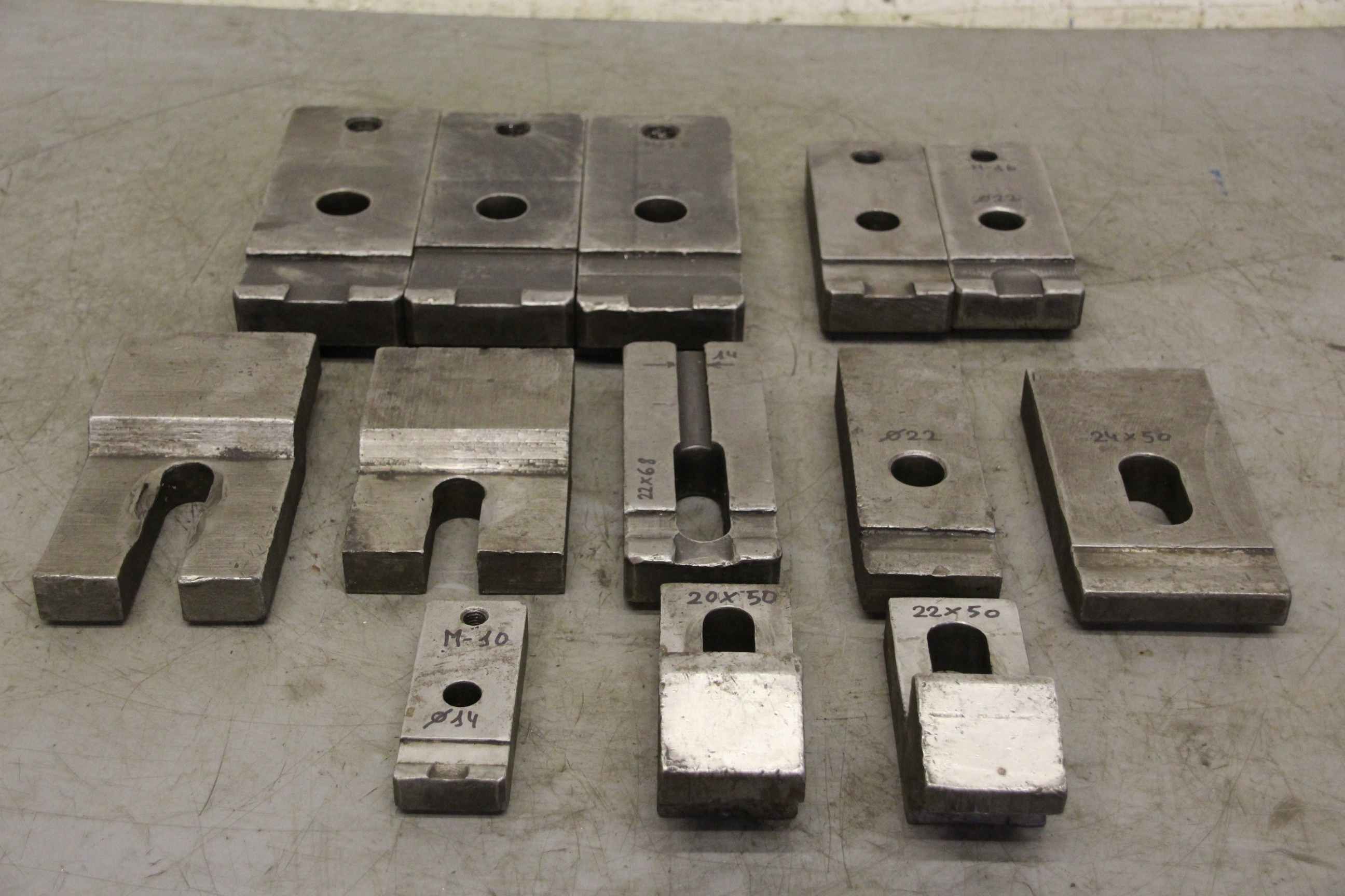 Clamping devices, clamping claws, deep clamping jaws, clamping pads, clamping tools, step claws, low clamps, clamping irons, accessories-Tensioning tool: clamping bracket, various designs-Norm: according to TGL30--Bores: Ø 14/20/22/24/26 mm-Thread sizes: M10 / M16 / M20-Dimensions: Individual part pictures with dimensions can be sent-Price / fee: complete-Weight: 32 kg