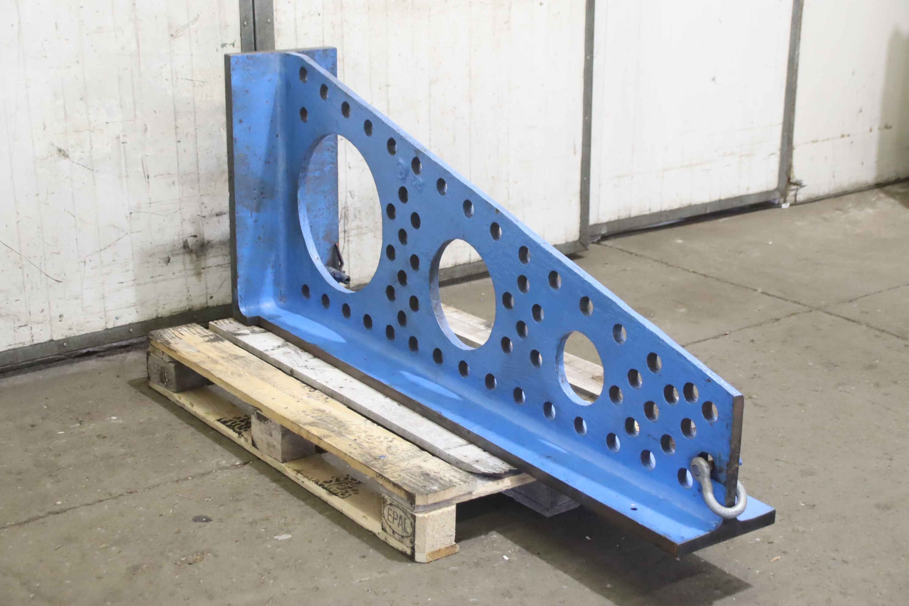 Clamping table, clamping angle, T-slot table, rotary table, milling machine table -Clamping angle: for workpiece clamping, with air connection for easy movement (air cushion) -Support surface: 1645 x 250 / 695 x 310 mm -Wall thickness: 30/35 mm -Dimensions: 1645/310/H695 mm -Weight: 239kg
