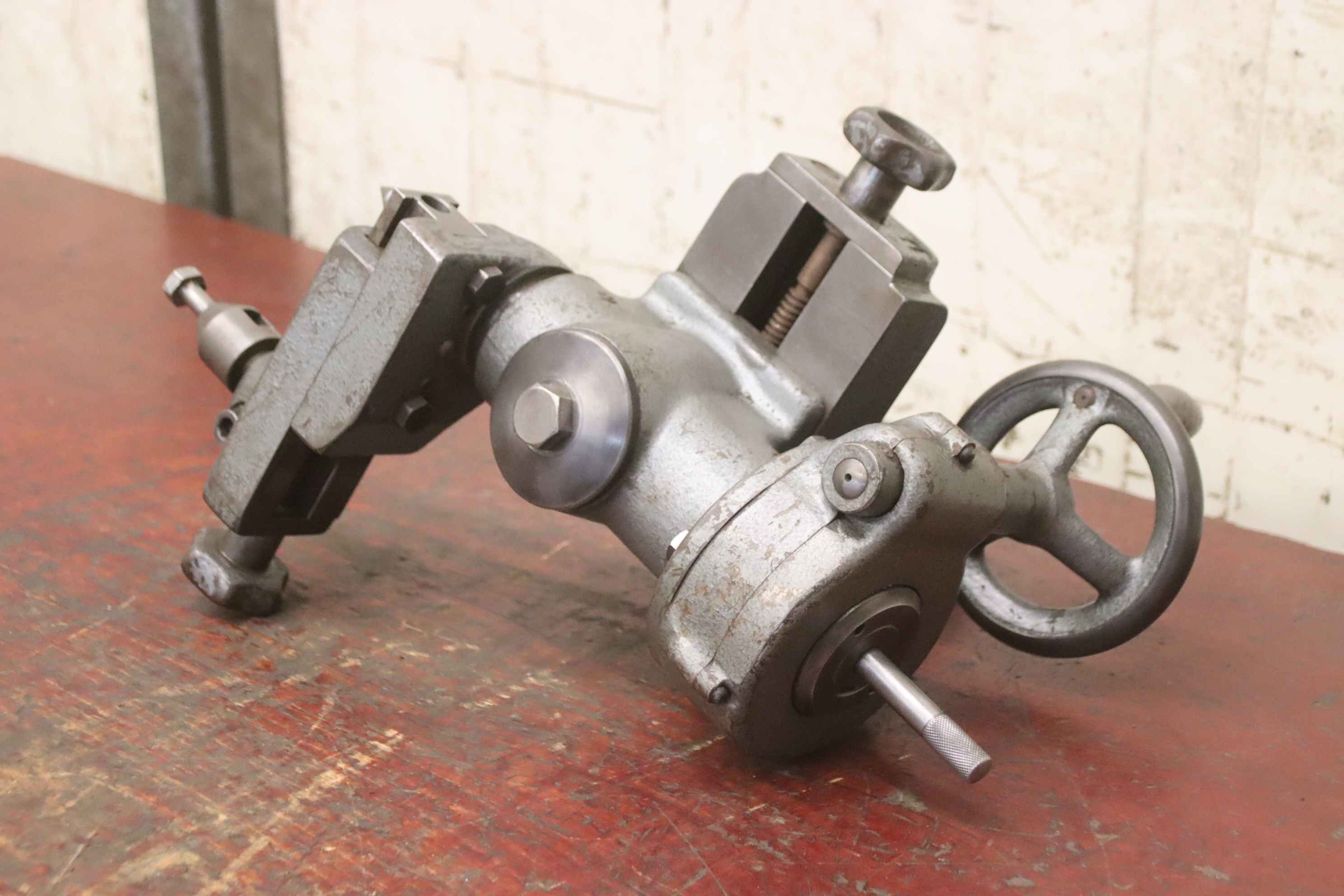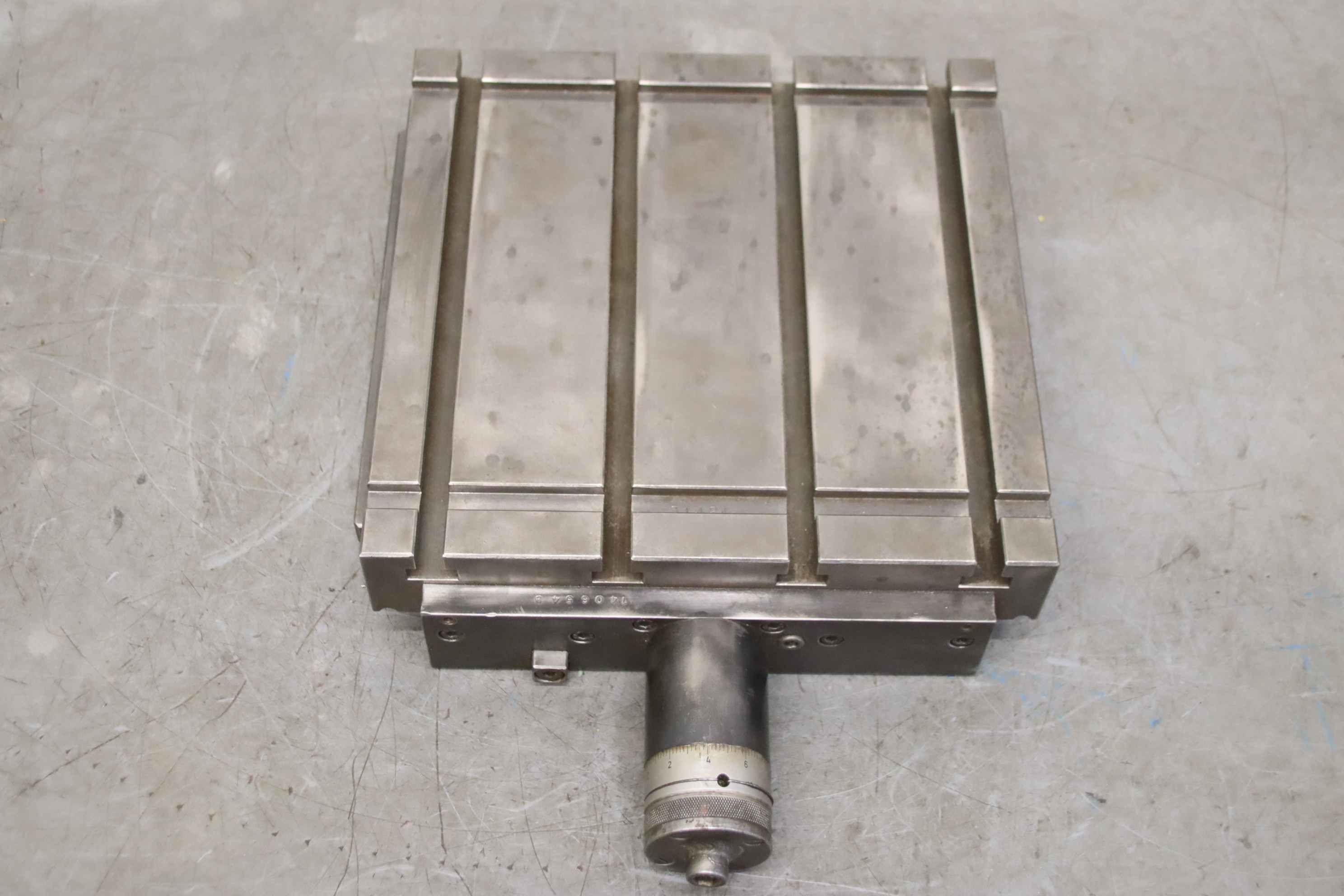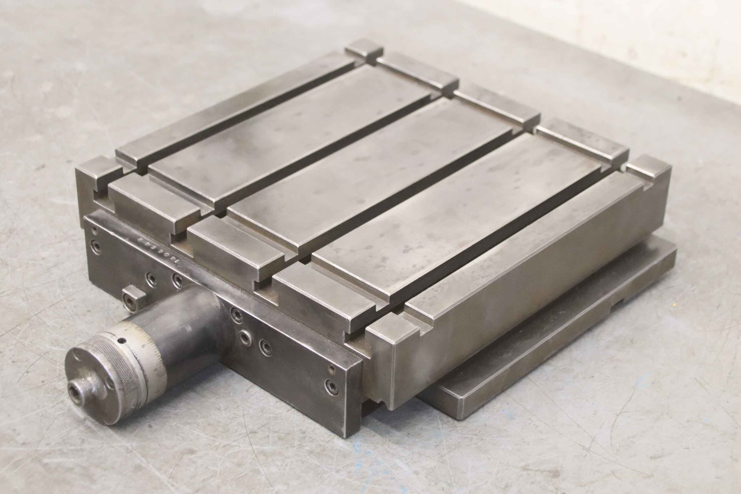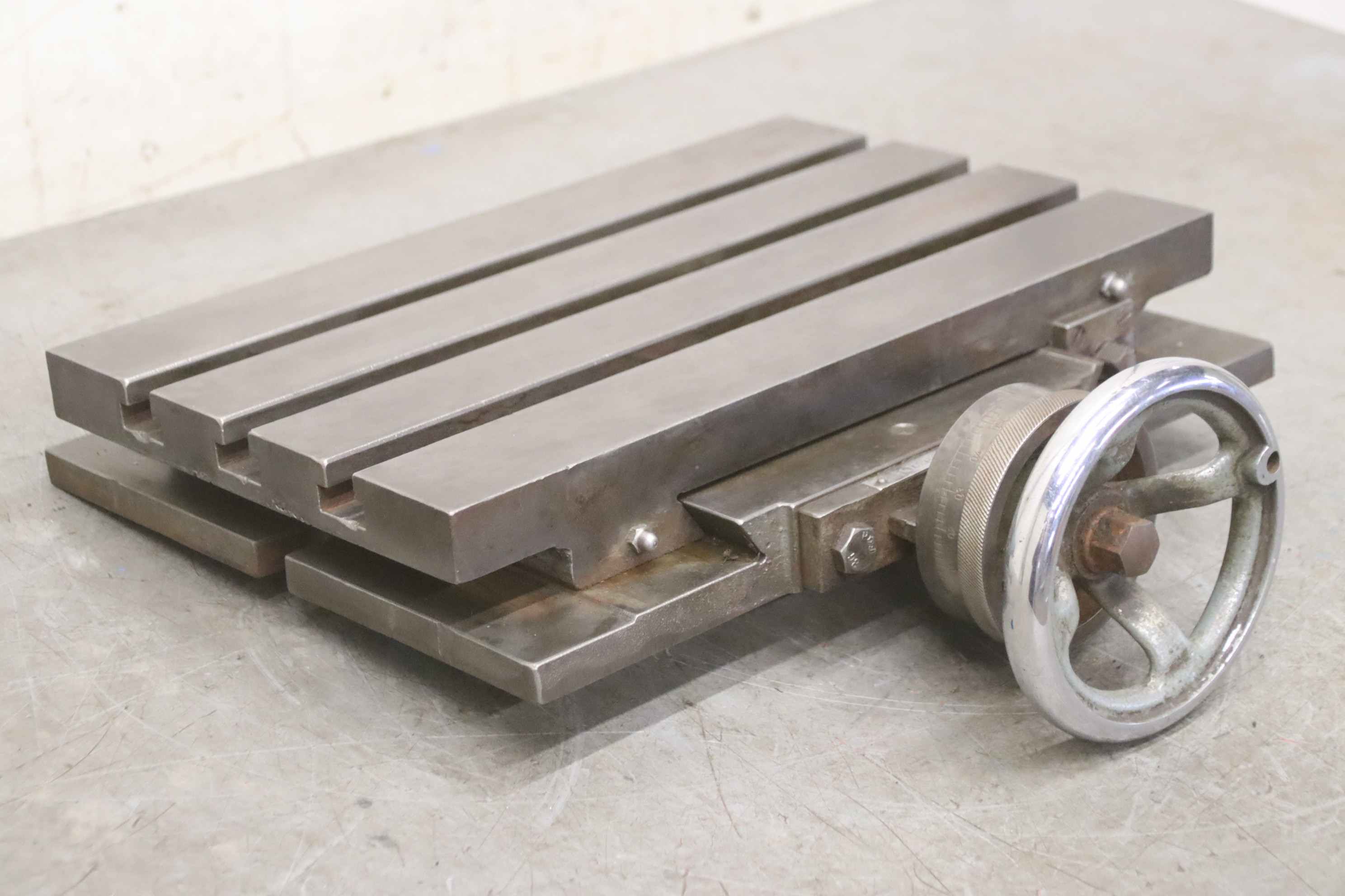 Clamping table, clamping angle, T-slot table, rotary table, milling machine table-Clamping table: milling machine table T-slot table-Table surface: 300 x 300 mm-Y-axis: 50 mm movable, rotary wheel with fine adjustment, see photos-T grooves: groove width 12 mm, groove spacing 80 mm-Total dimensions: 420/330/H90 mm-Weight: 48 kg