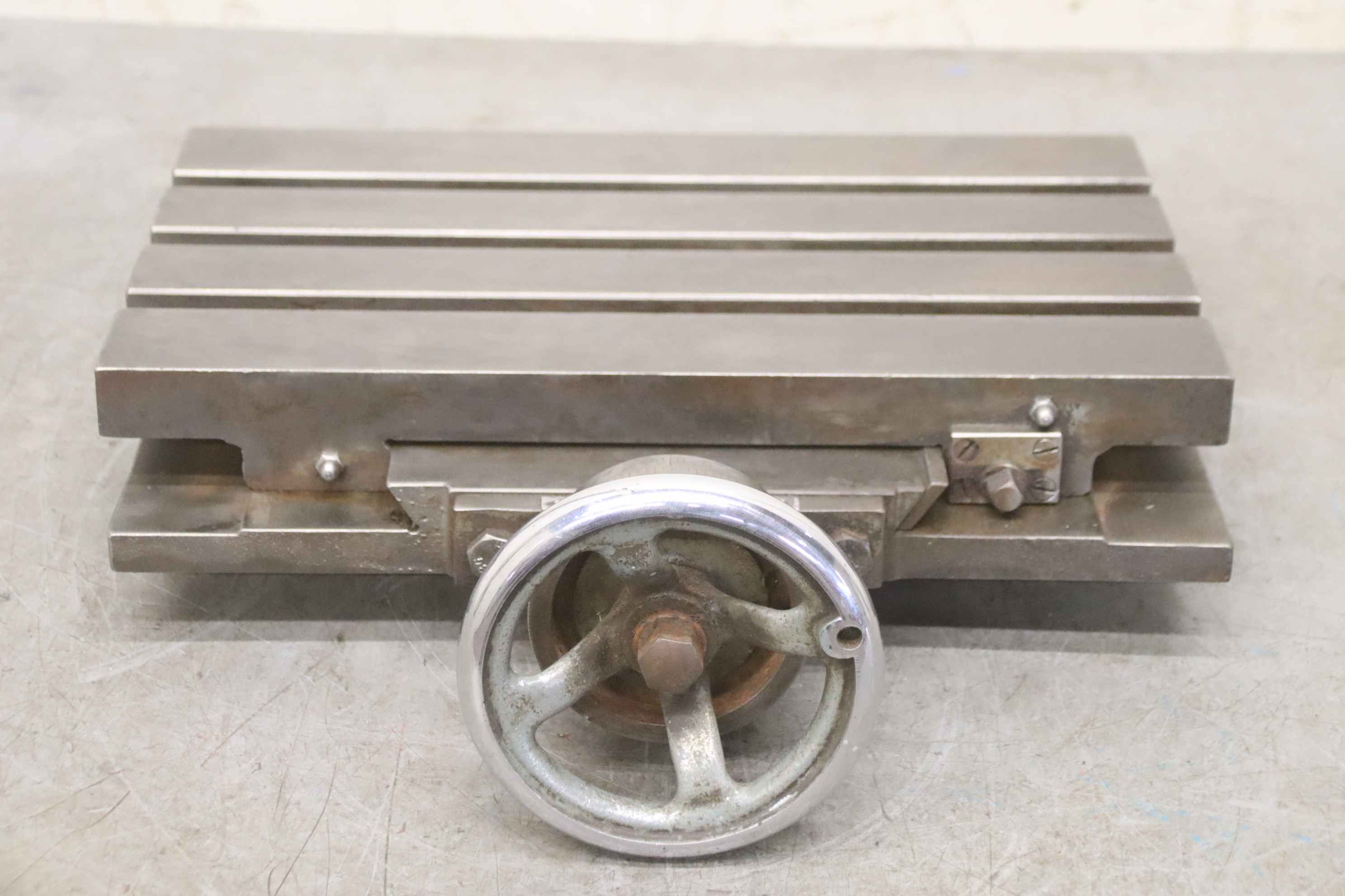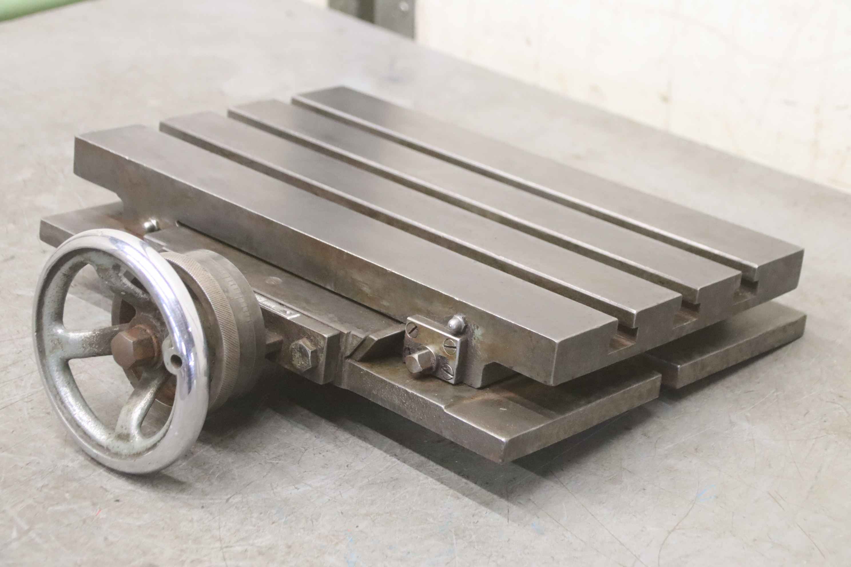 Clamping table, clamping angle, T-slot table, rotary table, milling machine table-Clamping table: milling machine table T-slot table-Table surface: 400 x 250 mm-Y-axis: 95 mm movable, hand crank with fine adjustment, see photos-T grooves: groove width 16 mm, groove spacing 63 mm-Total dimensions: 455/400/H140 mm-Weight: 40 kg