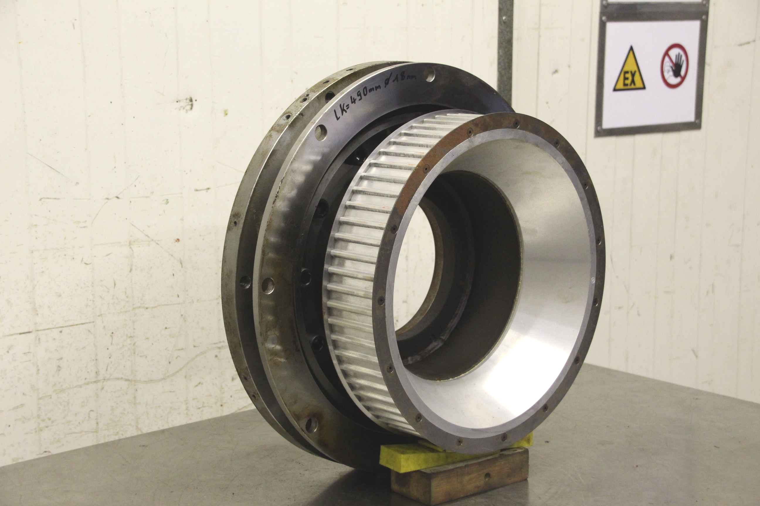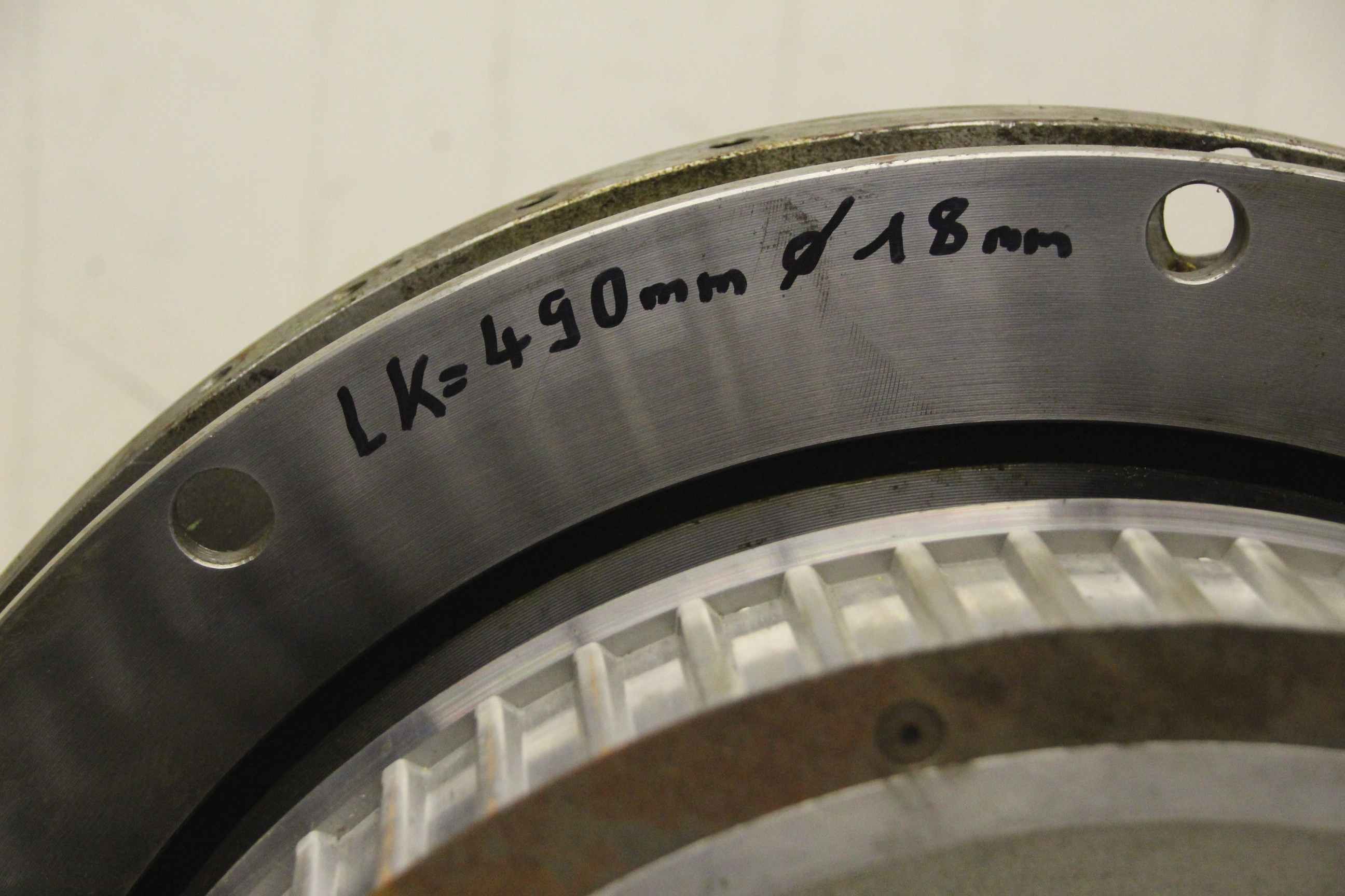 Timing belt pulley, slewing ring, -Slewing ring: with toothed belt pulley -Slewing ring: Ø 520 mm -Pulley: Ø approx. 370 mm -Belt width: 80 mm -Mounting: Bolt circle Ø 490 mm Ø 18 / M16 -Dimensions: see photos -Overall dimensions: Ø 520 x 200 mm -Weight: 79 kg