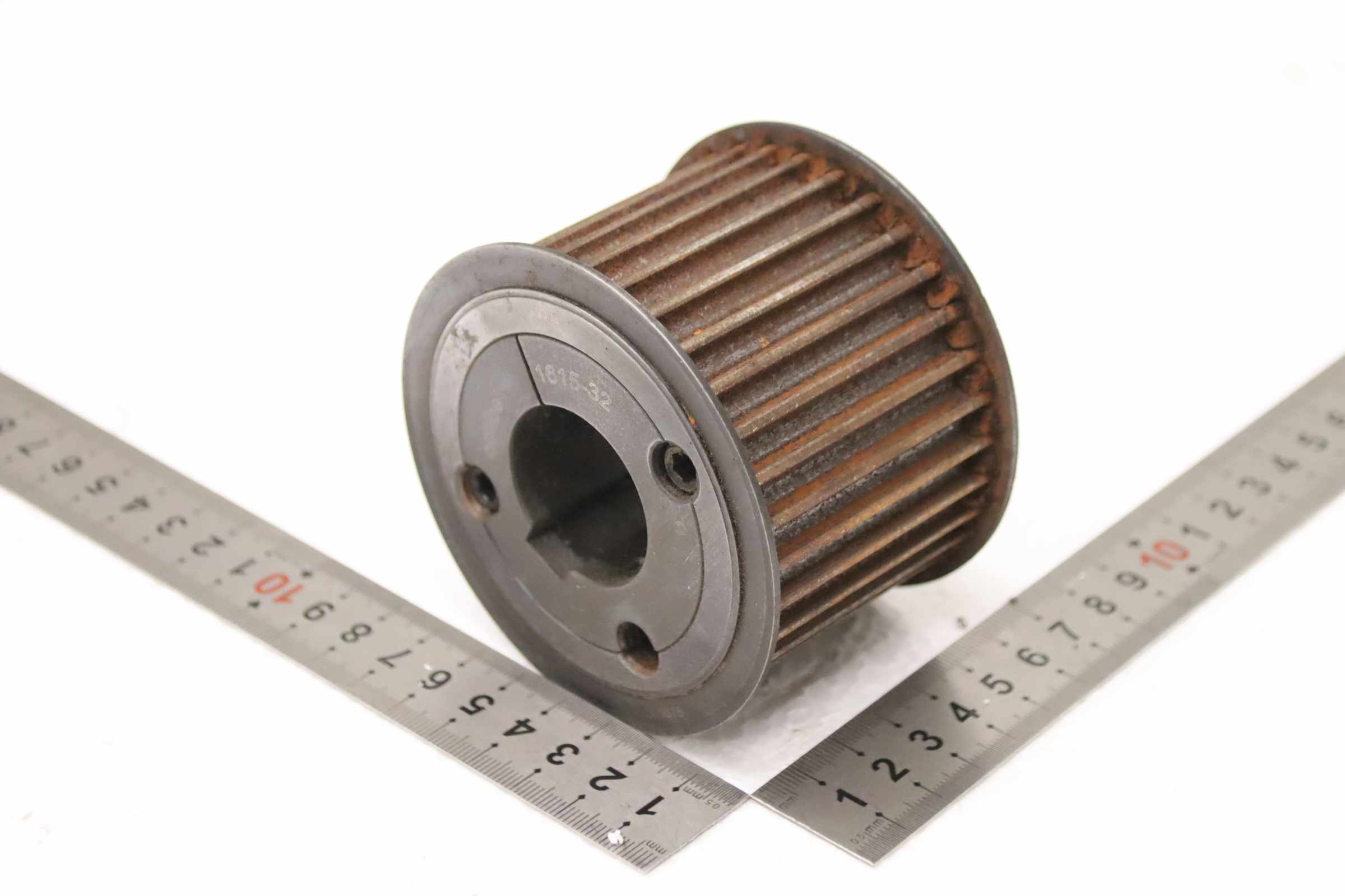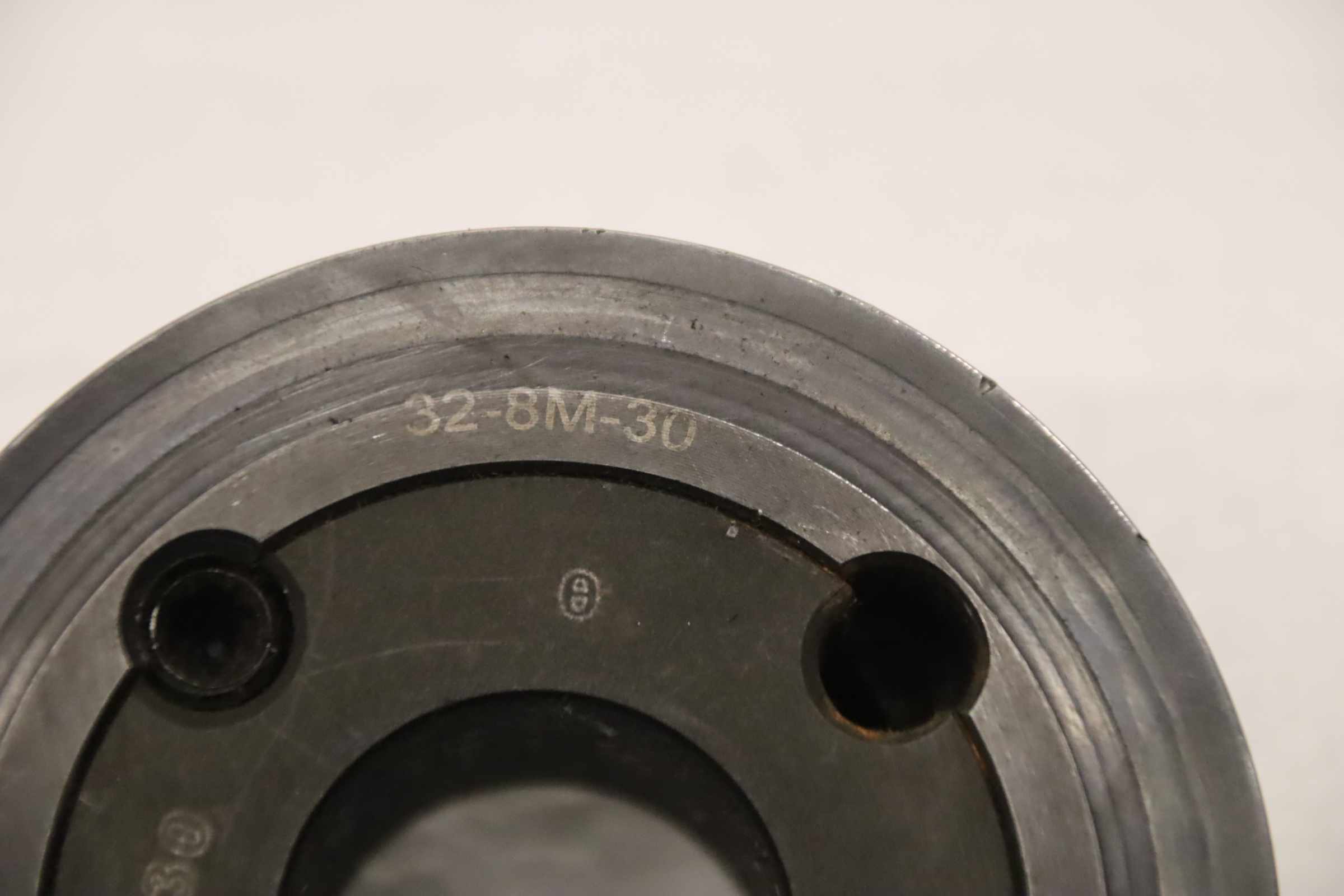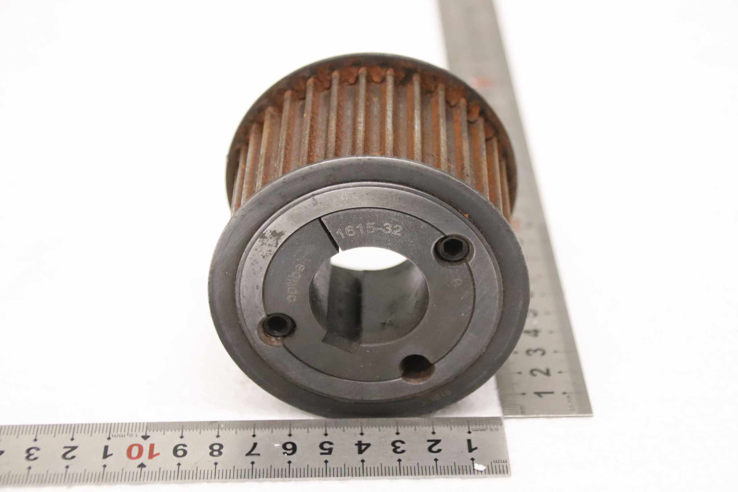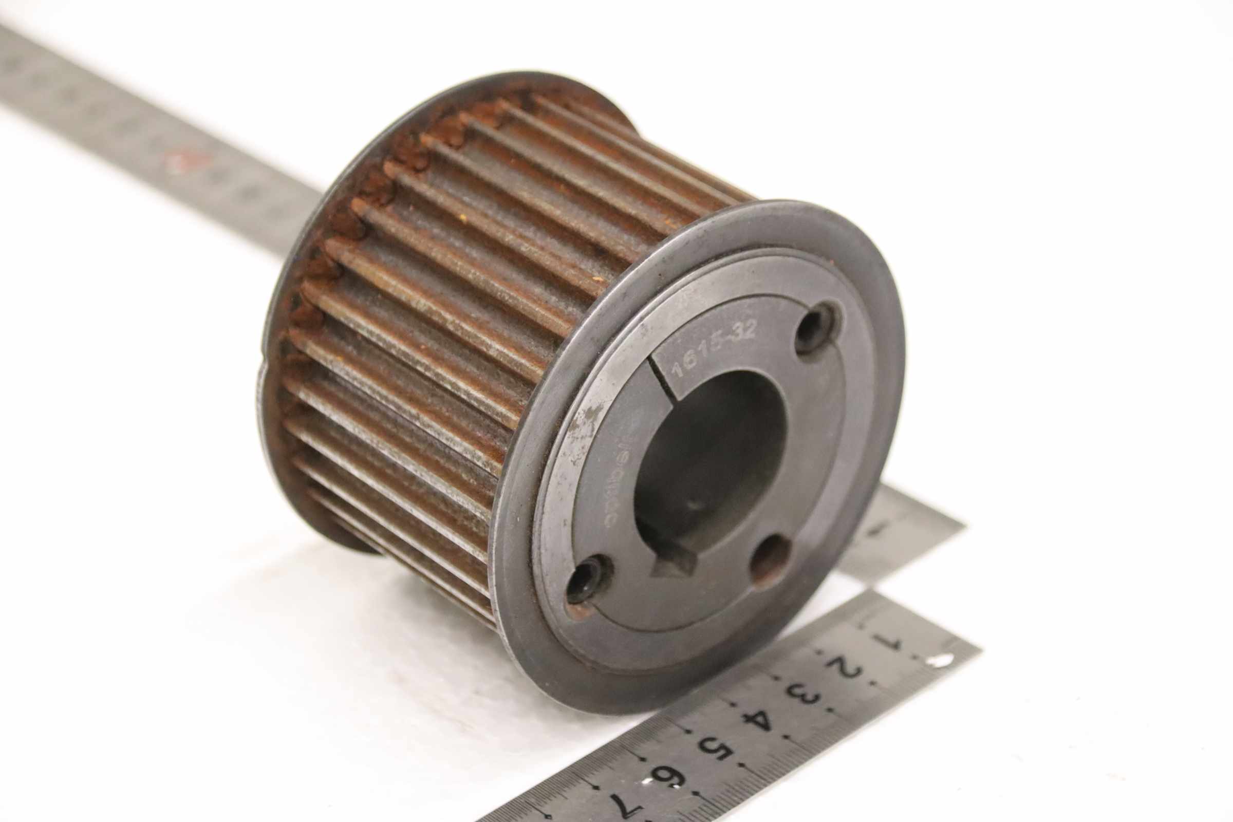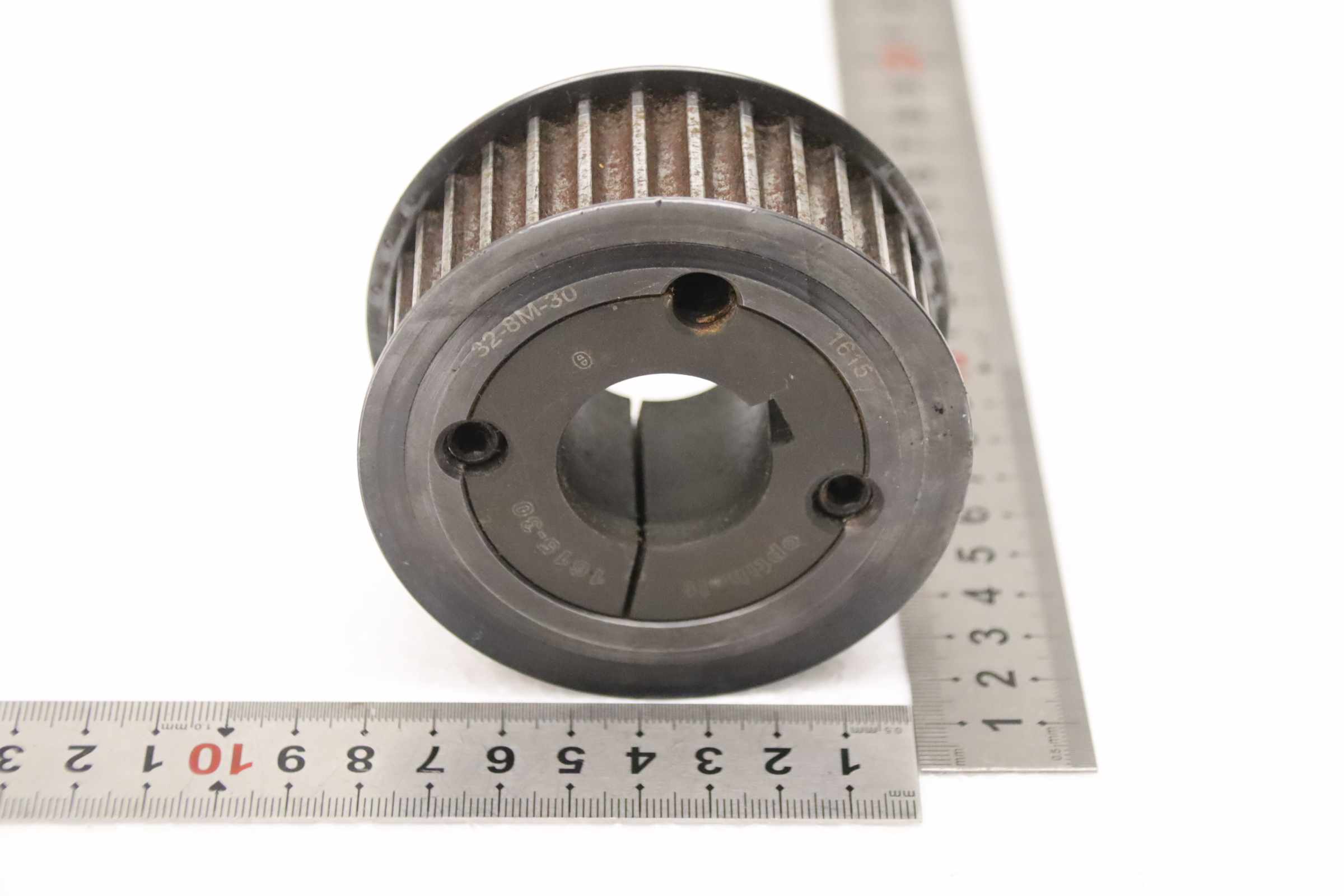 Flat belt pulley, toothed pulley, multi-belt pulley, timing belt pulley -Timing belt pulley: Ø 87 mm -Type: 32-8M-50 -Number of teeth: 32 teeth / Belt width: 50 mm -Mount: Taper clamping bushing: optibelt 1615-30 Ø 32 x 38 mm -Quantity: 1x timing belt pulley included -Dimensions: Ø 87 x 60 mm -Weight: 1.3 kg