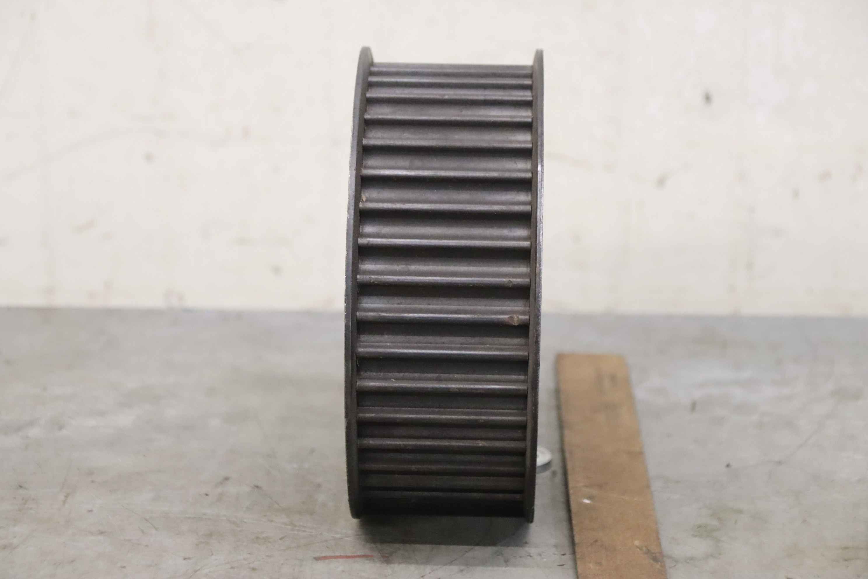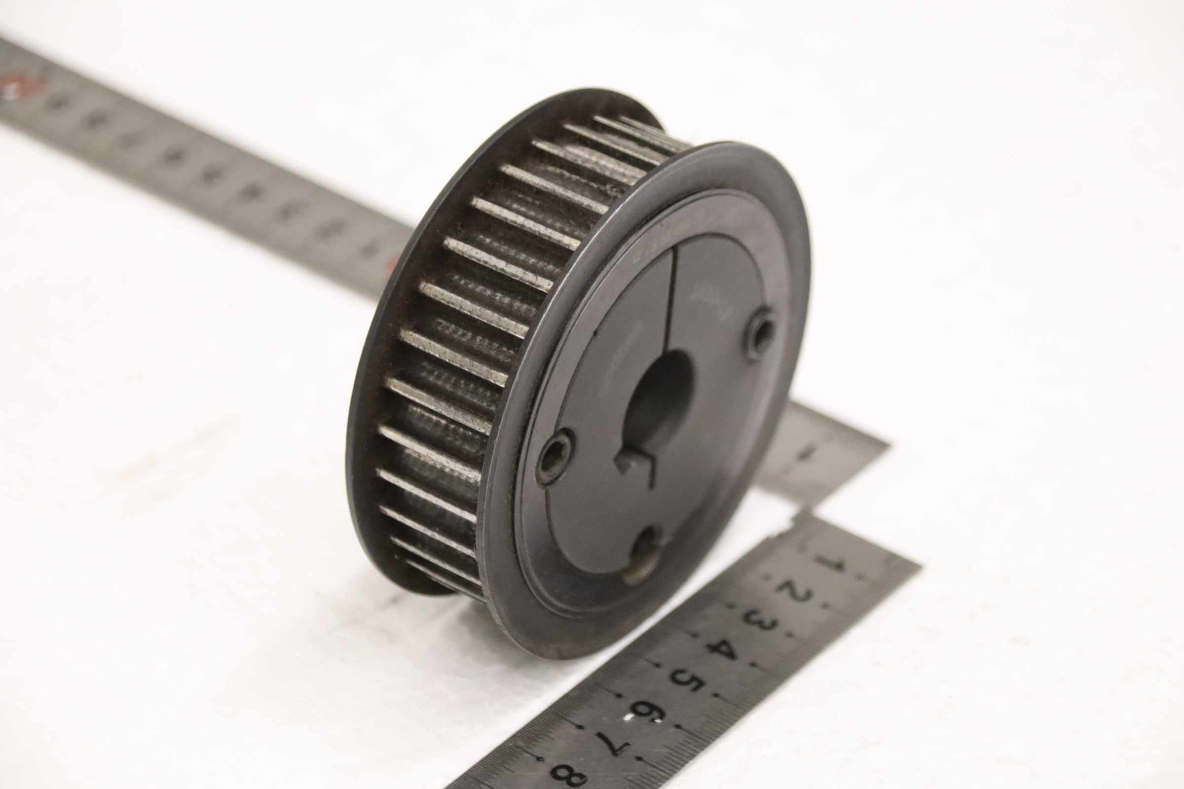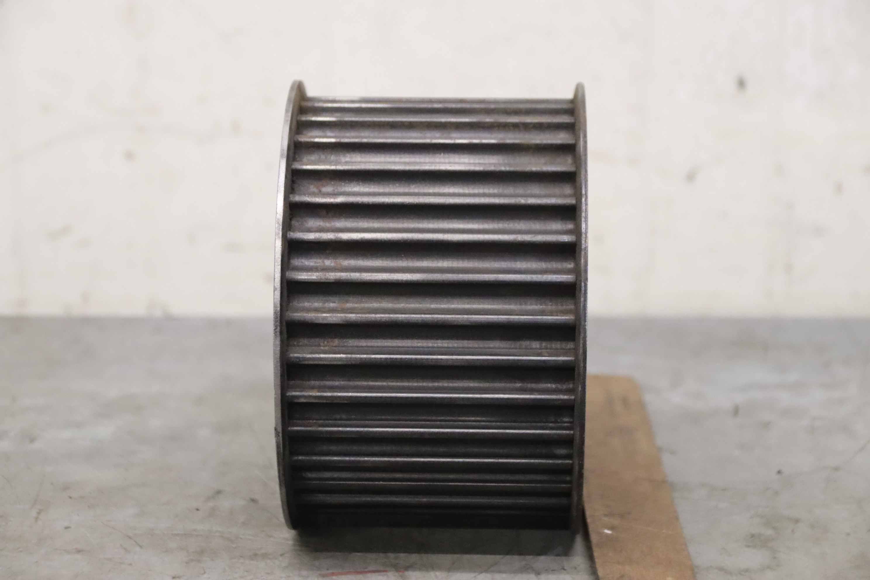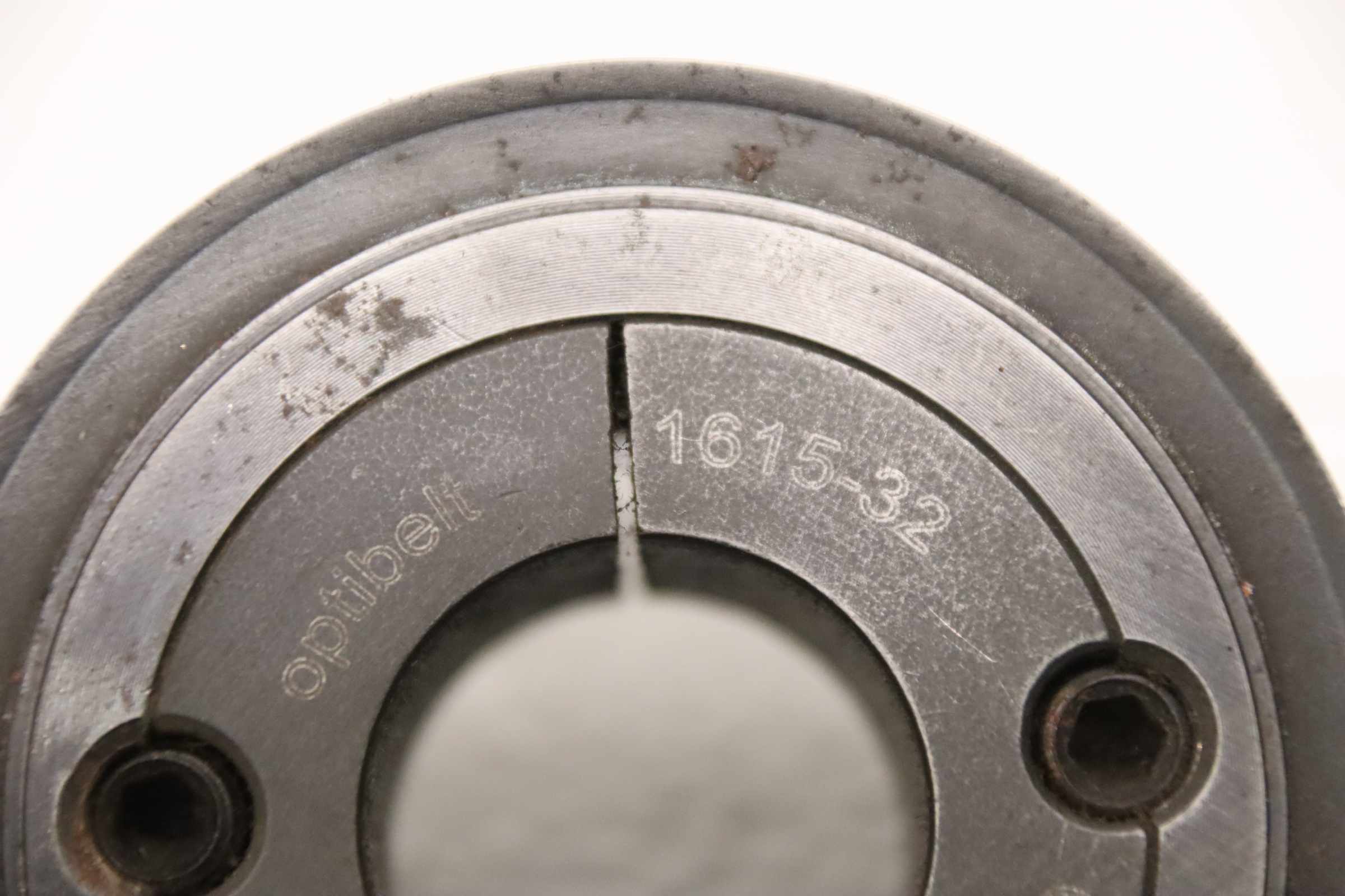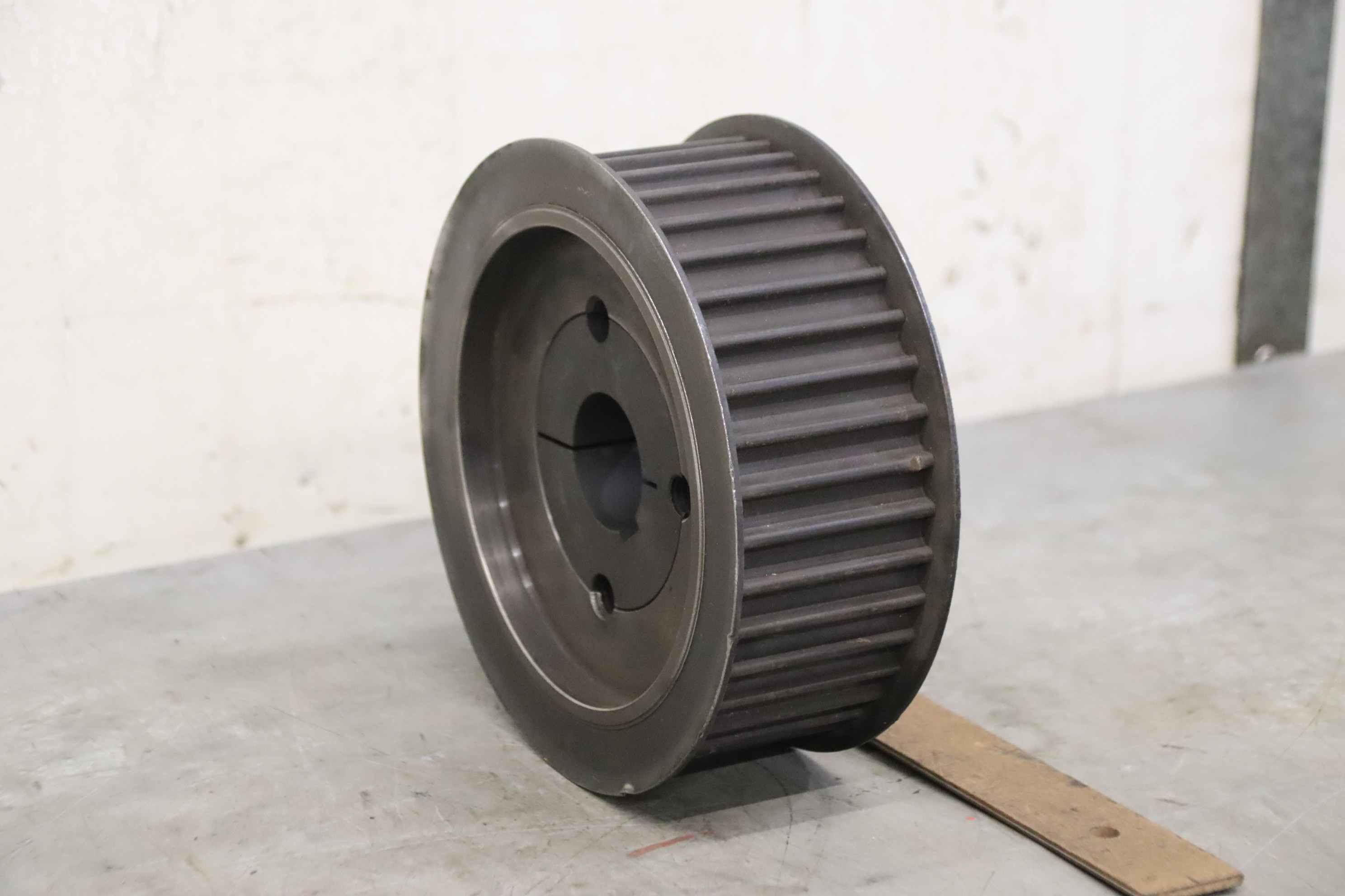 Flat belt pulley, toothed pulley, multi-belt pulley, timing belt pulley -Timing belt pulley: Ø 87 mm -Type: 32-8M-50 -Number of teeth: 32 teeth / Belt width: 50 mm -Mount: Taper clamping bushing: optibelt 1615-30 Ø 32 x 38 mm -Quantity: 1x timing belt pulley included -Dimensions: Ø 87 x 60 mm -Weight: 1.3 kg