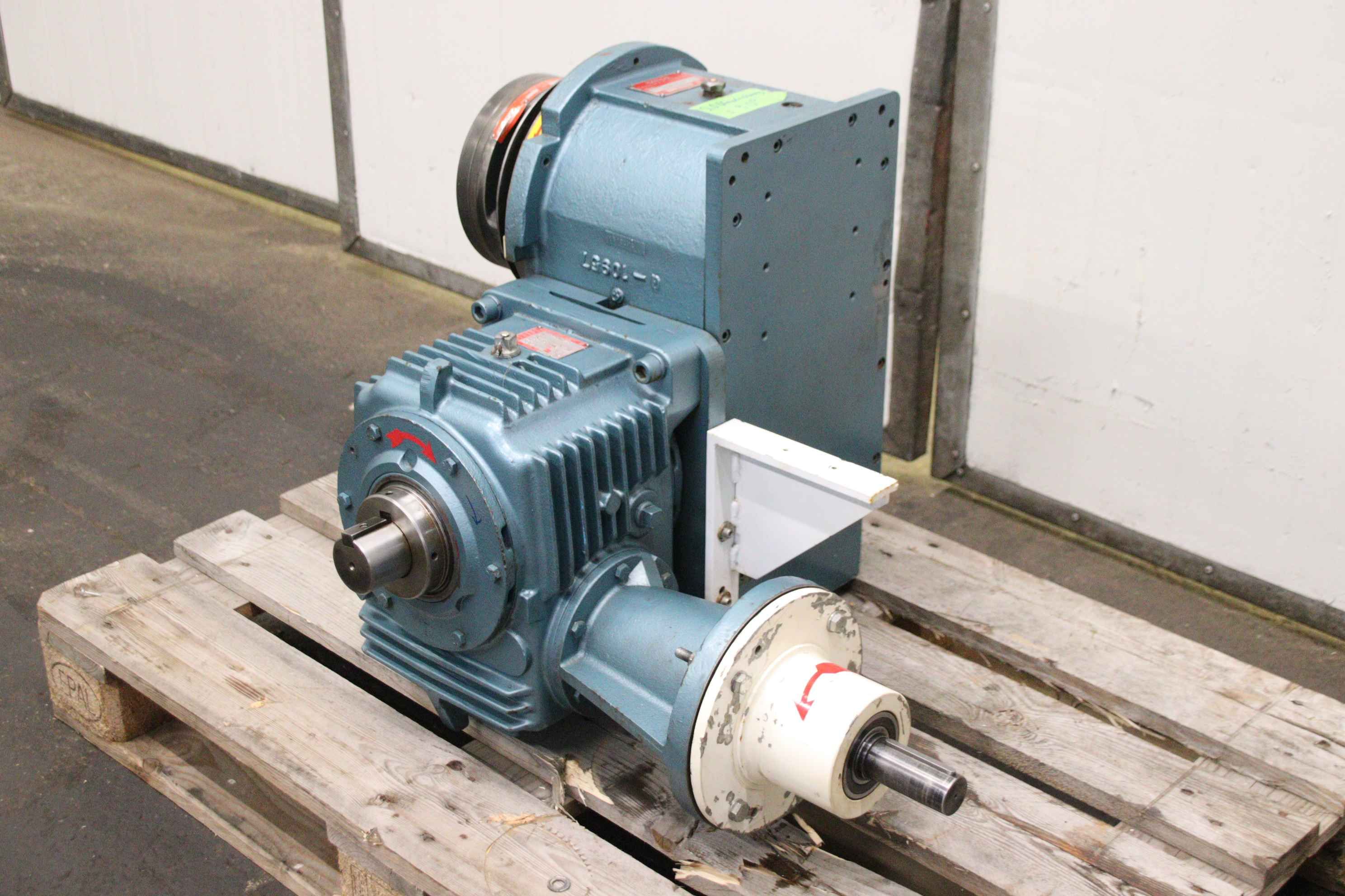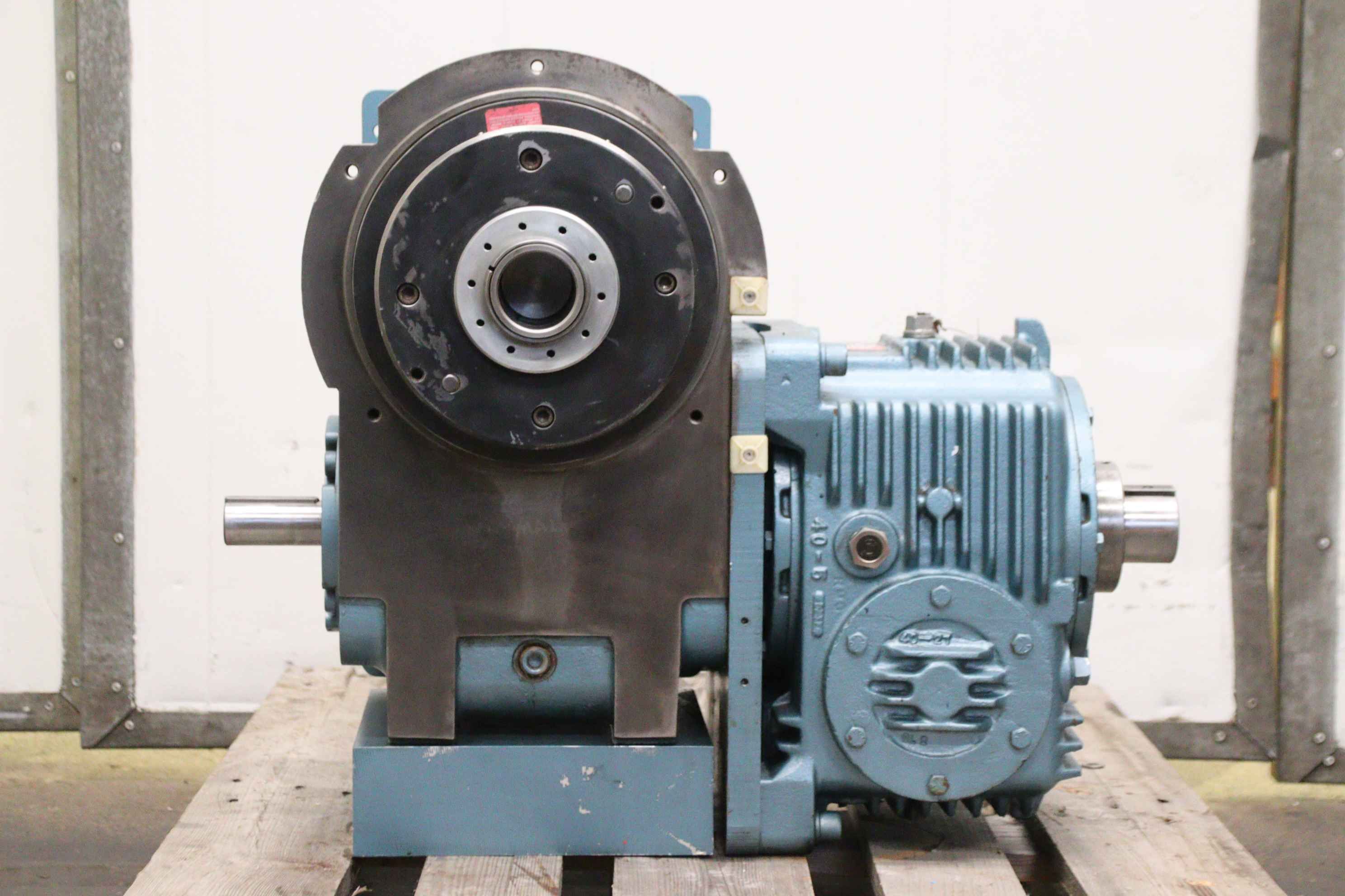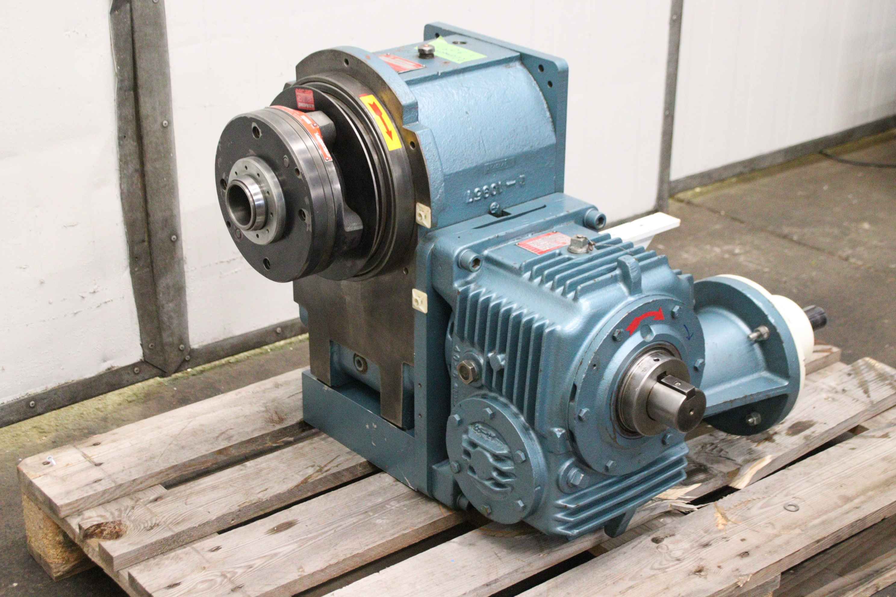Globoid gear, indexing, oscillator indexer, index gear, rotary index drive-Manufacturer: CAMCO, index gear-Type: MSHV40A917-Y7A-Overload clutch: 11FC-SD-Shaft: Ø 55x45 / 35x80 / 35x75 mm-Translation: 20 rev. = 90°-Dimensions: 815/720/H585 mm-Weight: 327 kg