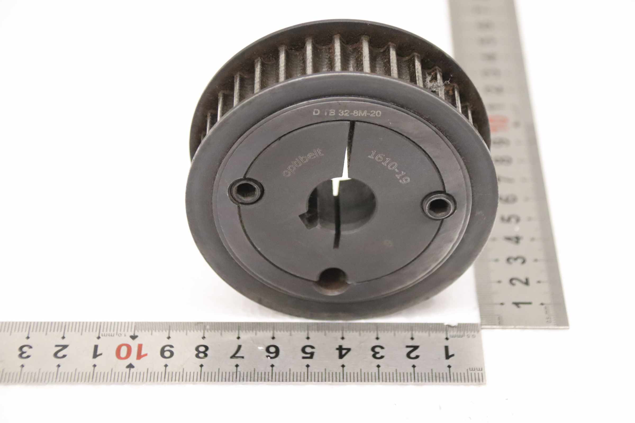 Flat belt pulley, toothed pulley, multi-belt pulley, timing belt pulley -Timing belt pulley: Ø 192 mm -Type: D TB 32-8M-20 -Material: Steel -Number of teeth: 32 teeth / Belt width: 20 mm -Mount: Optibelt 1610-19 taper clamping bushing Ø 19 x 28 mm -Quantity: 2x timing belt pulleys available -Price: per piece -Dimensions: Ø 87 x 28 mm -Weight: 0.8 kg/pc.