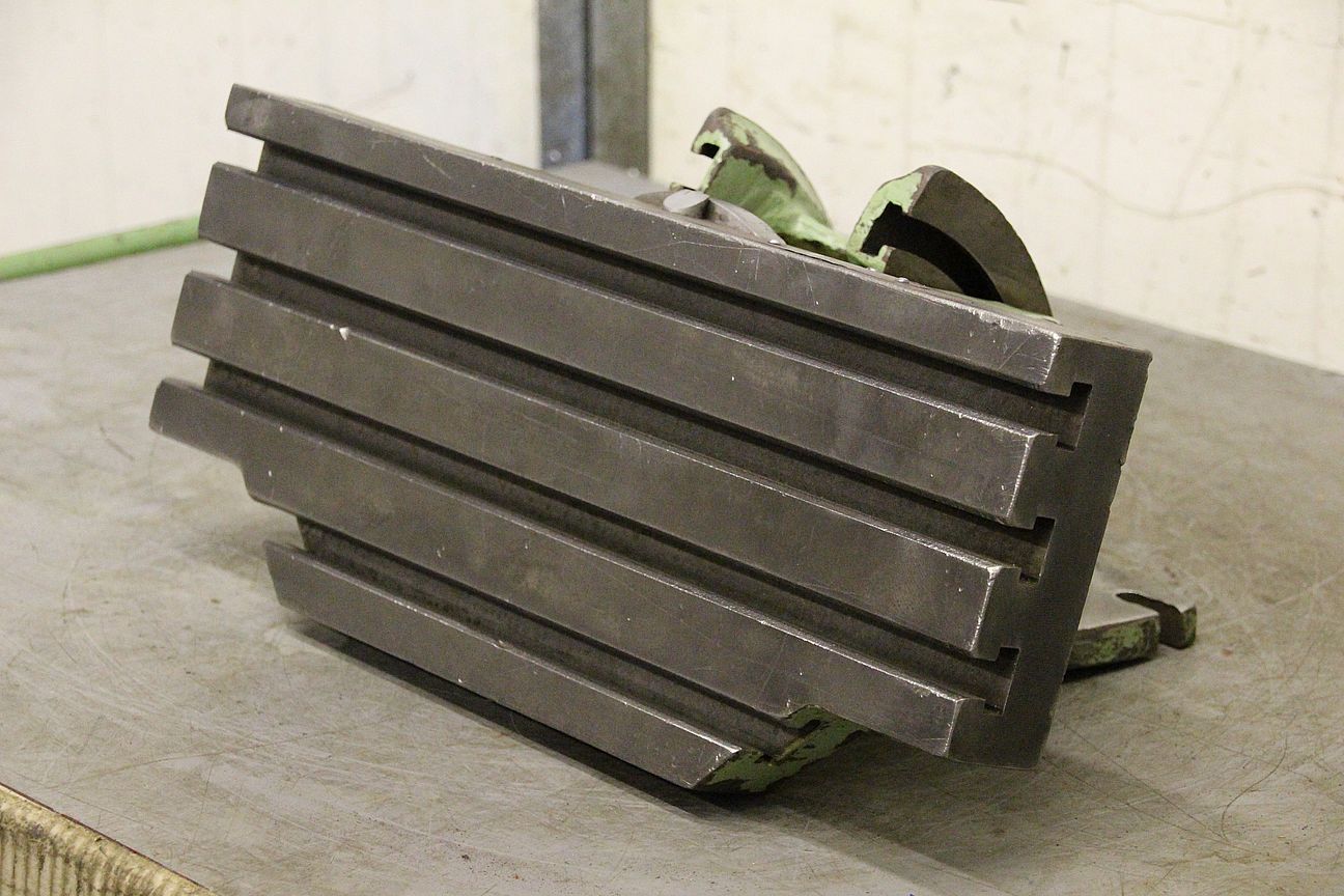 Clamping table, clamping angle, T-slot table, rotary table, milling machine table -Clamping angle: for workpiece clamping -Clamping surface: 1667 x 1300 mm -Wall thickness: 45 mm -T slots: slot width 18 mm -Dimensions: see photos -Dimensions: 1667/1000/H1400 mm -Weight: 1548 kg