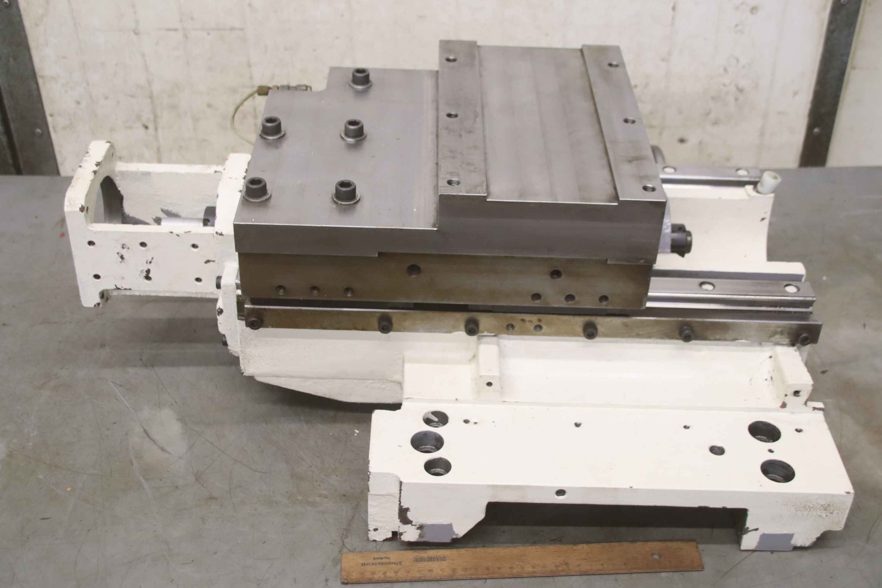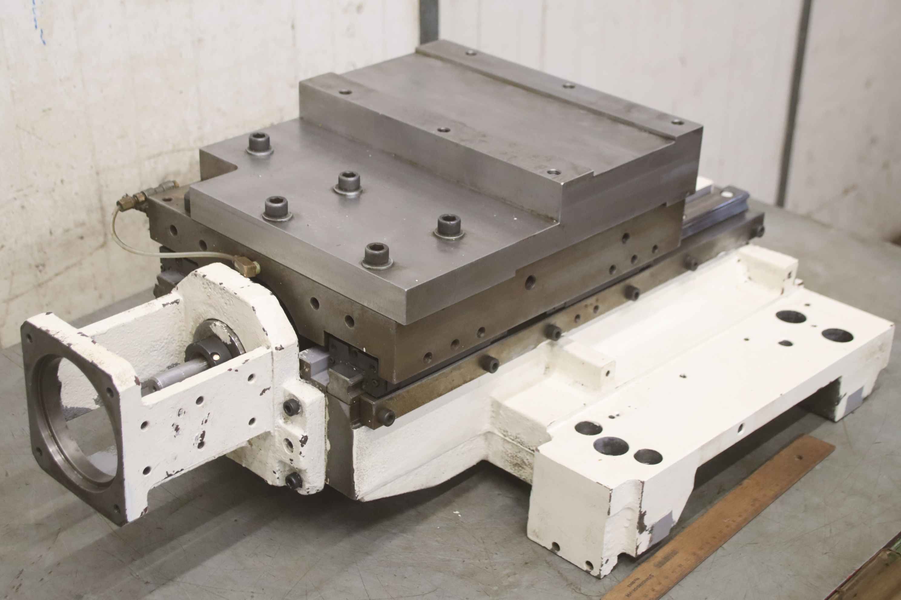 Clamping plate with threaded hole and cross table, clamping angle, T-slot table, rotary table, milling machine table, upper support, top slide, dovetail guide, tool slide, cross table, cross support -Manufacturer: Santenberg, clamping table: milling machine table from CNC machining center GTC S 2 -Linear guide: THK YNA419 -Shaft: Ø 20 x 45 mm -Dimensions: see photos -Total dimensions: 715/530/H285 mm -Weight: 222kg