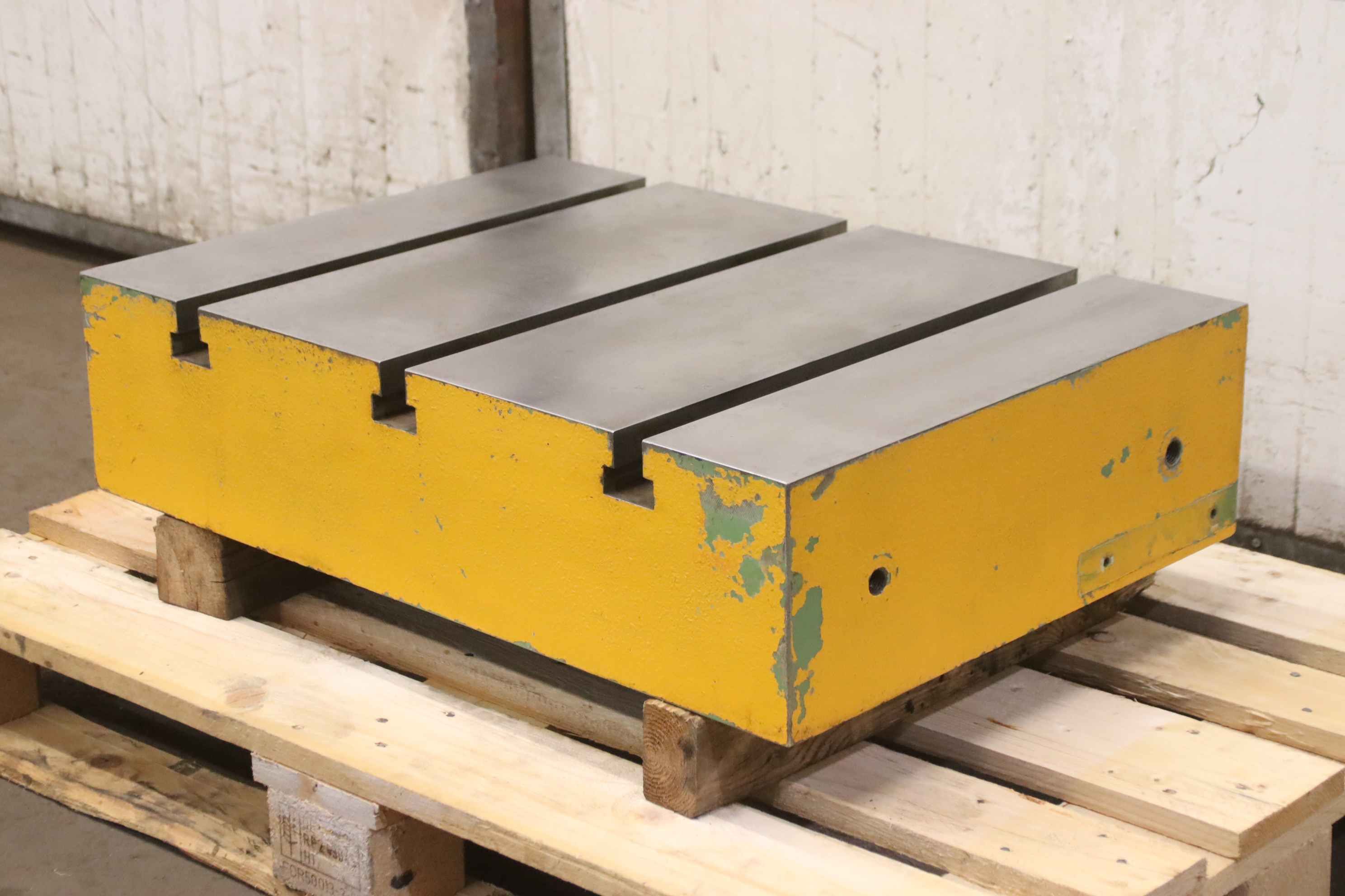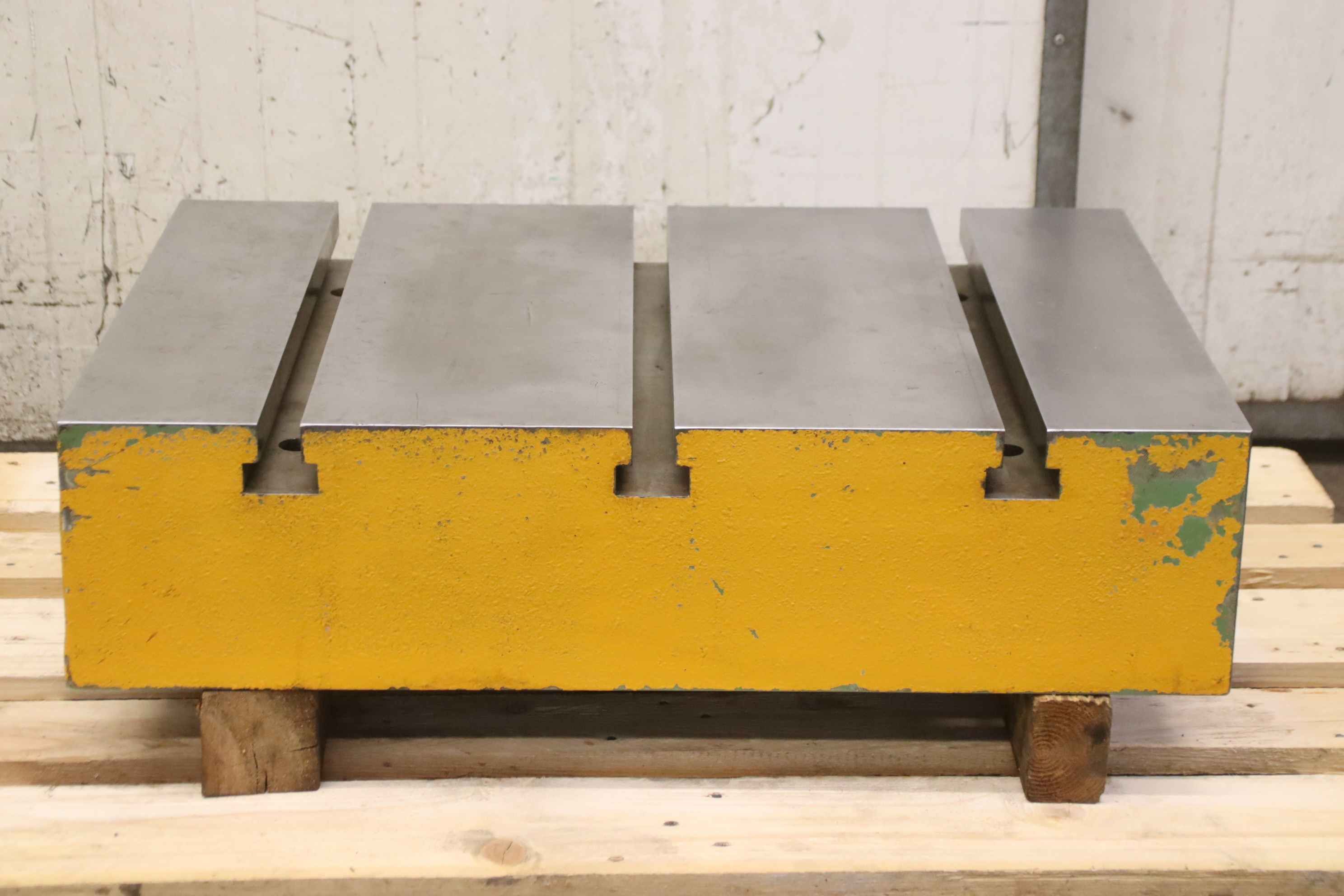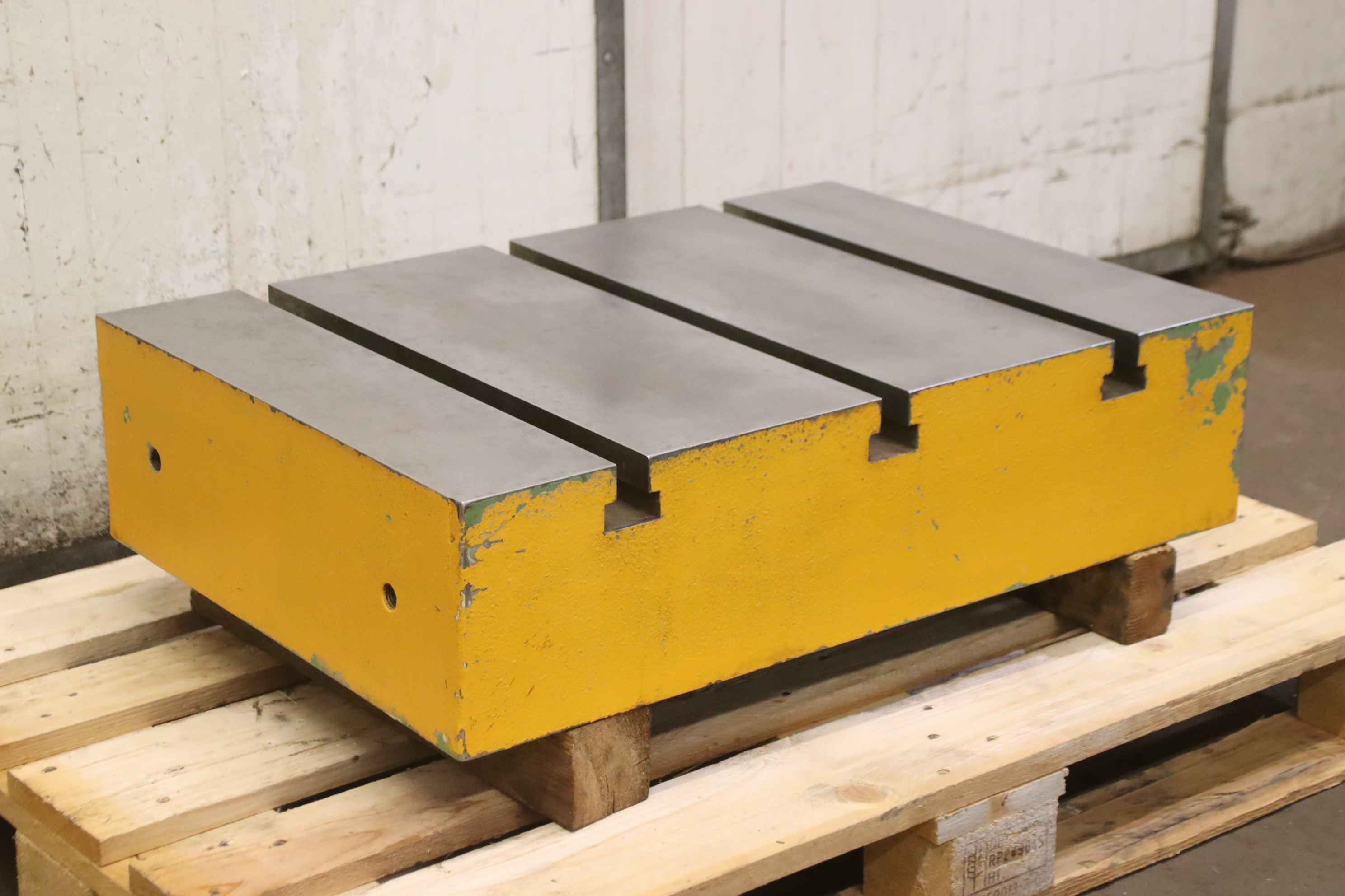 Clamping table, T-slot table, milling machine table, drilling machine table, boring machine table-Clamping table: Drilling machine table Milling machine table T-slot table-Table surface: 800 x 550 mm, height 195 mm-Groove width: 28 mm, groove spacing 250 mm-Dimensions: see photo technical drawing-Total dimensions: 800/550/H195 mm-Weight: 630 kg