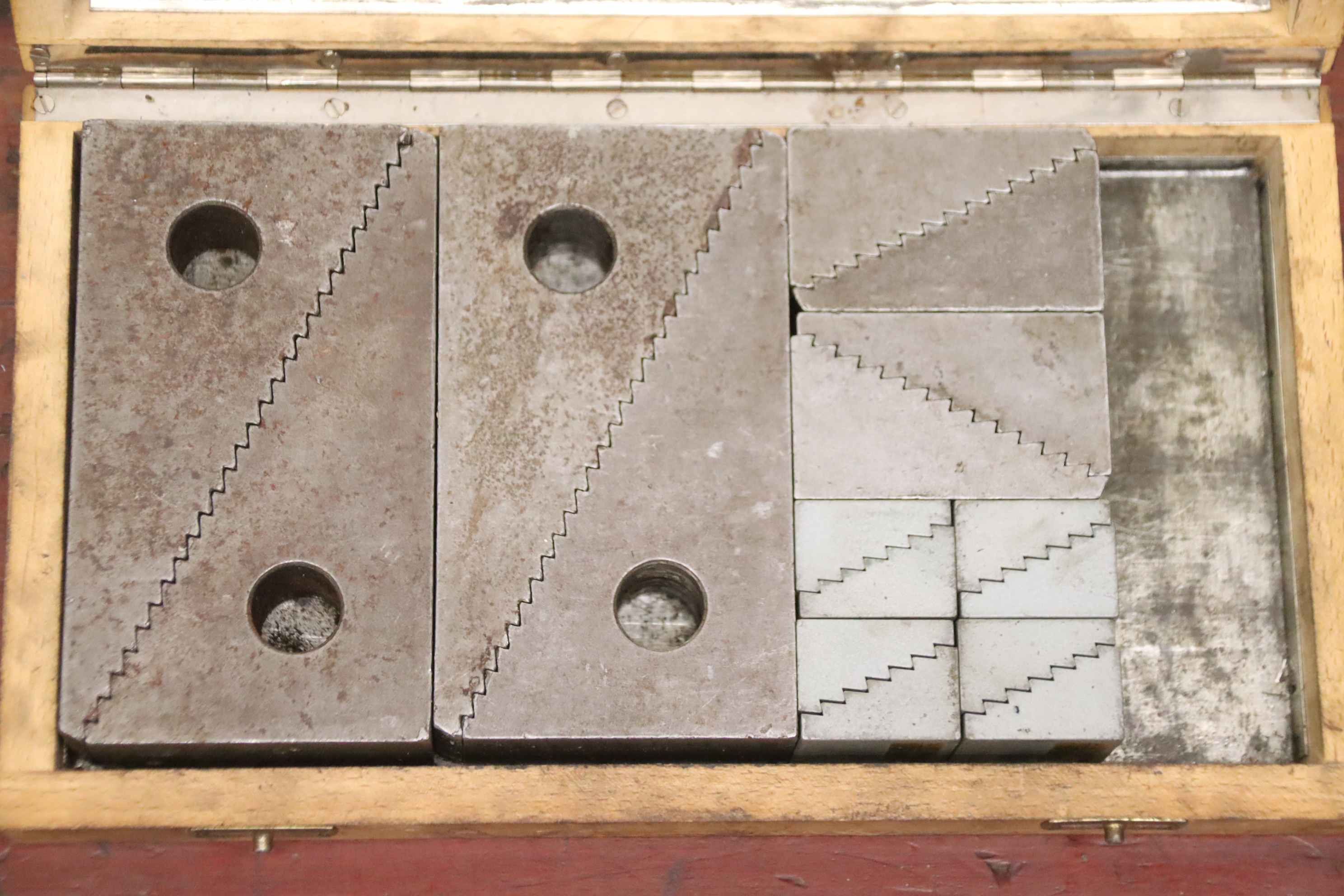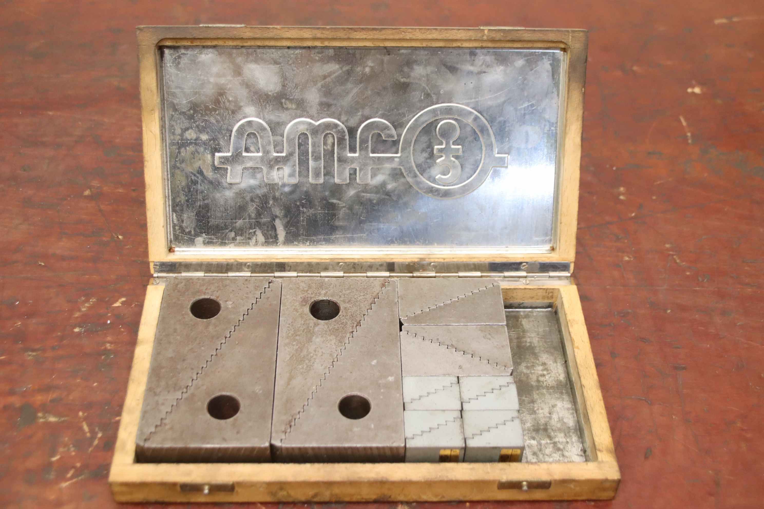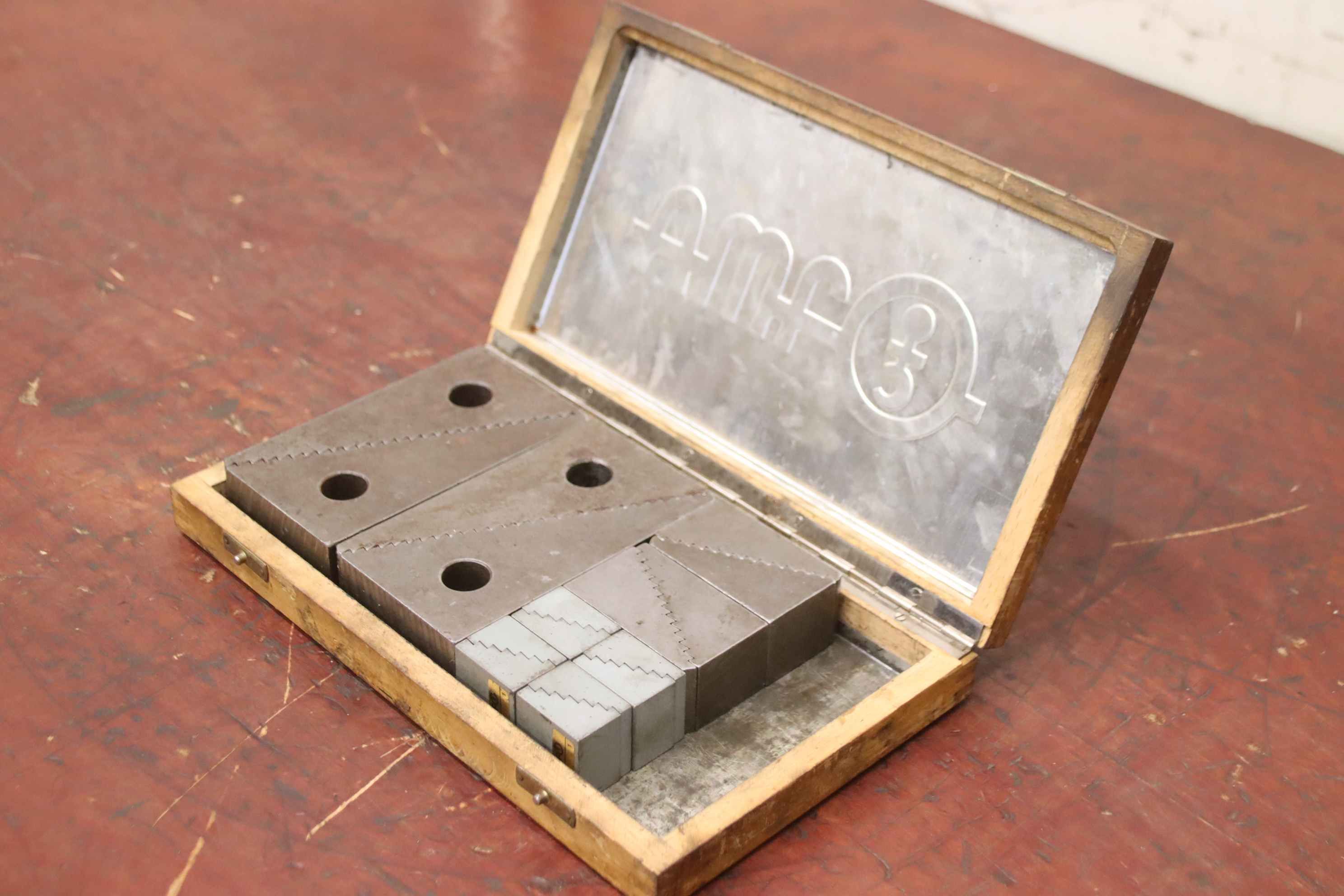 clamping devices, clamping claws, deep clamping jaws, clamping pads, clamping tools, step claws, low clamps, clamping irons, step blocks-Manufacturer: AMF, universal clamping pad set in wooden box-Design/Dimensions: see photos-Quantity: 3x set available-Price: per set-Dimensions box: 280/160/H40 mm -Total weight: 7.0 kg/piece