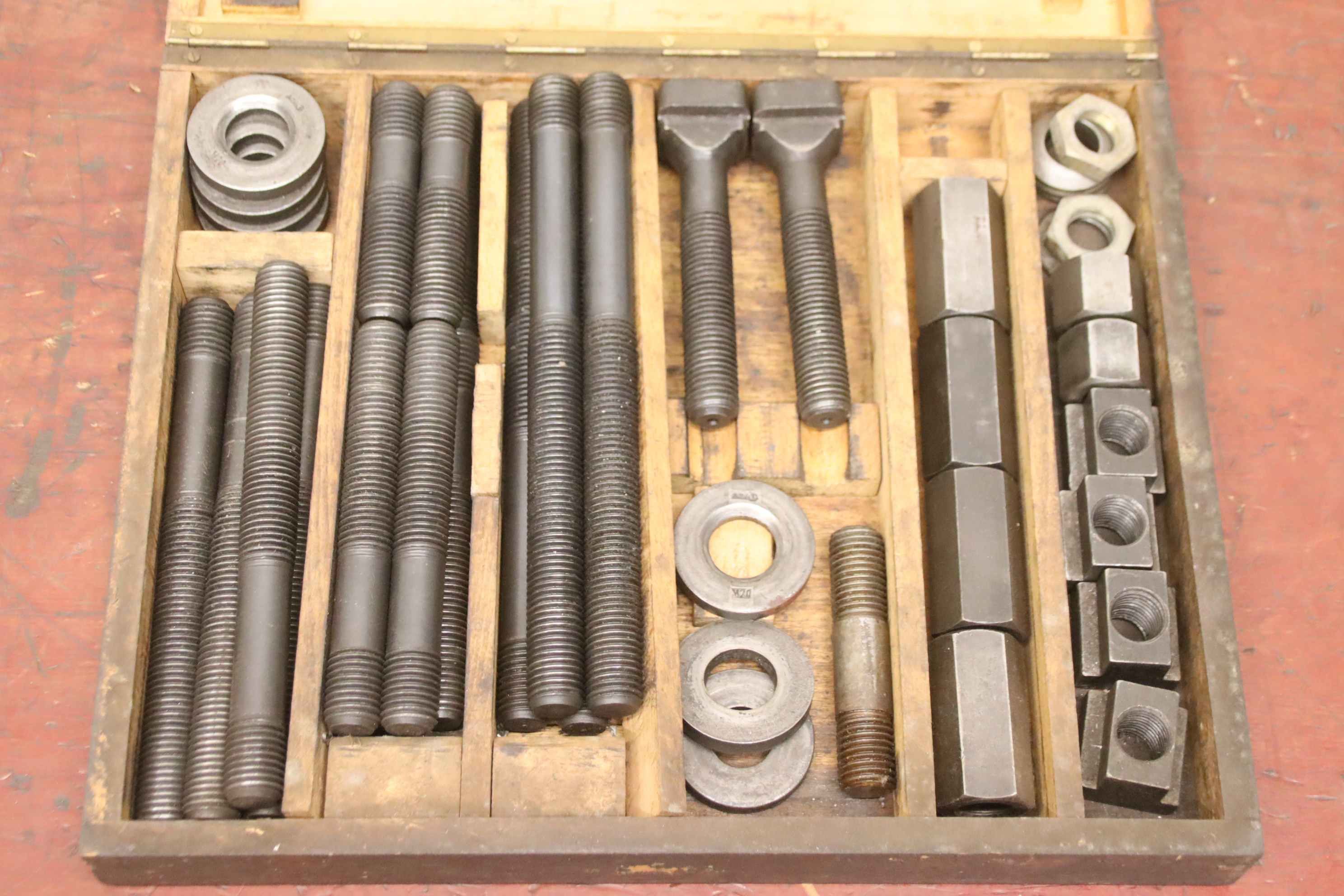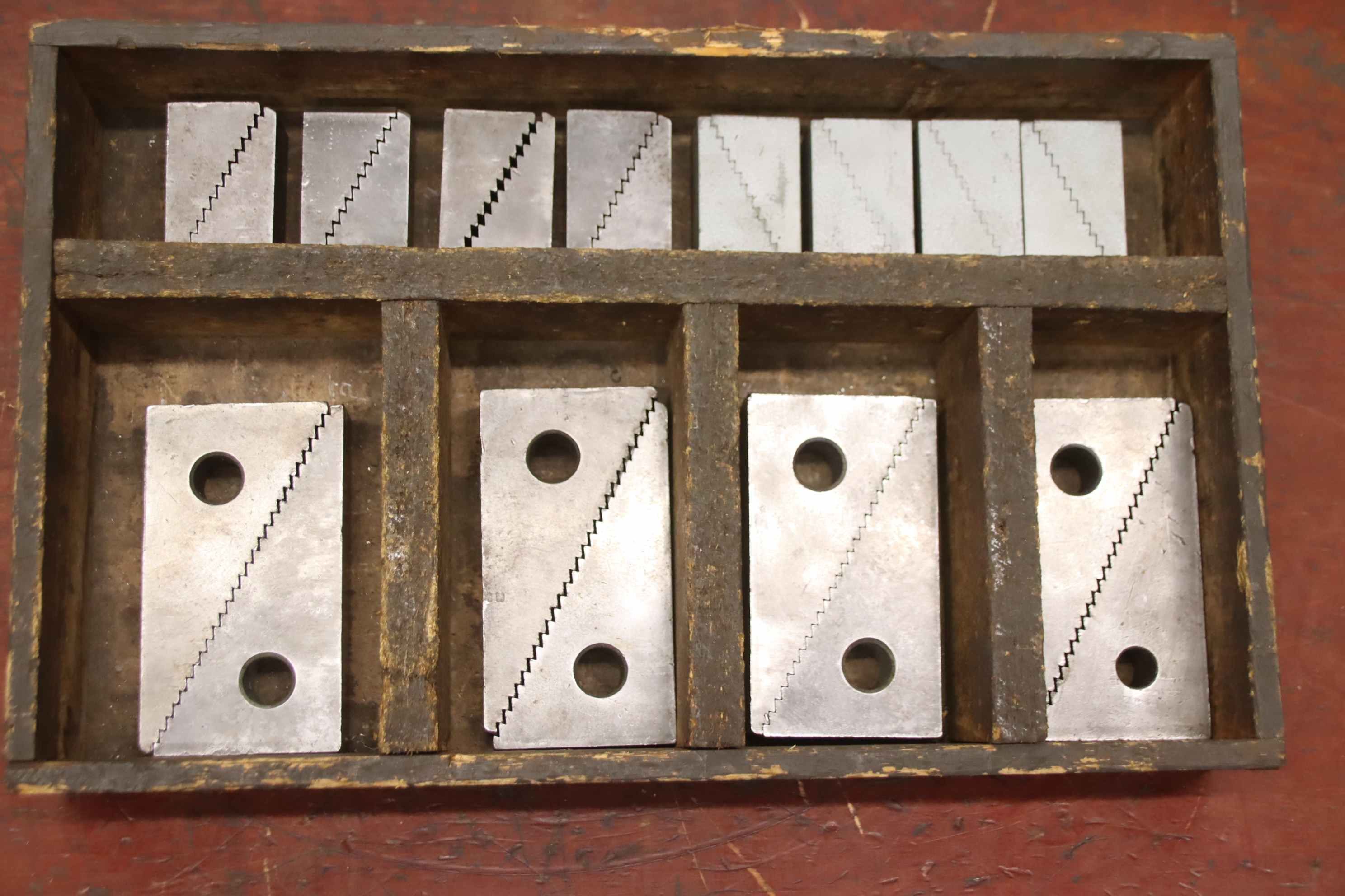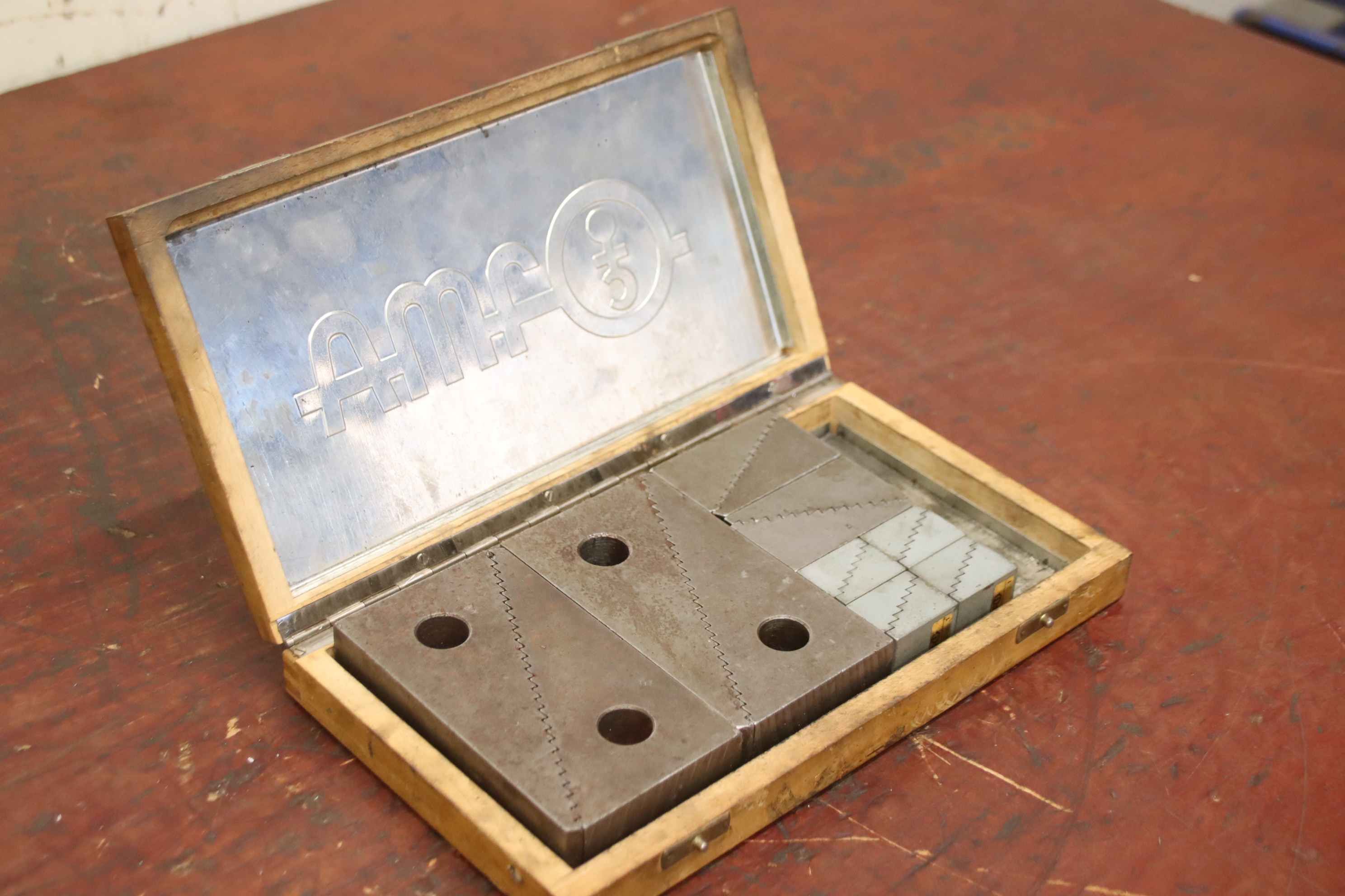 clamping devices, clamping claws, deep clamping jaws, clamping pads, clamping tools, step claws, low clamps, clamping irons, step blocks-Manufacturer: AMF, universal clamping pad set in wooden box-Design/Dimensions: see photos-Quantity: 3x set available-Price: per set-Dimensions box: 280/160/H40 mm -Total weight: 7.0 kg/piece