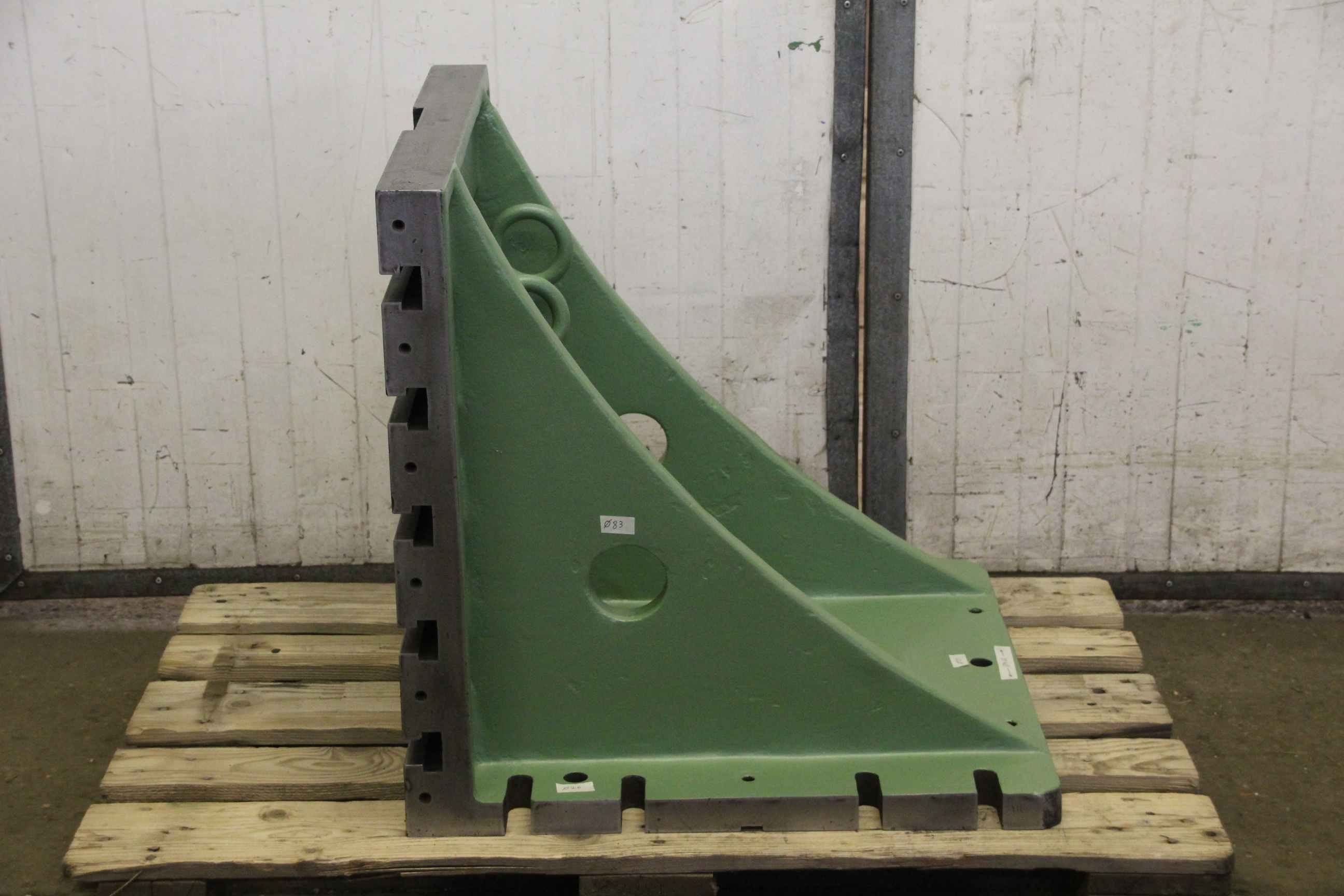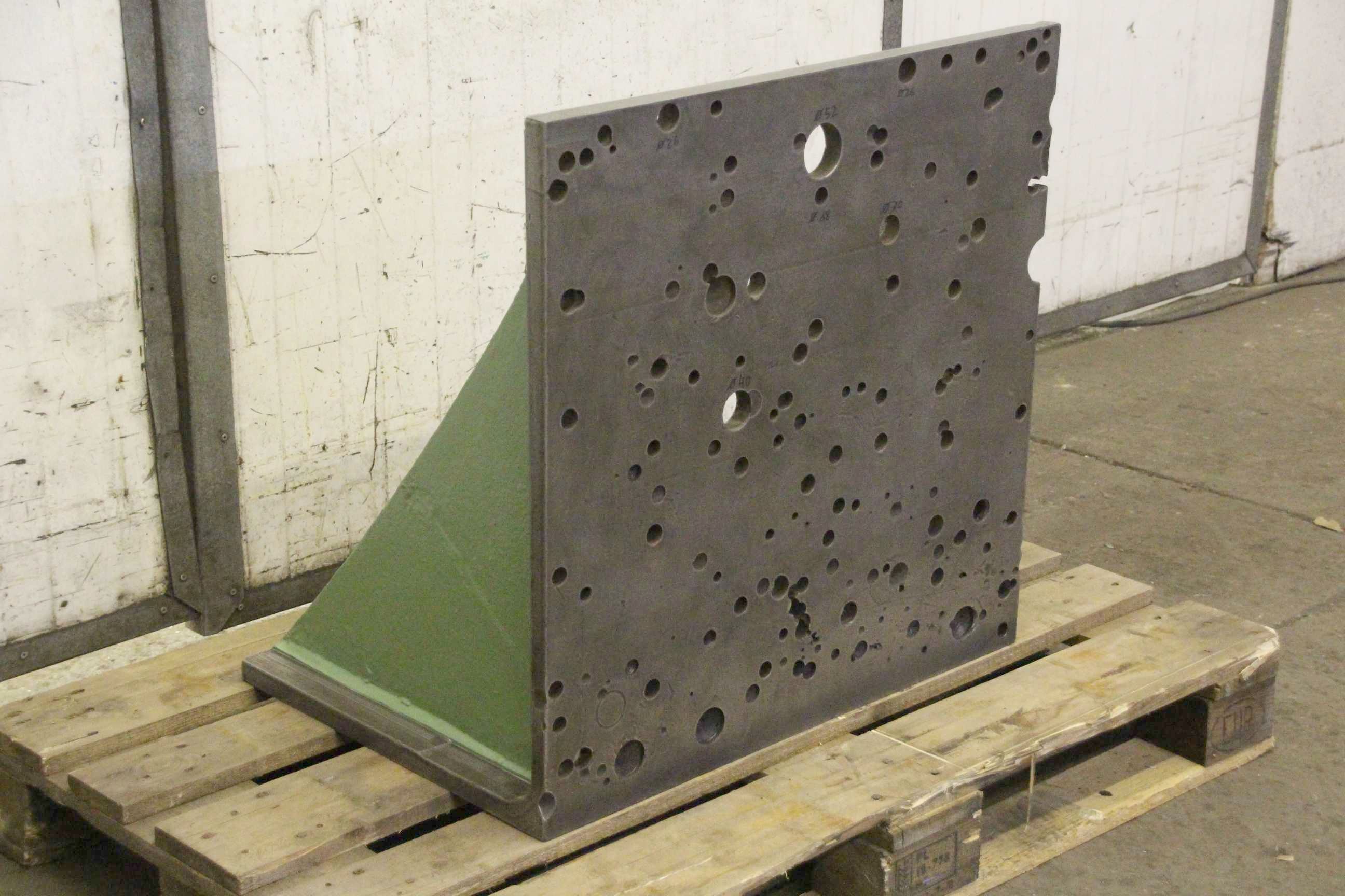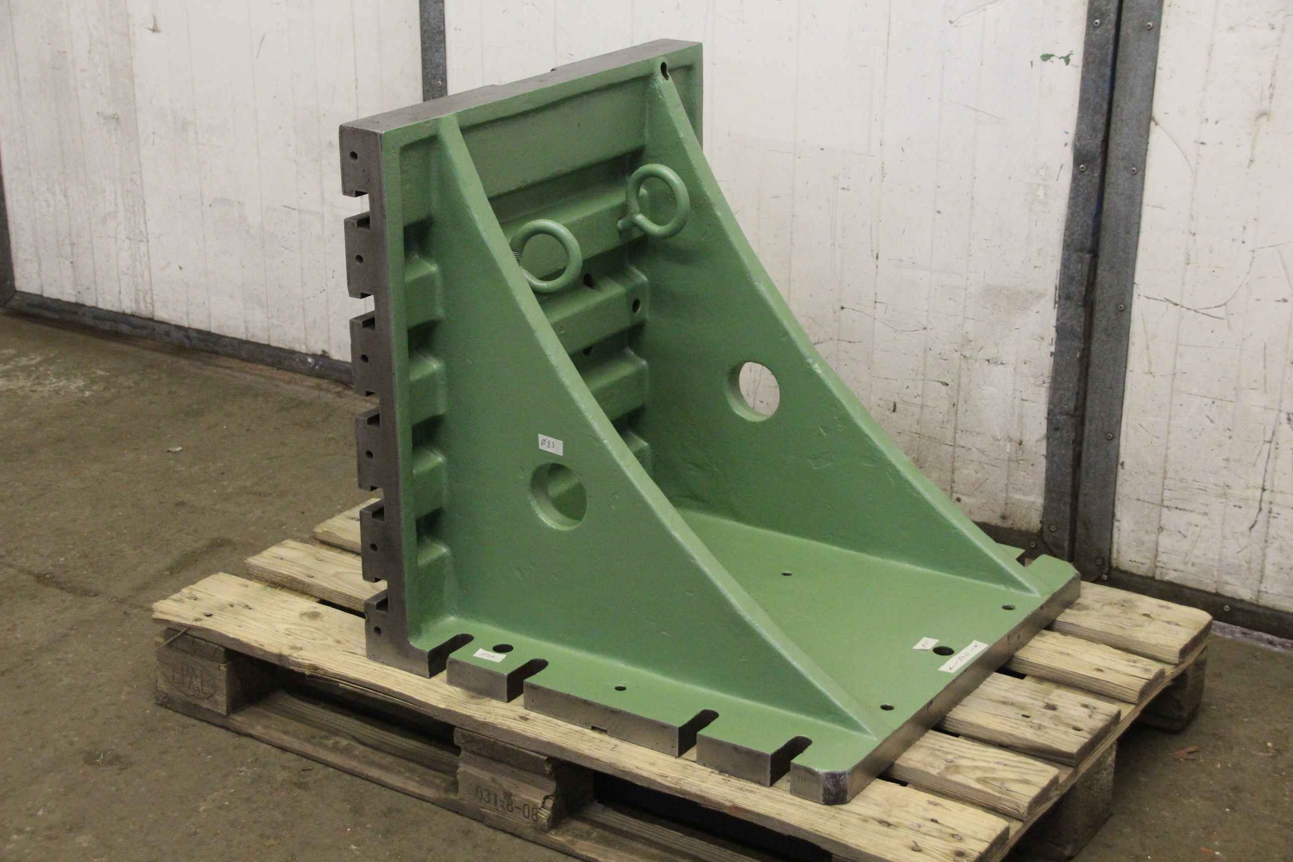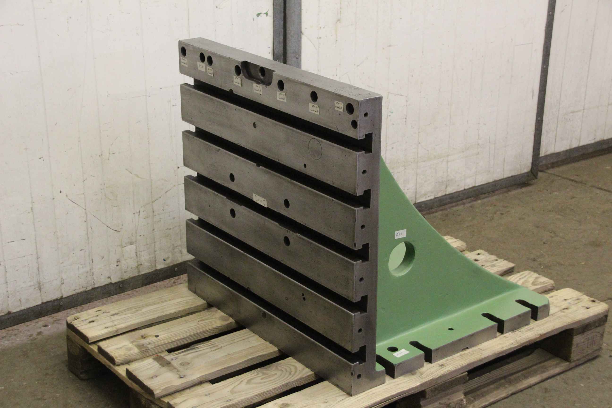 Clamping table, clamping angle, T-slot table, rotary table, milling machine table -Clamping angle: for workpiece clamping -Table surface: 705 x 490 mm, height 695 mm -Wall thickness: 25 mm -Clamping slots: 70 x 20 mm -Dimensions: 705/490/H695 mm -Weight: 187 kg