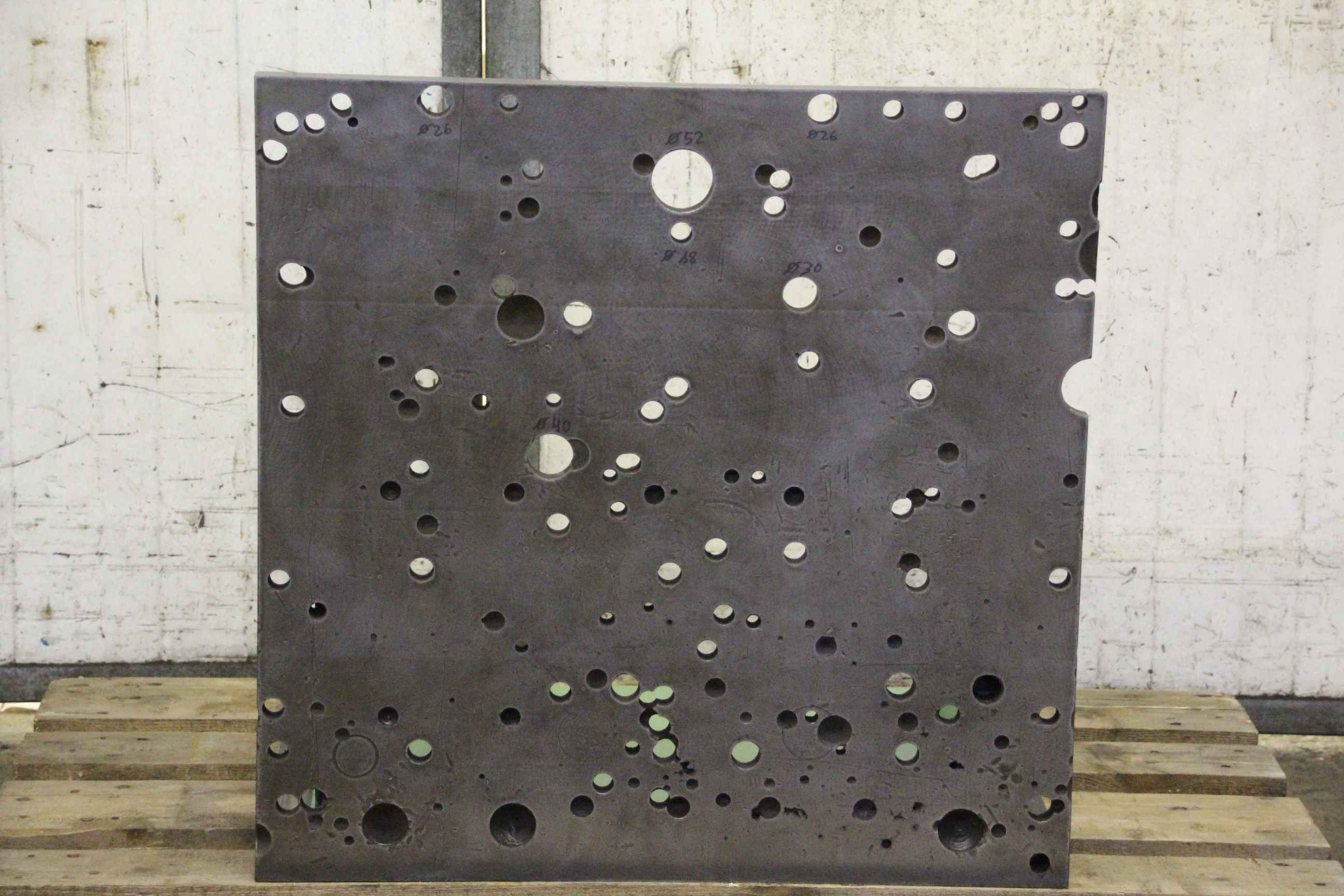 Clamping table, clamping angle, T-slot table, rotary table, milling machine table -Table surface: 690 x 700 mm -T grooves: 5 pieces 28 mm -Number: 1x table available -Dimensions: 690/700/H693 mm -Weight: 360kg