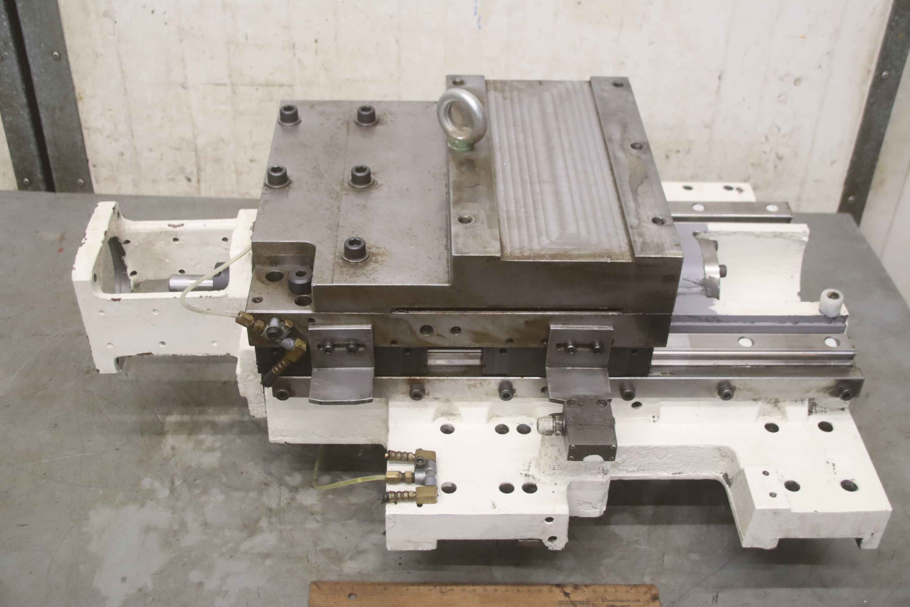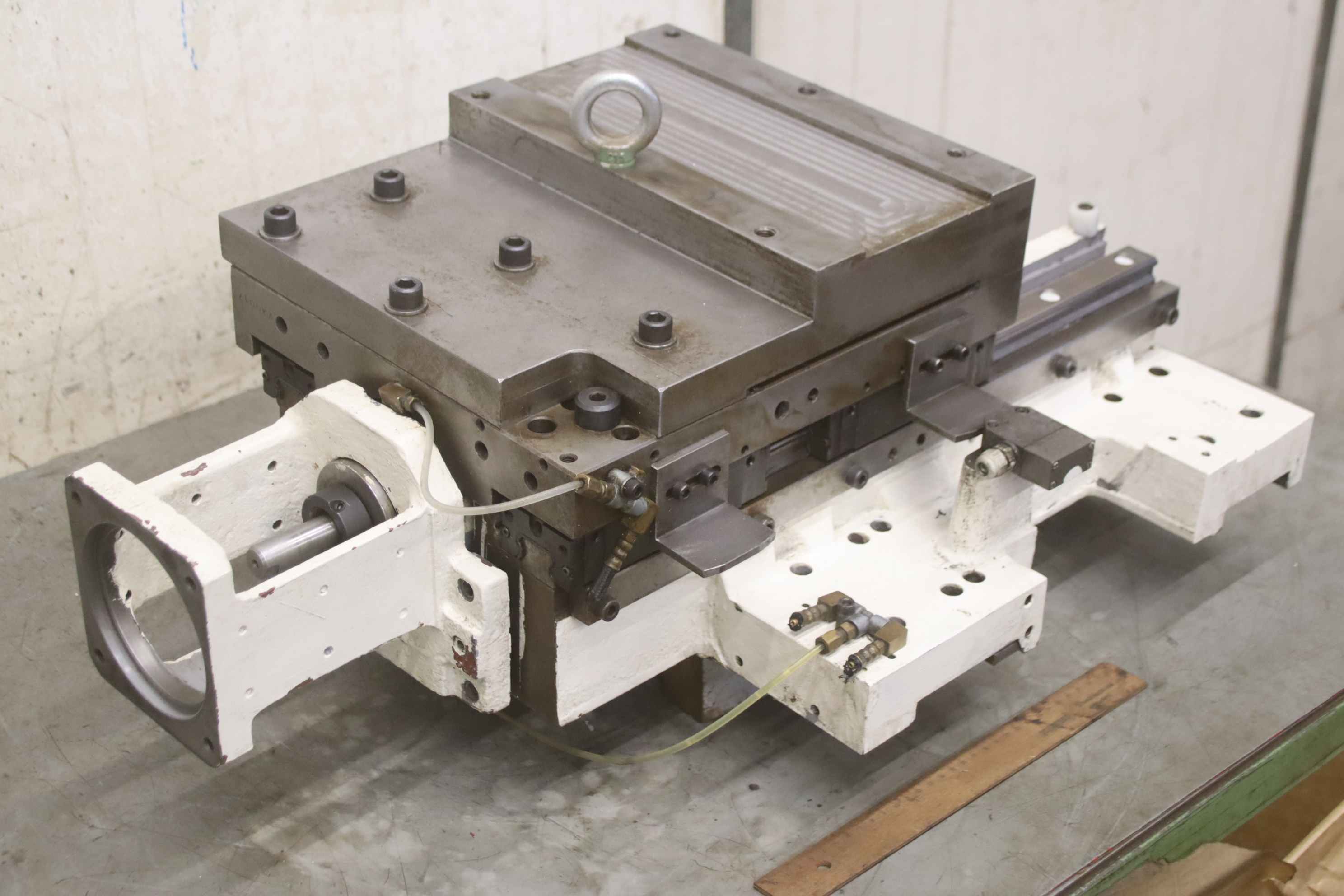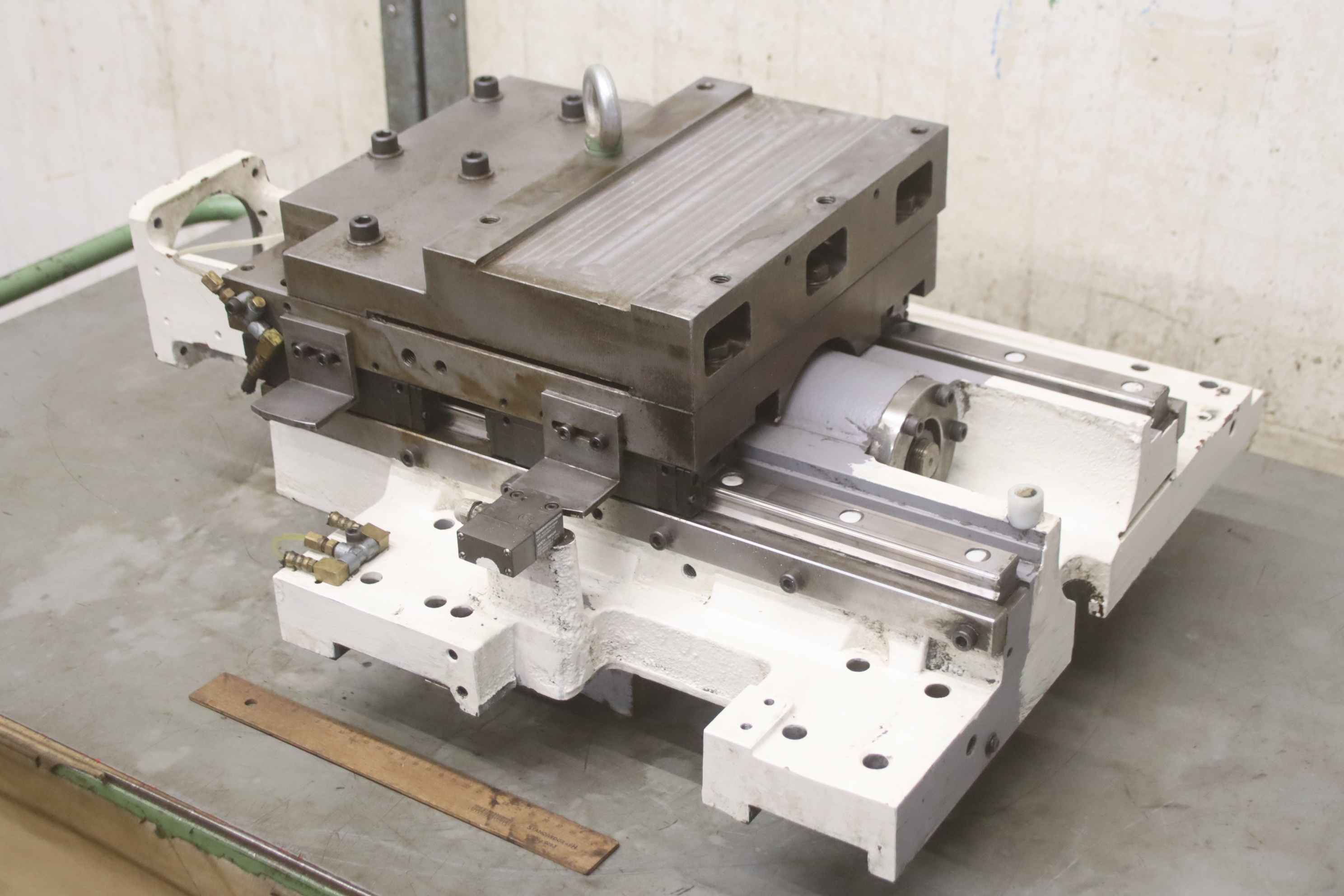 Mounting plate with threaded hole and cross table, clamping angle, T-slot table, rotary table, milling machine table, top slide, top slide, dovetail guide, tool slide, cross table, cross slide -Manufacturer: Santenberg, upper support tool slide from CNC machining center GTC S 2 -Drive shaft: Ø 20 x 45 mm -Dimensions: see photos -Dimensions: 720/550/H320 mm -Weight: approx. 194 kg