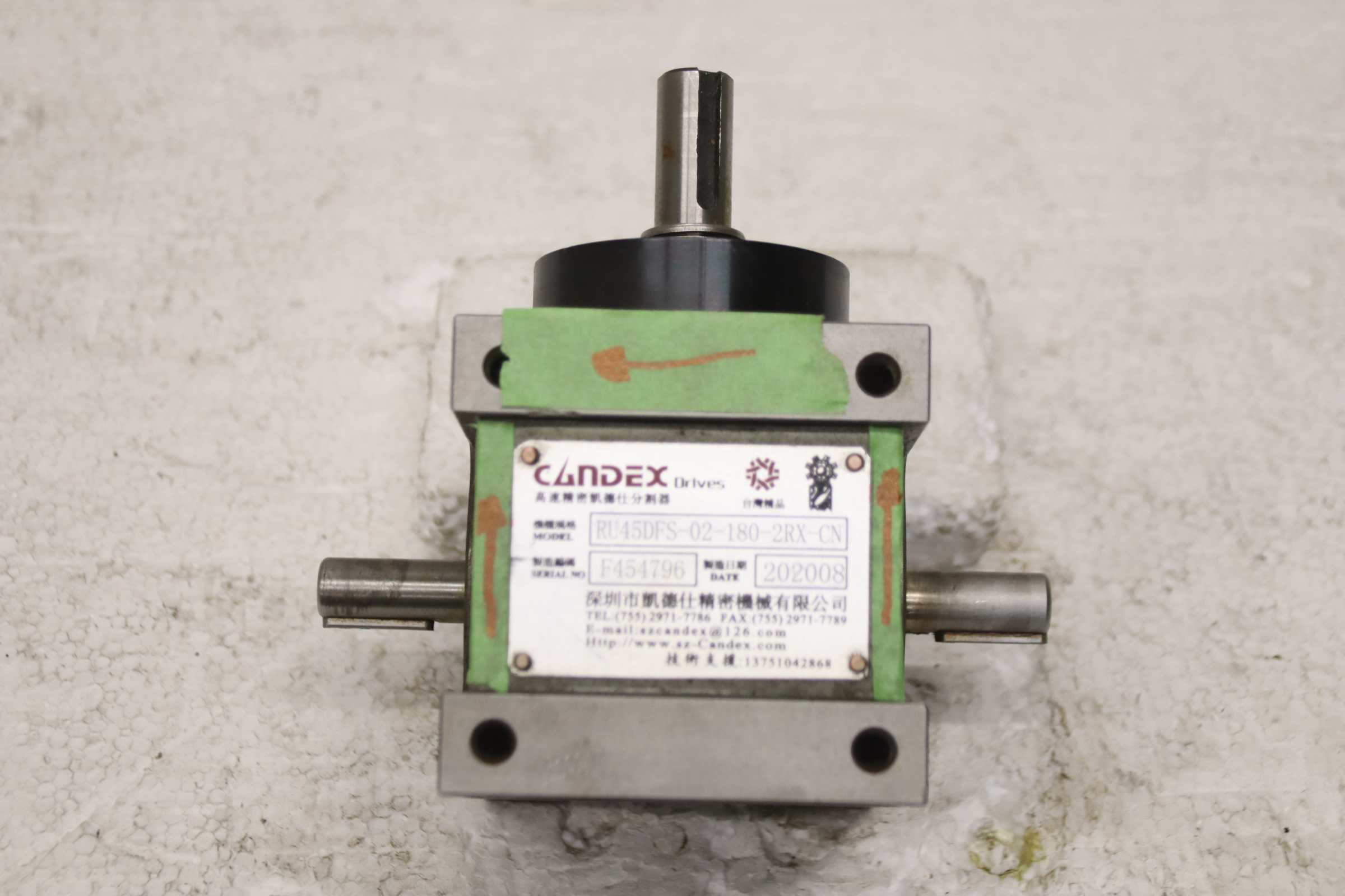 Indexer, indexing gear, cam indexer, rotary table indexer, rotary indexing drive -Manufacturer: Candex, cam indexer -Type: RU45DFS-02-180-2RX-CN -Shaft: Ø16 mm / 2x Ø14 mm -Translation: 1:2 -Dimensions: 160/150/H130 mm -Weight: 5.2 kg