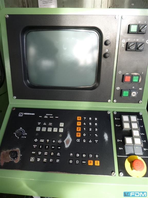 x-travel:500 mmy-travel:400 mmz-travel:330 mmtable-size:400 x 710 mmspindle taper ISO:40 quill stroke:100 mmcontrol:HEIDENHAIN TNC 335 table load:180 kgno. of flutes:8 groove width:14/45 mmtool taper:ISA 40 speeds::20 - 3000 /28- 4000 U/minfeeds:infinitely variable1-1250 mm/minrapid traverse:5000 mm/mintotal power requirement:13 kWweight of the machine ca.:2500 kgdimensions of the machine ca.:2000 x 2800 x 2300 mmDocuments:inkl. Zusatzinformationen ? Schile-Elektroschrank mit CNC-Steuerung Heidenhain TNC 355 ? Starrer Winkeltisch 710 x 400mm ? Spritzschutzverkleidung / Halbkabine ? Kopf nach Skala präzise drehbar über Kurbel ? Kopf komplett wegschwenkbar für horizontal Spindel