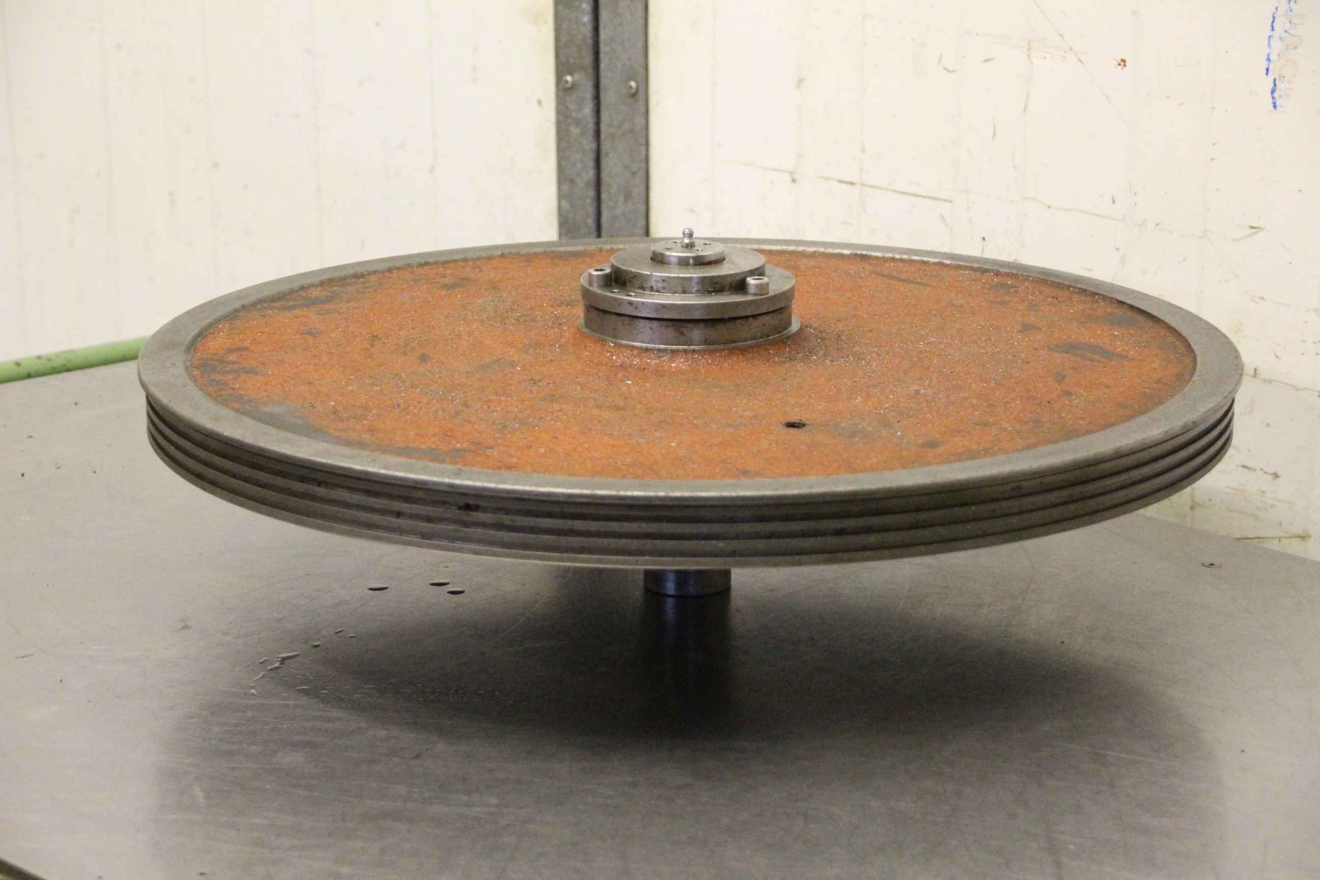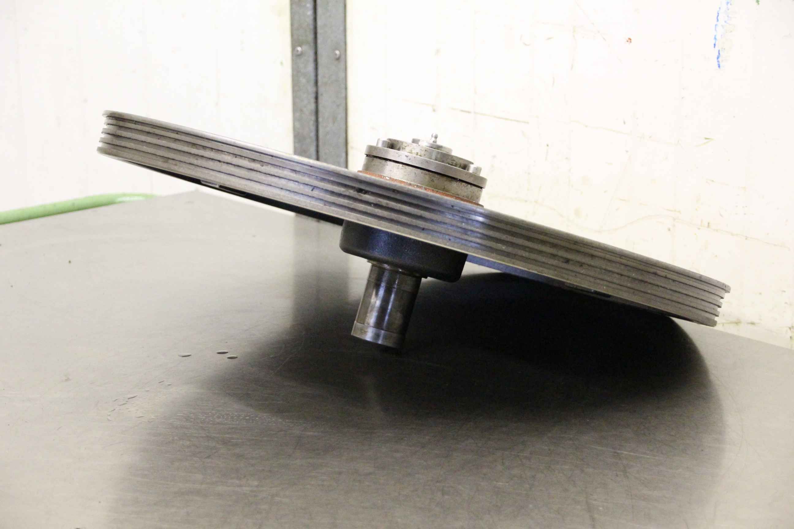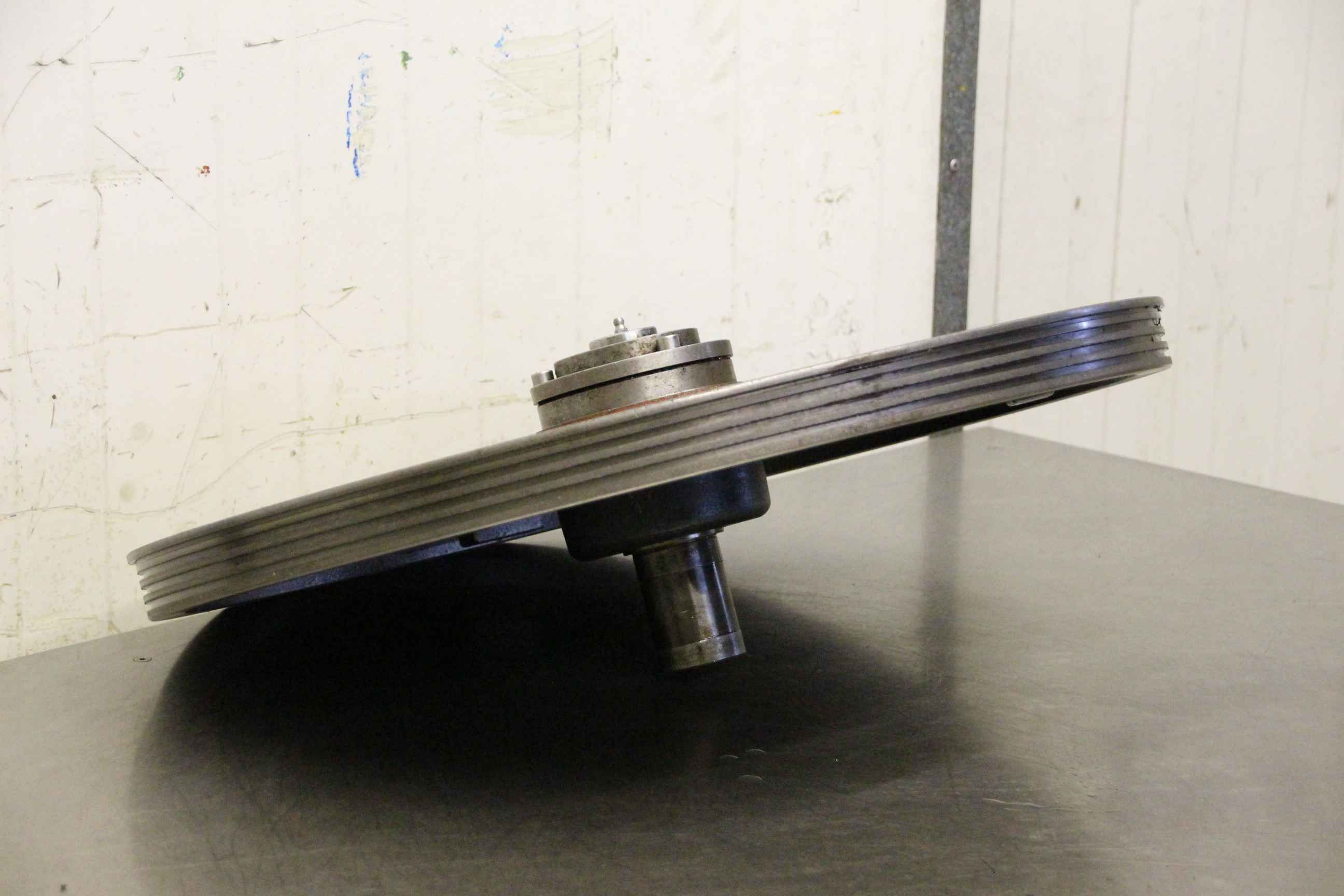 Clamping device for table band saw, wood band saw, firewood saw, automatic band saw, material positioning, saw band rollers, saw band roller -Saw band roll: made from metal saw Amada HA-400 W -Diameter: 595mm -Shaft: Ø 50 x 70 mm -Receptacle: M16 x 2 -Dimensions: Ø 595 x 193 mm -Quantity: 1 piece available -Weight: 51kg