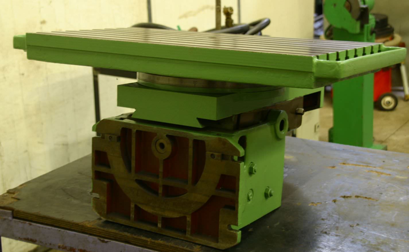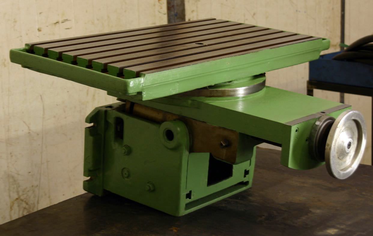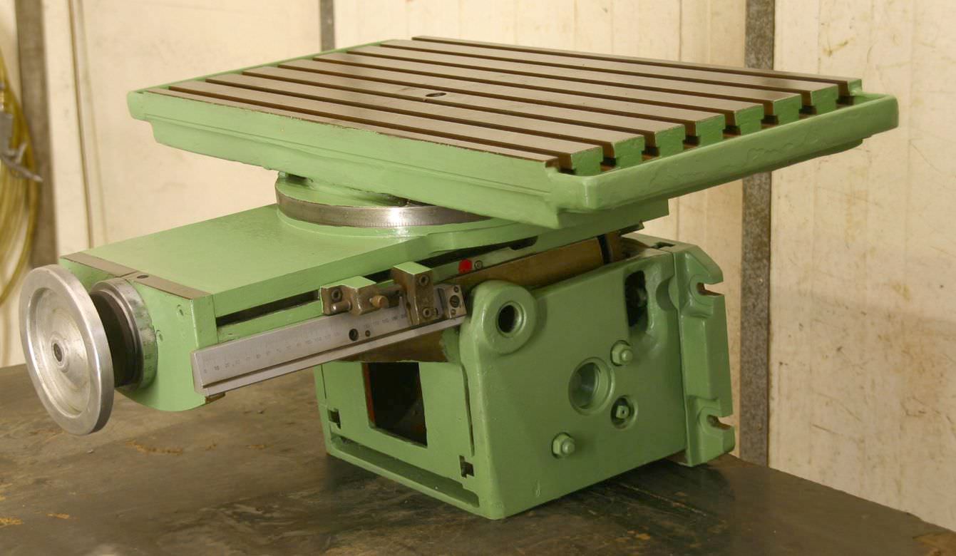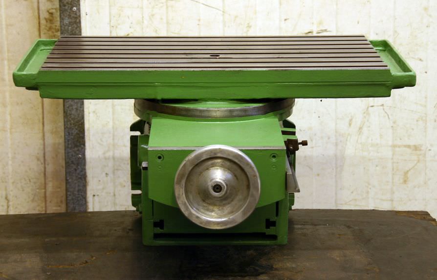 Clamping table, clamping angle, T-slot table, rotary table, milling machine table -Table surface: 360 x 660 mm -T grooves: 8x 12 mm -rotatable: by hand with 4x fastening screws -swivelling: via crank -Movable: via crank 200 mm -Number: 1 piece available