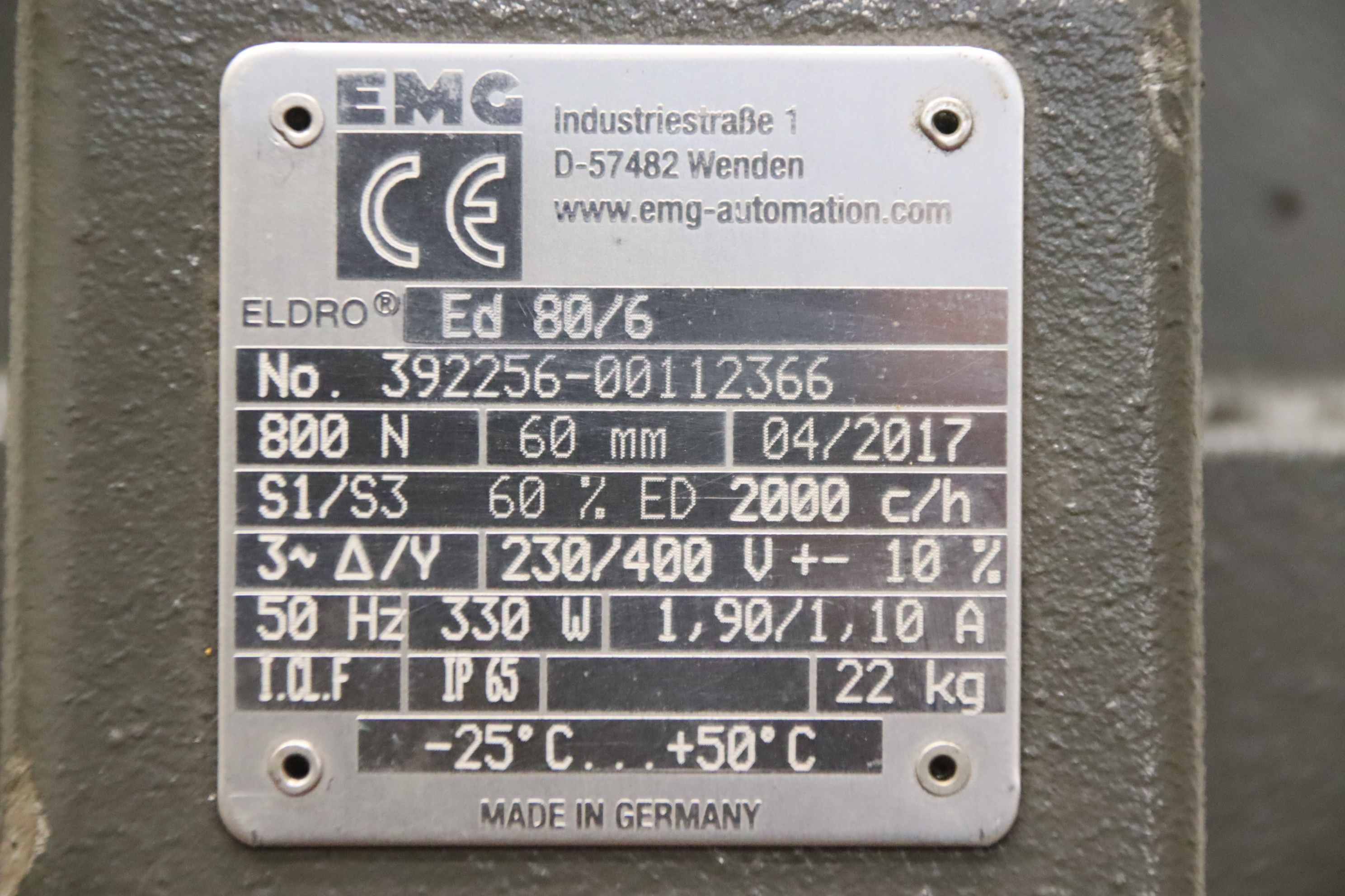 Electro-hydraulic lifting device, linear drive, linear gearbox, lifting gearbox, spindle drive, electro-hydraulic actuator for valves, valve drive, actuator, actuator motor, actuator cylinder for rotor brake, disc brake, electro-hydraulic disc brake, crane brake, electro-hydraulic lifting device, lifting drive -Manufacturer: EMG Eldro Electro-hydraulic lifting device, unused -Type: Eldro Ed 80/6 -Item no.: 1045 2806 lifting drive Eldro Ed 80/6 -Stroke: 60 mm -Shaft: Ø 20 mm -Quantity: 4 pieces available Price: per piece -Dimensions: 490/190/H255 mm -Total weight: 22 kg/pc.