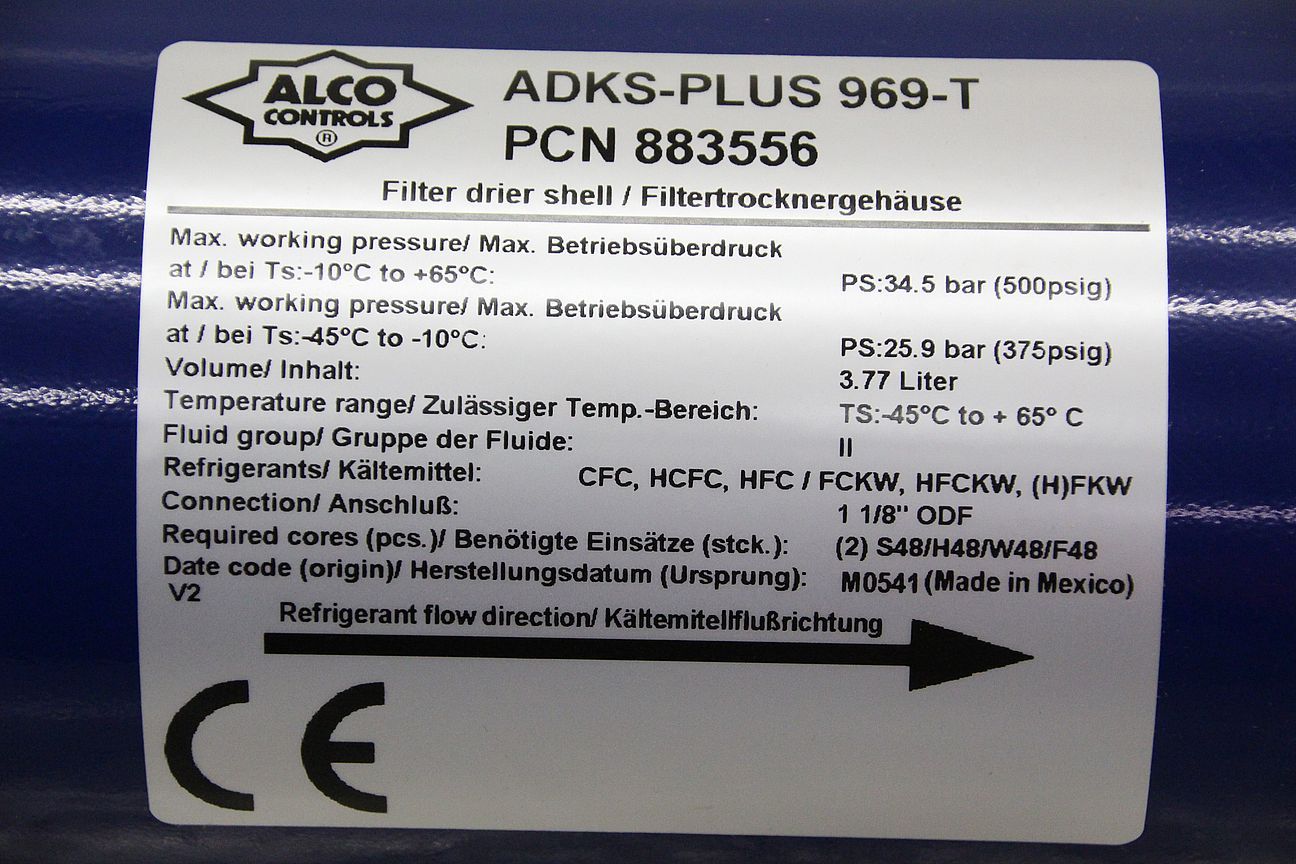 Refrigeration compressor, refrigeration machine, refrigeration compressor, refrigeration unit, refrigeration compressor, compressor, filter dryer housing-Manufacturer: Alco, filter drier housing unused in original packaging-Type: ADKS-PLUS 969-T/PCN 883556-Max. Operating pressure: 34.5 bar-Connection: 1-1/8 -Dimension package: 480/210/H160 mm-Weight: 5.1 kg
