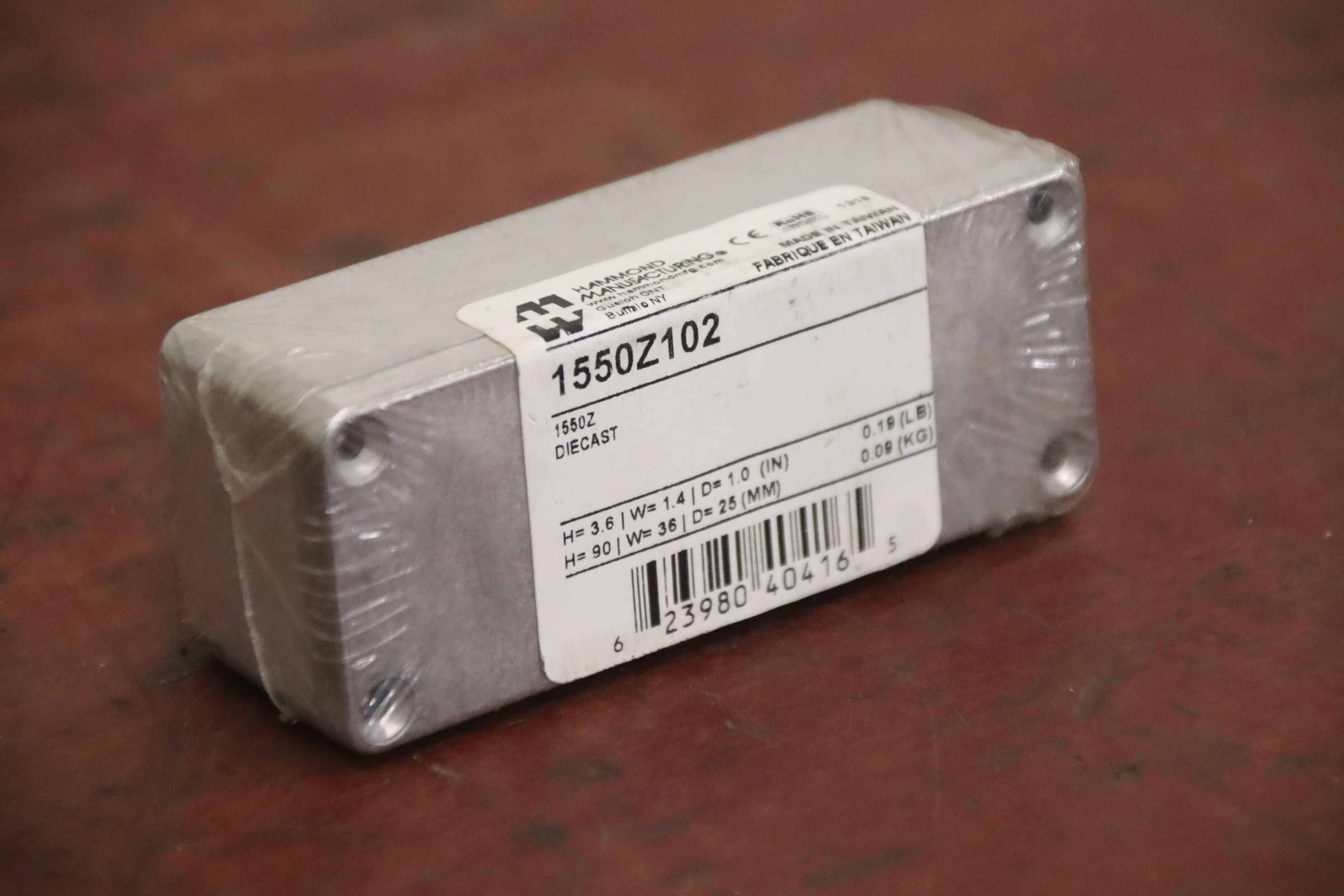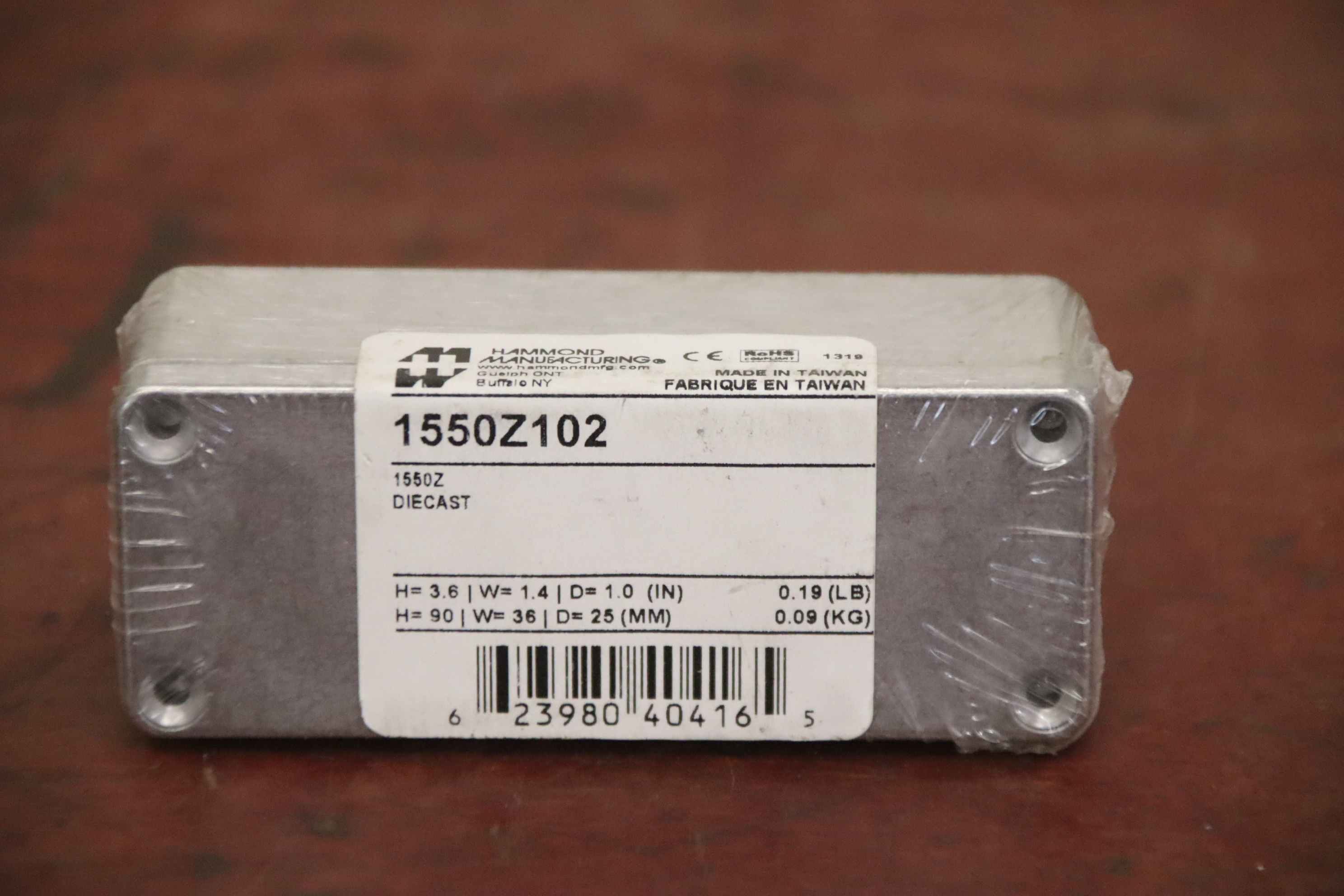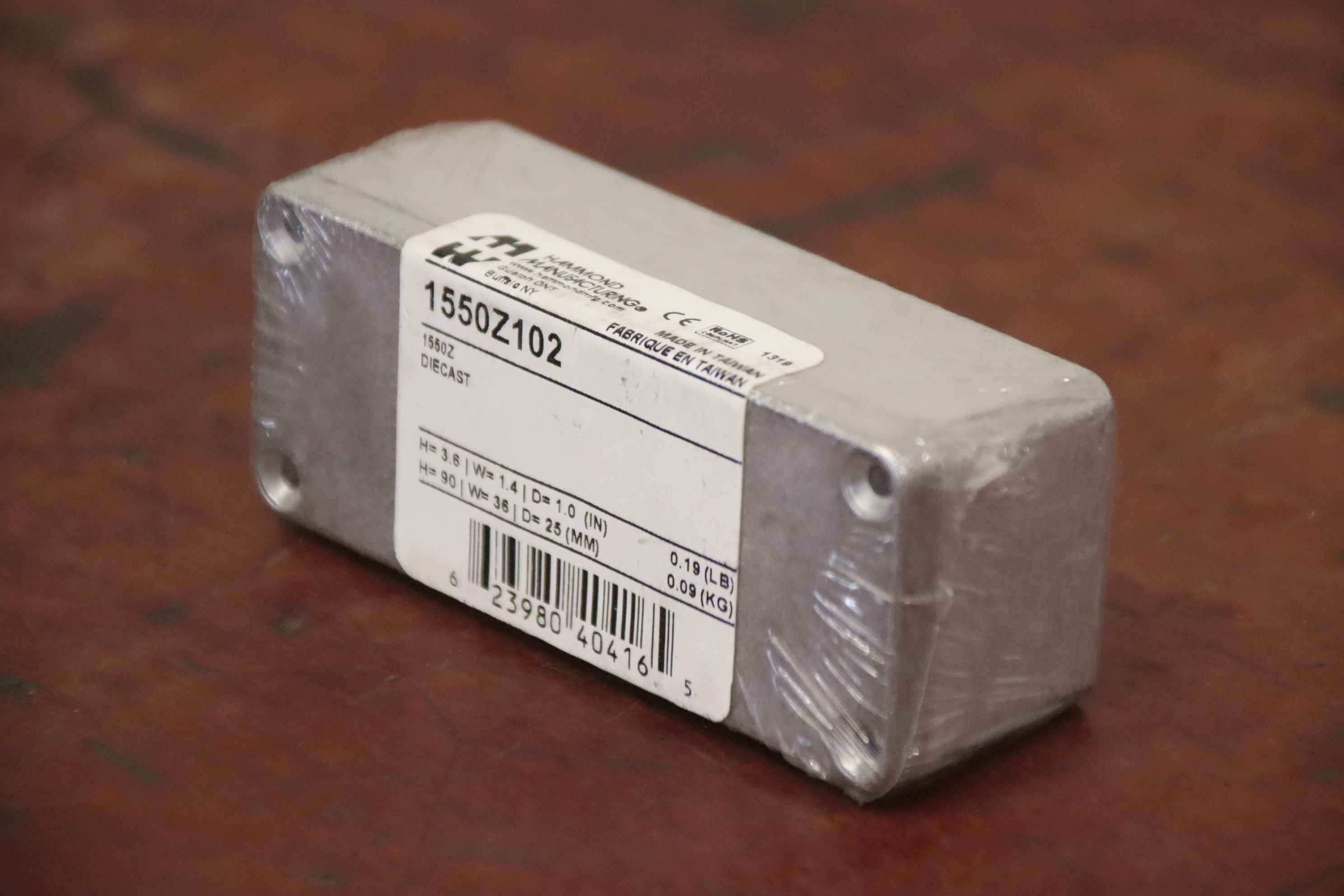 Enclosure, universal enclosure, aluminum enclosure -Manufacturer: Hammond, Aluminum Housing Junction and Pull Box -Type: 1550Z102 -External dimensions: Housing 90/36/H30 mm -Quantity: 9 pieces available -Price: per piece / Minimum order 3 pieces -Weight: 0.1 kg/pc.