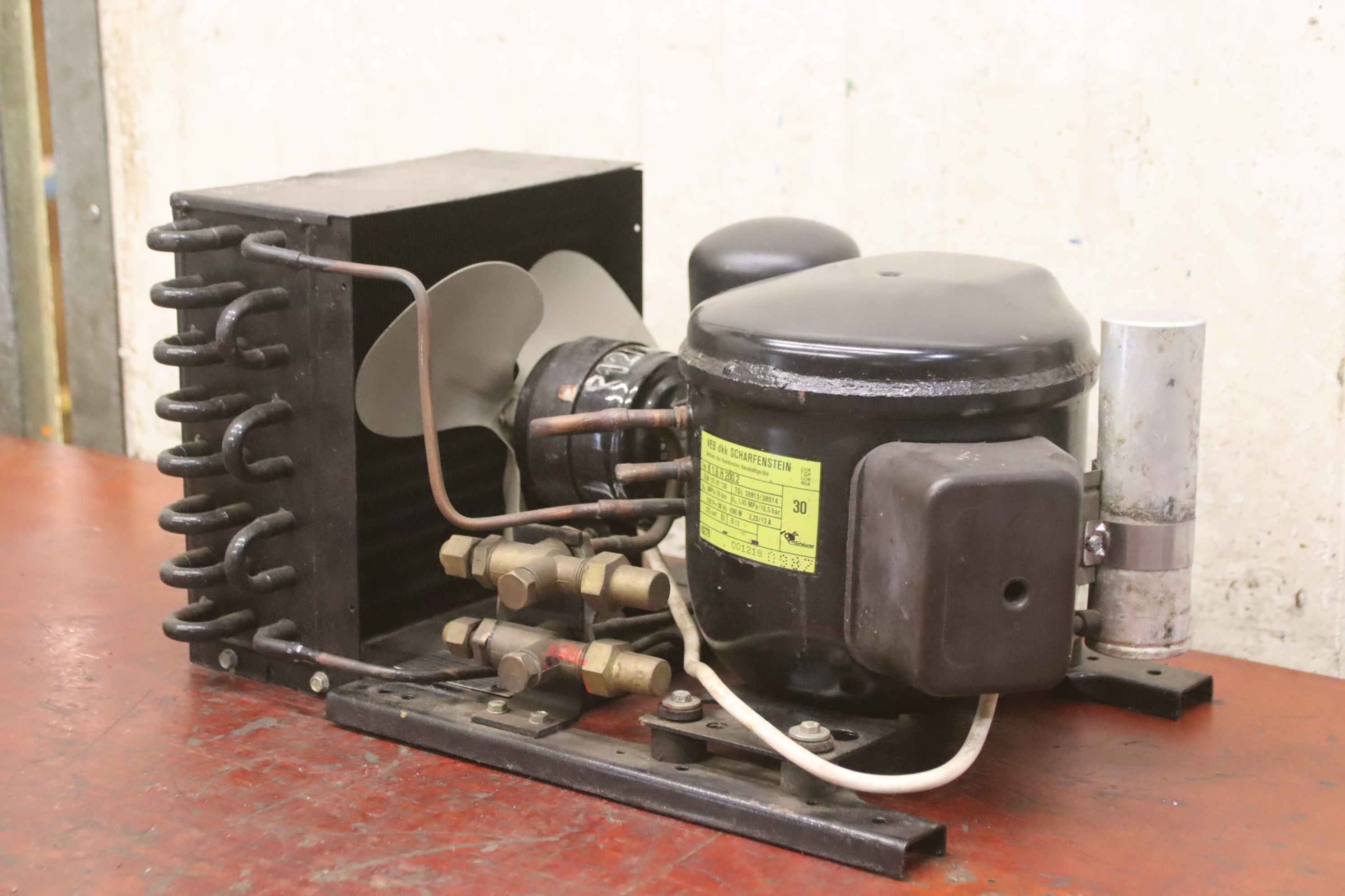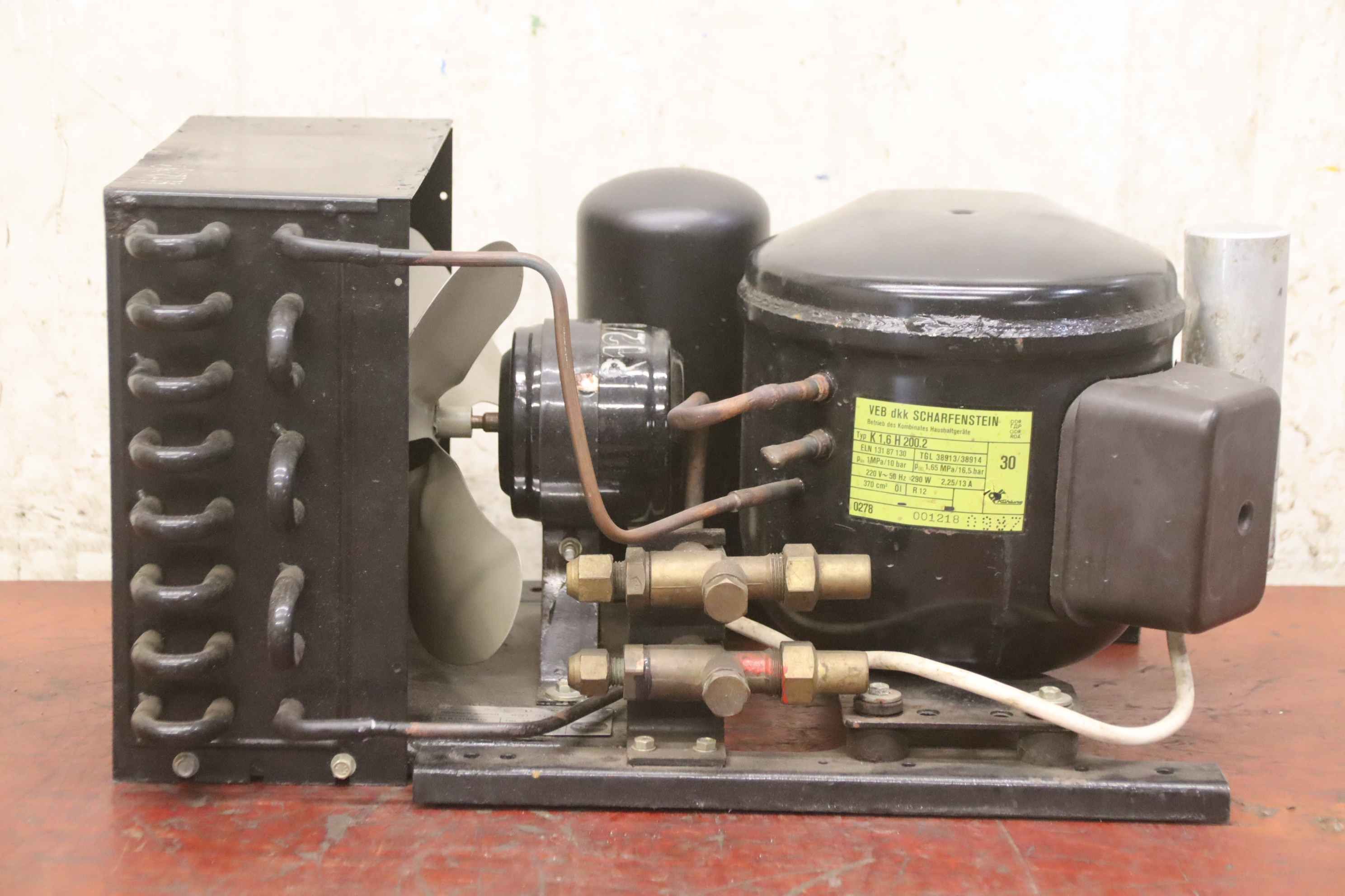 refrigeration compressor, refrigeration machine, cooling compressor, refrigeration unit, cooling compressor, compressor, motor compressor, refrigeration machine, refrigeration unit-Manufacturer: VEB, refrigeration compressor cooling unit complete-Type: K 1.6 H 200.2 / DK1.6H200.2-2.7-Power: 290 W-Voltage: 220V-Max.operating pressure: 15.2 bar-Technical data: see photos type plate-Total dimensions: 480/300/H245 mm-Weight: 22 kg