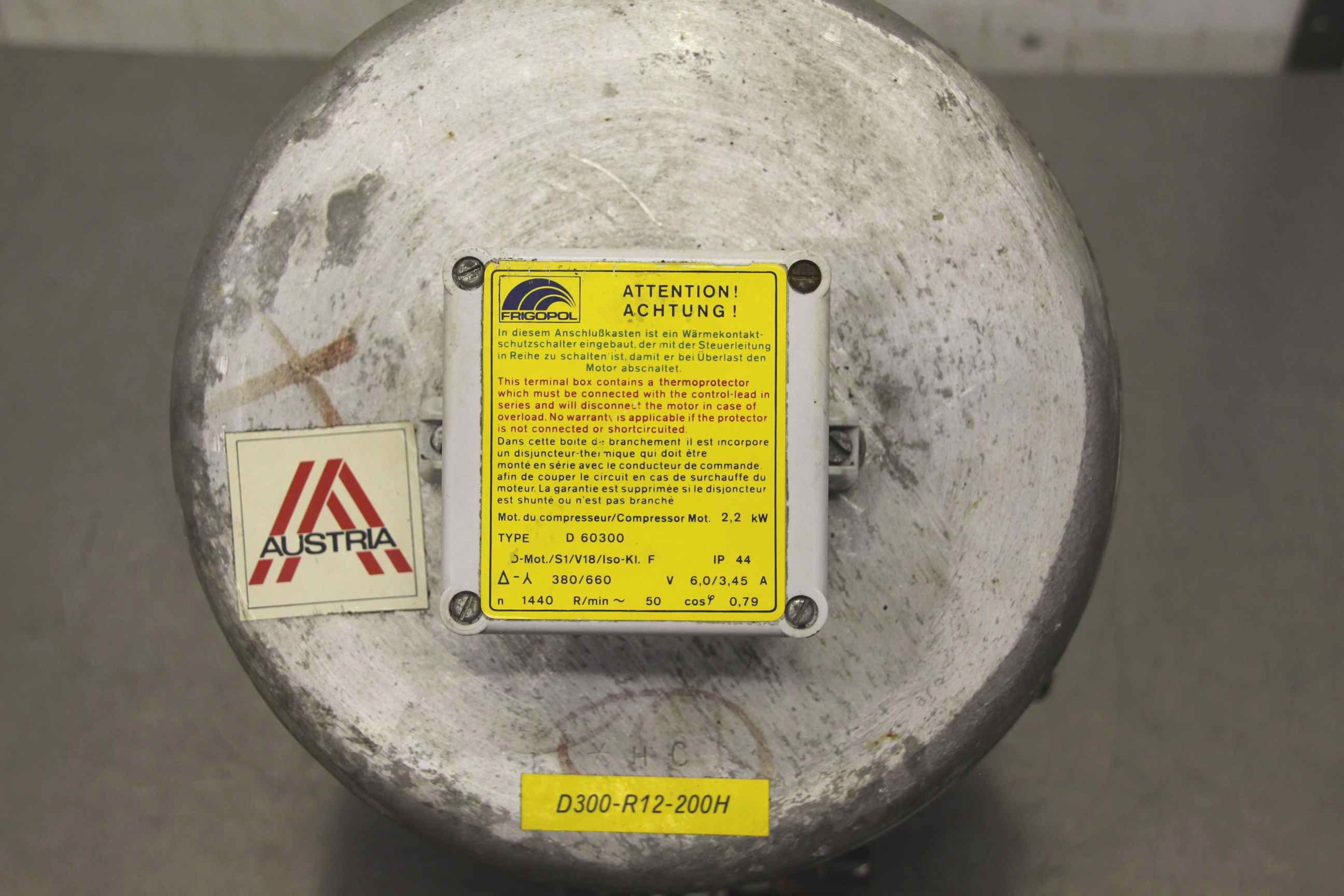 Refrigeration compressor, refrigeration machine, cooling compressor, refrigeration unit, cooling compressor, compressor, motor compressor, dividing hood compressor, dividing hood compressor -Manufacturer: Frigopol, separating hood compressor -Type: D 60300 -Power: 2.2 kW / 1440 rpm -Voltage: 380/660 V -Number: 4x cooling units available -Price: per piece -Dimensions: 400/400/H455 mm -Weight: 68 kg/unit