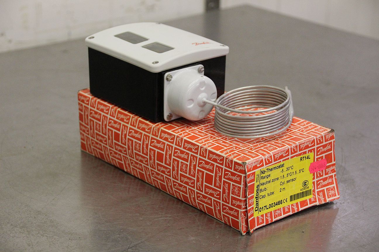 Refrigeration compressor, refrigeration machine, cooling compressor, refrigeration unit, cooling compressor, compressor, filter dryer housing, shut-off valve, ball shut-off valve, temperature switch, thermostat-Manufacturer: Danfoss, unused thermostat in original packaging-Type: RT14L-Temperature range: -5 to 30 °C-Dimensions package: 275/130/H75 mm-Weight: 1 kg