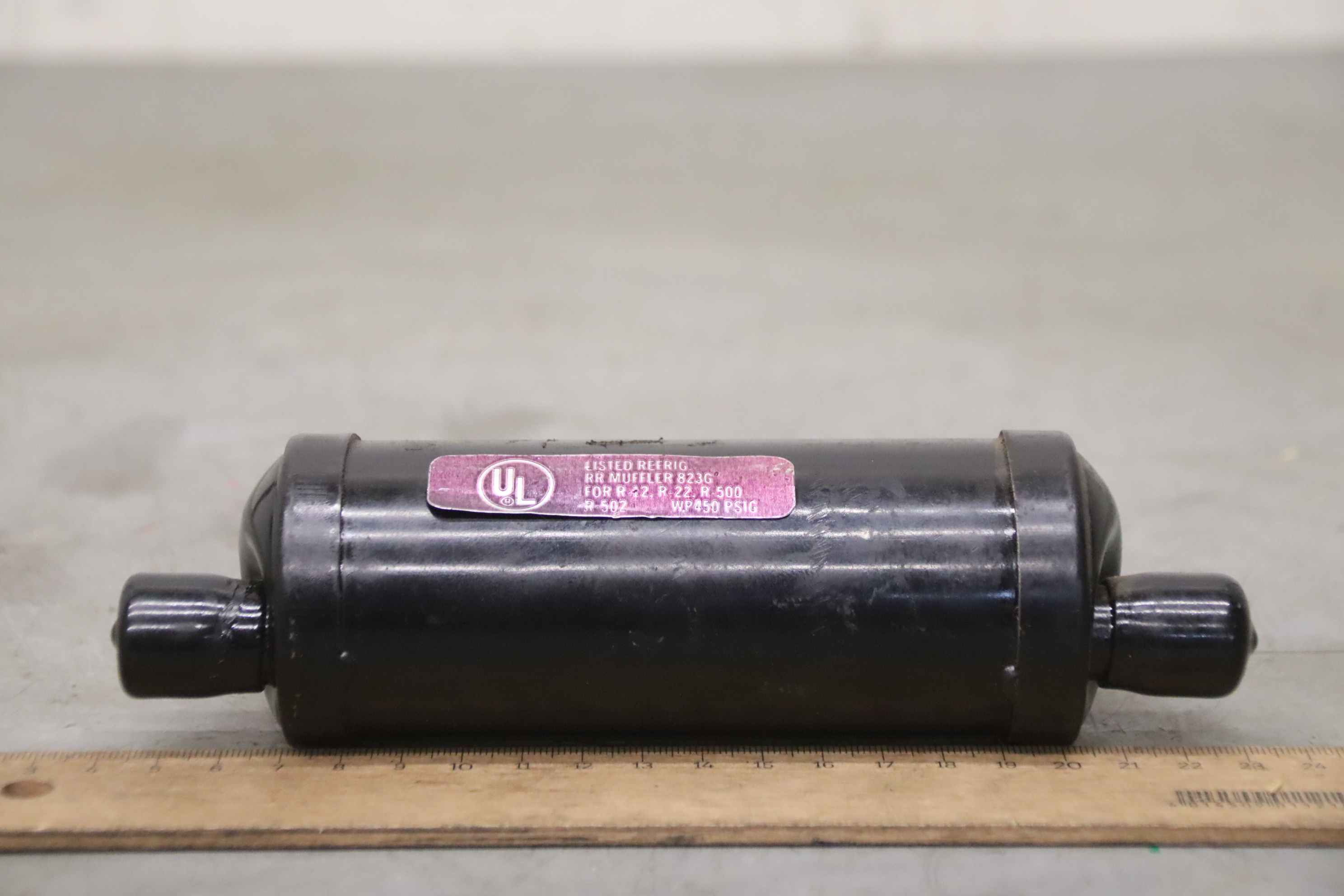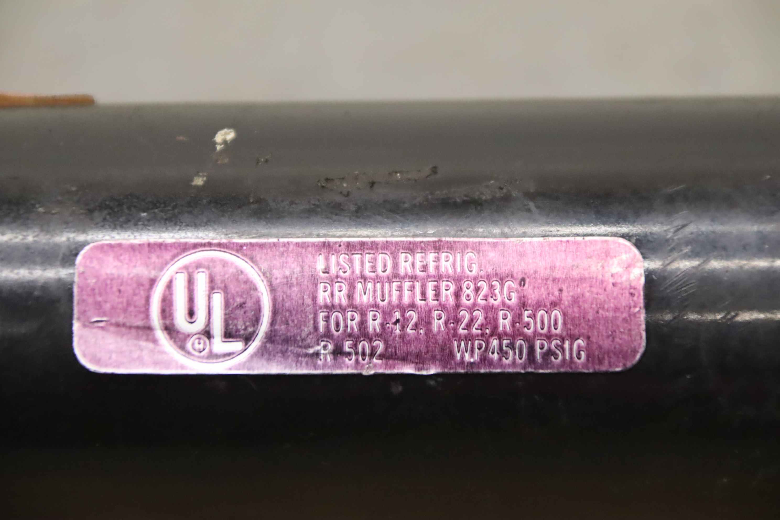 Refrigeration compressor, refrigeration machine, cooling compressor, refrigeration unit, cooling compressor, compressor, refrigerant silencer, discharge silencer -Manufacturer: UL Refrigeration Research, Discharge Silencer Muffler -Type: RR Muffler 823G -Connecting pipe: outer diameter 14.8 mm, inner diameter 13 mm -Pressure: up to 450 PSIG / 31 bar -Quantity: 1x muffler available -Price: per piece -Dimensions: Ø 54 x 190 mm -Weight: 0.4 kg/pc.