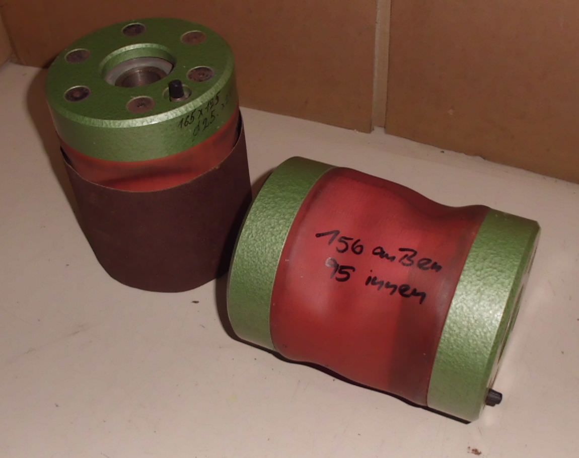 Sanding drum (rubber air drum) Original product from KED, (Kurt Ehemann) .Type: G 12.5 x 15 -consisting of: -Base body, rubber hose, air valve, 2 clamping caps for rubber hose -Dimensions: -Diameter: 125 mm -Grinding length: 100 mm -Length of main body: 150 mm -Mounting hole: 30 mm -Number: 2x available -Price: per piece Available on request in other sizes: e.g. diameter 40mm, 60mm, 75mm, 100mm, 125mm, 150mm, 175mm, 200mm, 250mm, 300mm e.g. grinding length 100mm, 150mm, 200mm, 250mm, 300mm, 400mm, 500mm also available as a brush abrasive. Furthermore, we also carry general Ehemann spare parts.