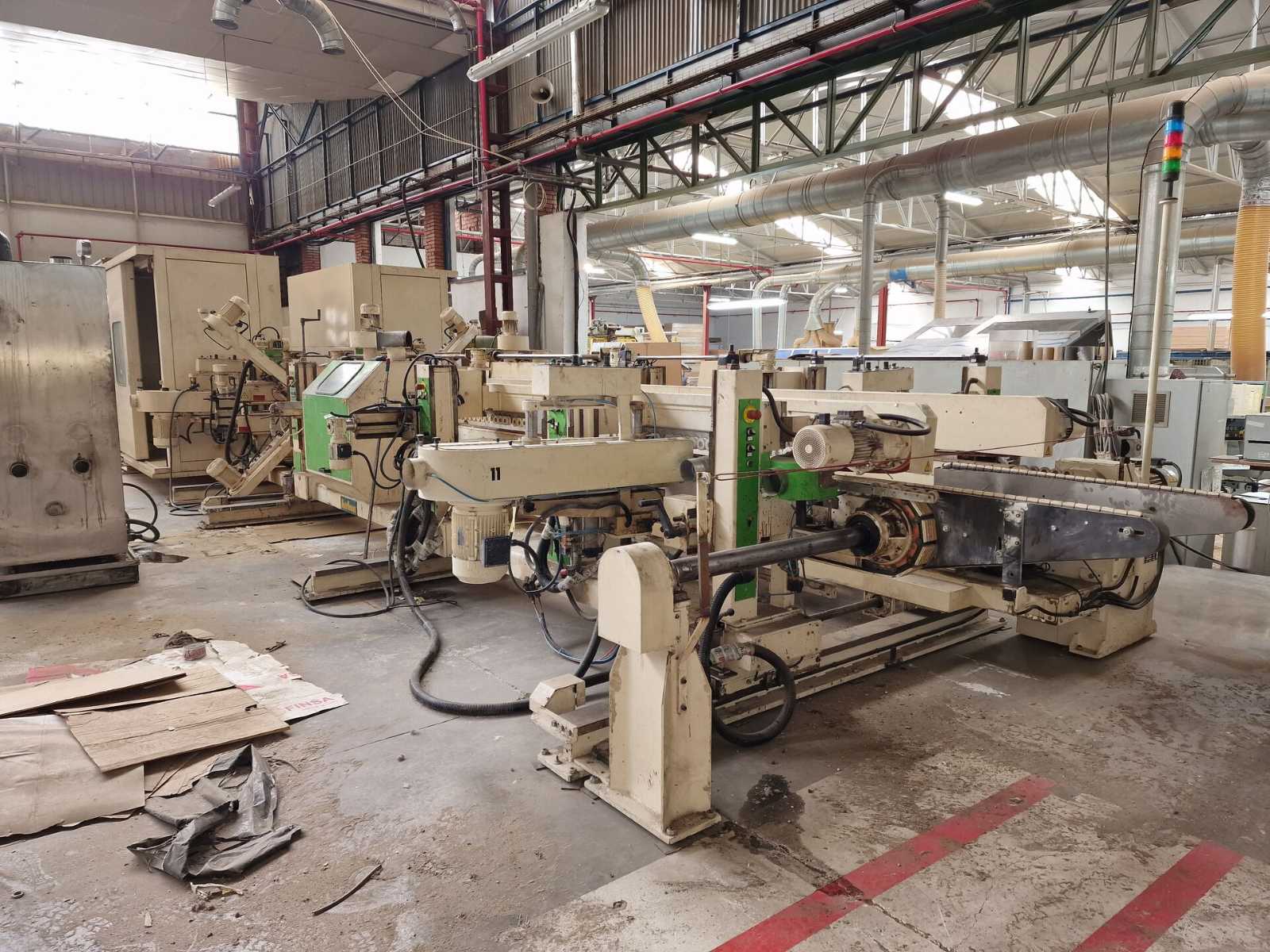 - Edge profiling, sanding and painting system - Serial number 03083 - Total installed power 117 KW - Working width from 200 mm up to 2500 mm - Workpiece thickness from 6 mm up to 80 mm - Minimum workpiece length 90 mm - Adjustable feed speed from 5 m/min up to 44 m/min - Power of the feed motors: 7,50 KW and 0,75 KW - Power of the machine opening motor 1,50 KW - Machine equipped identically on both sides with 9 units on each side: - 1 - Milling unit: adjustable in depth, height and inclination, motor 7,50 KW-6000 rpm - 2 - Milling unit: adjustable in depth, height and inclination, motor 4 KW-3000 rpm - 3 - Fine milling unit: upper and lower motor with 1,80 KW-12000 rpm each, tiltable up to 45° - 4 - Belt sanding unit: motor 2,20 KW-940 rpm, swiveling, height and depth adjustable, with pneumatic sanding pad - 5 - Belt sanding unit for upper bevel: Motor 1,10 KW-930 rpm, swiveling, height ...