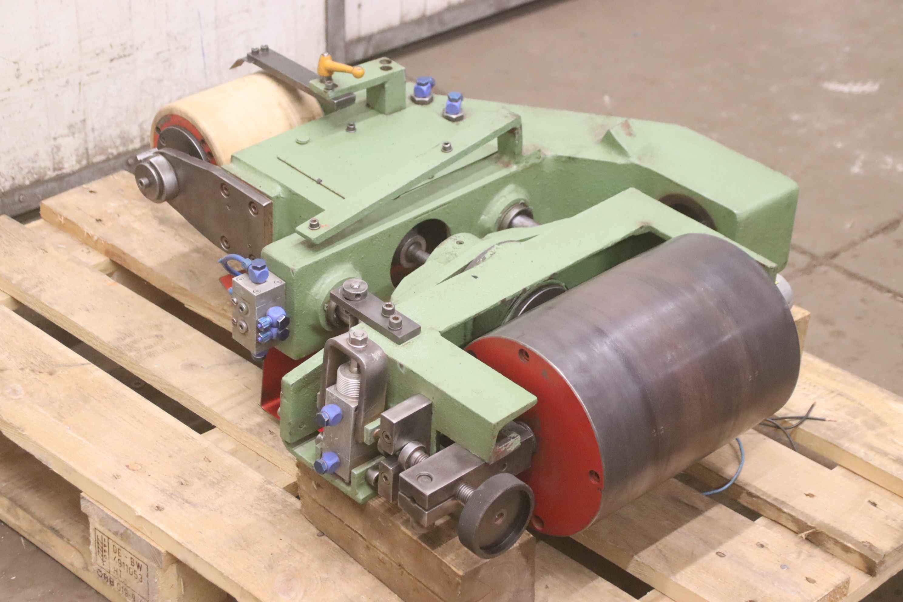 Aggregate kit, finishing unit, grinding unit, grinding station, belt sander, belt grinder, edge grinder, edge sander, profile sanding unit, small belt sander -Manufacturer: KED Kurt Ehemann, Homag, belt sanding unit from belt sander -Type: unfortunately no type designations -Roll: Ø 215 x 295 mm drum motor NG 45/2n 3 kW 2850 rpm -Roll: Ø 150 x 160 mm -Individual components: see photos -Transport dimensions: 830/690/H360 mm -Weight: 144 kg