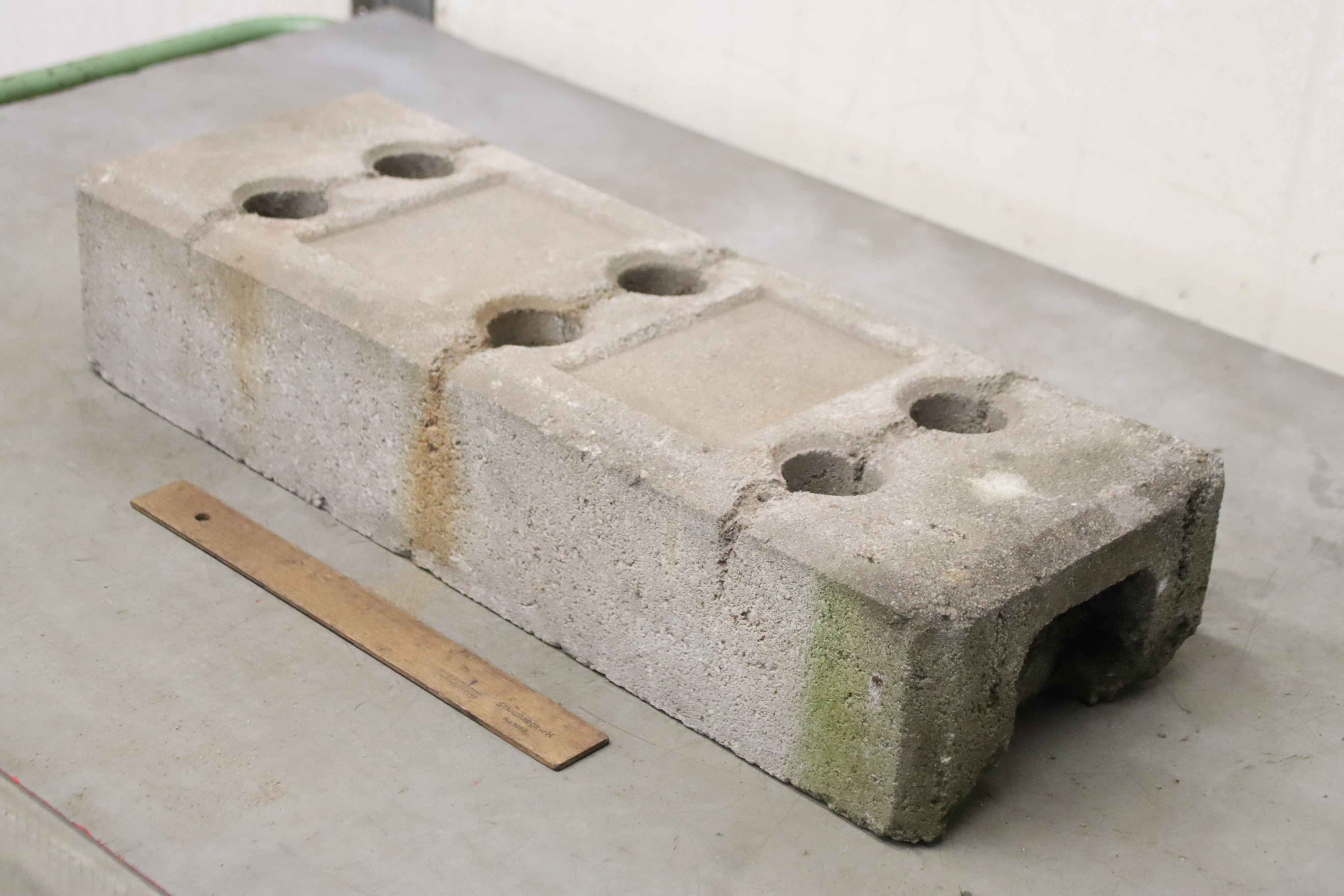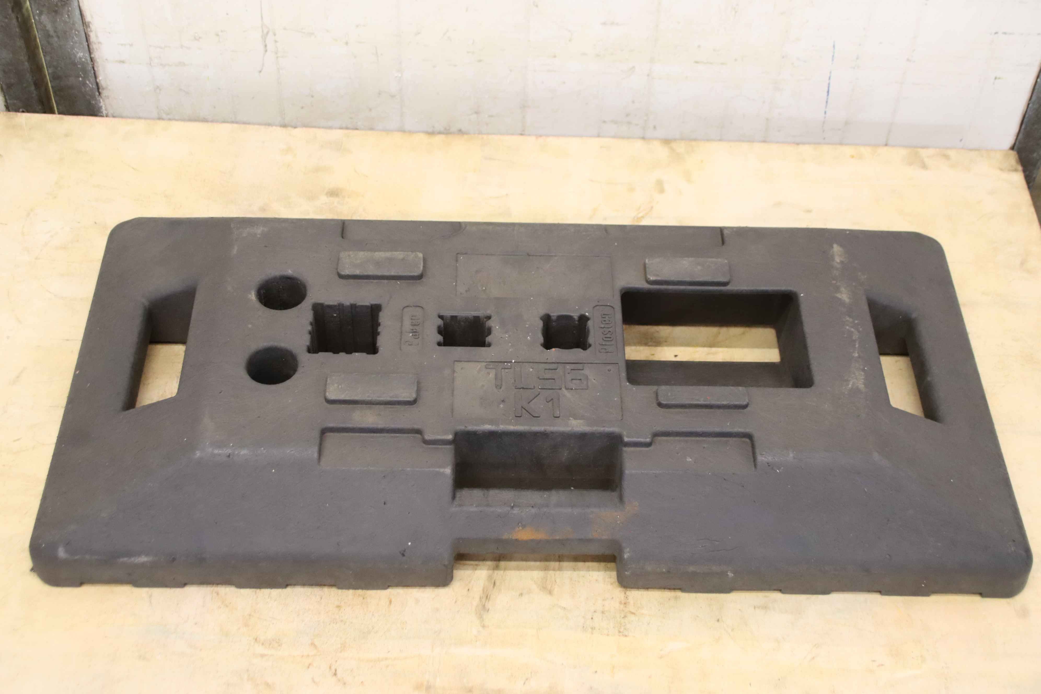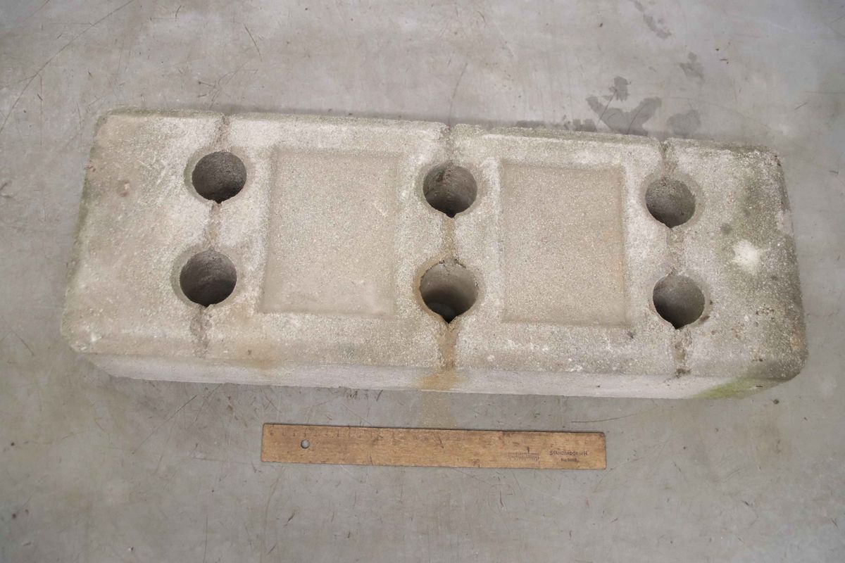 Base plate, site fence base, barrier base-Footplates: made of concrete, 19 pieces-Intake: 6x Ø 45 mm-Price/delivery: complete-Dimensions: 620/220/H130 mm respectively-Weight 33kg/pc-Total weight: 627 kg