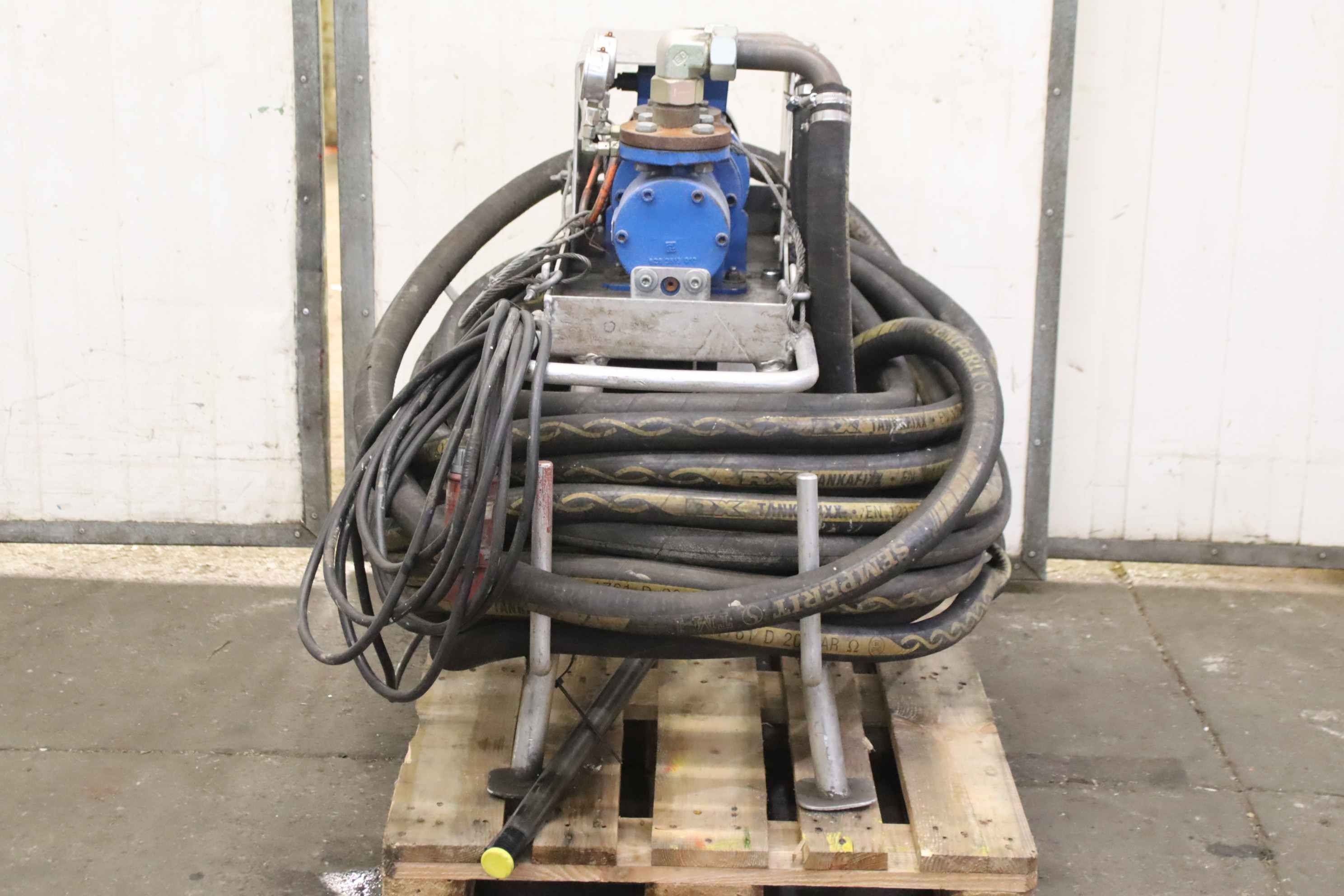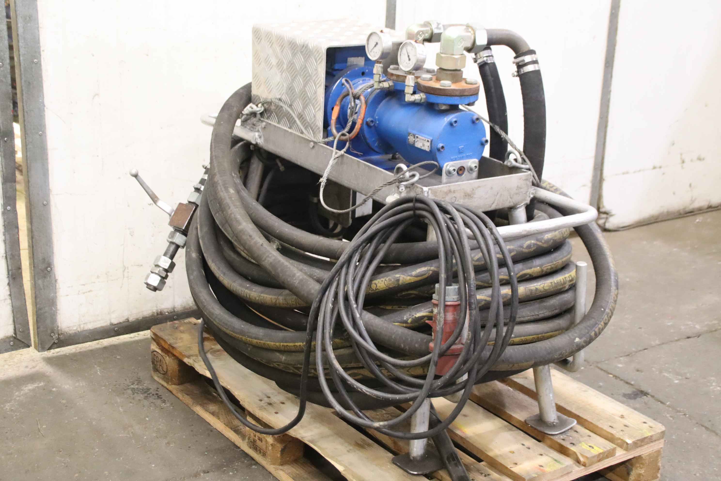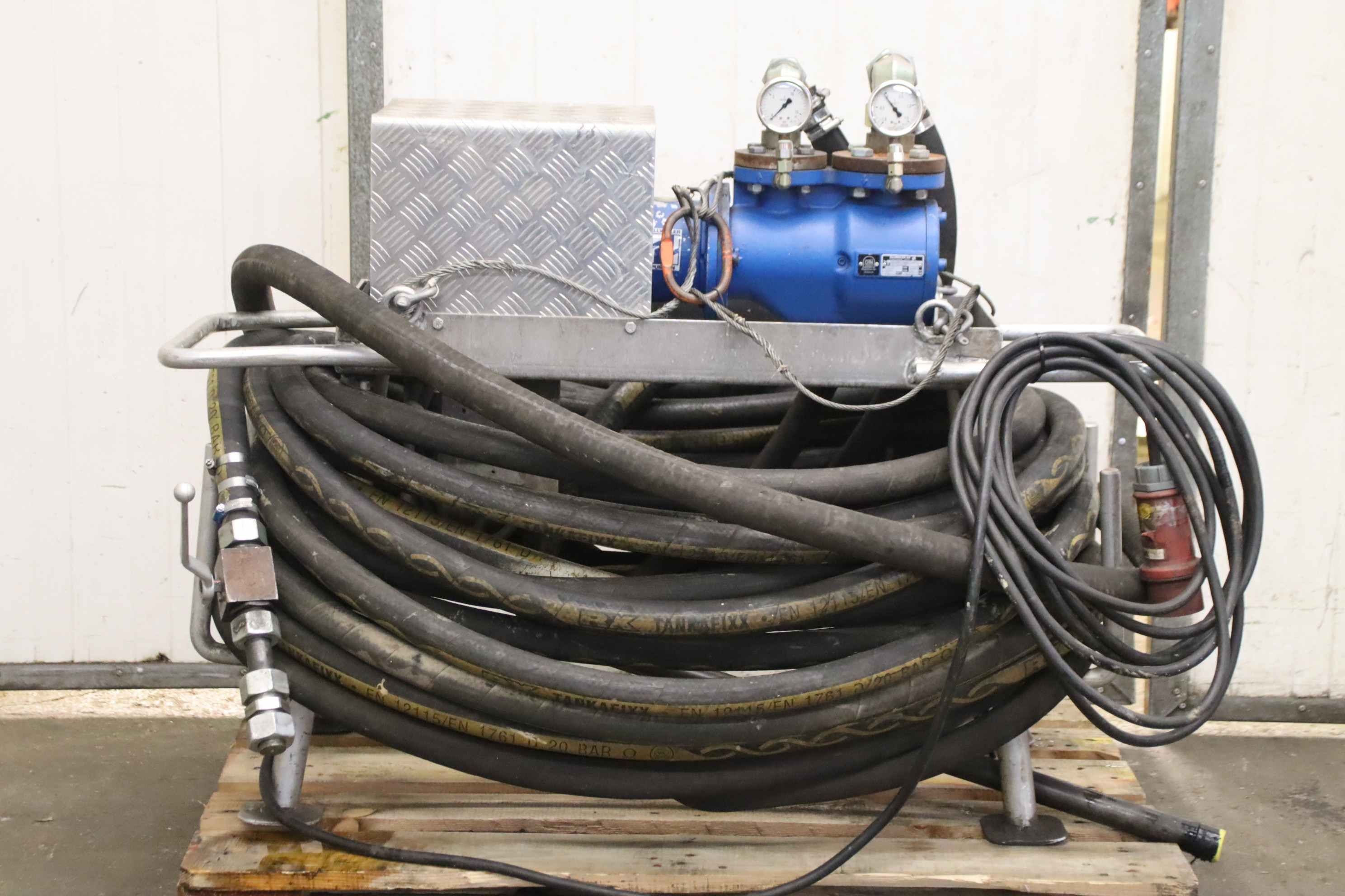 Triple screw pump, centrifugal pump, high pressure pump, centrifugal pump, lubricating oil/oil pump, triple screw pump -Manufacturer: Allweiler, screw pump type SPF40R54U8.3-W20 with hose package -Flow rate: 3.4 l/min -Pressure: 3 bar -Motor: 0.7 kW / 1800 rpm -Hose package: length 1x 60 m / 1x 6 m -Dimensions: 1230/900/H960 mm -Weight: 160 kg