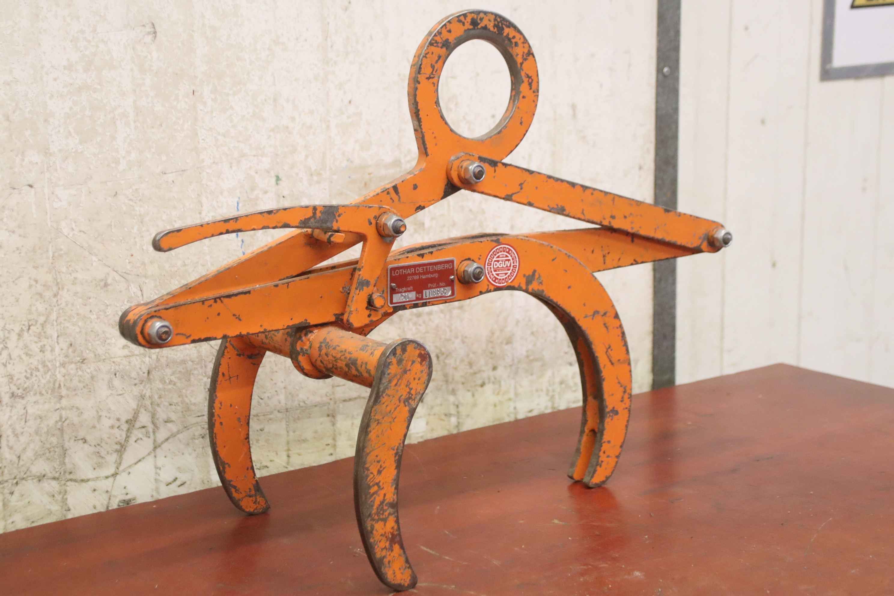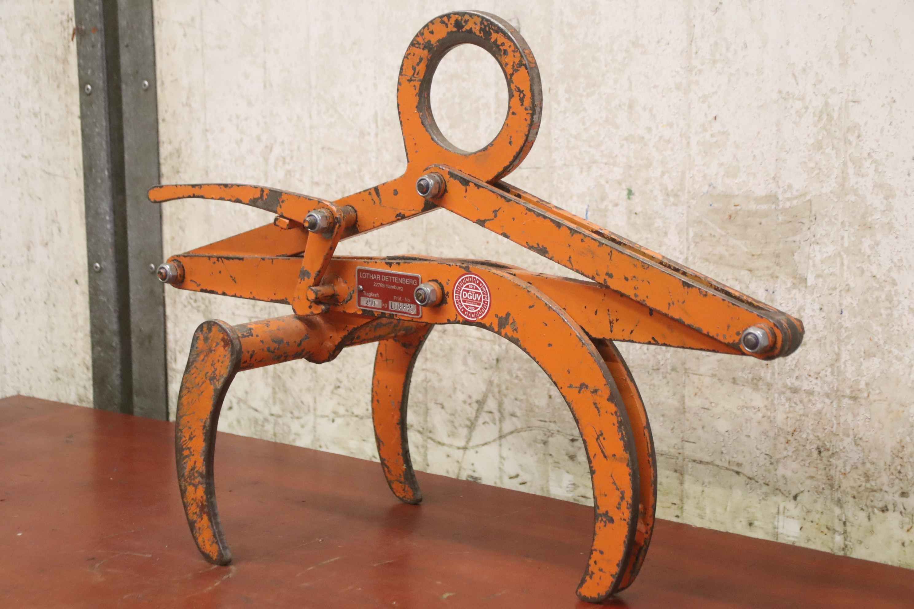 Pipe gripper, round gripper, laying tongs, round material gripper, scissor gripper, pipe laying device-Manufacturer: Siegert, round material gripper round pliers type RZ-Gripping range: 50 to 250 mm-Load capacity: 250kg-Dimension: 630/250/H450 mm-Town weight: 11 kg