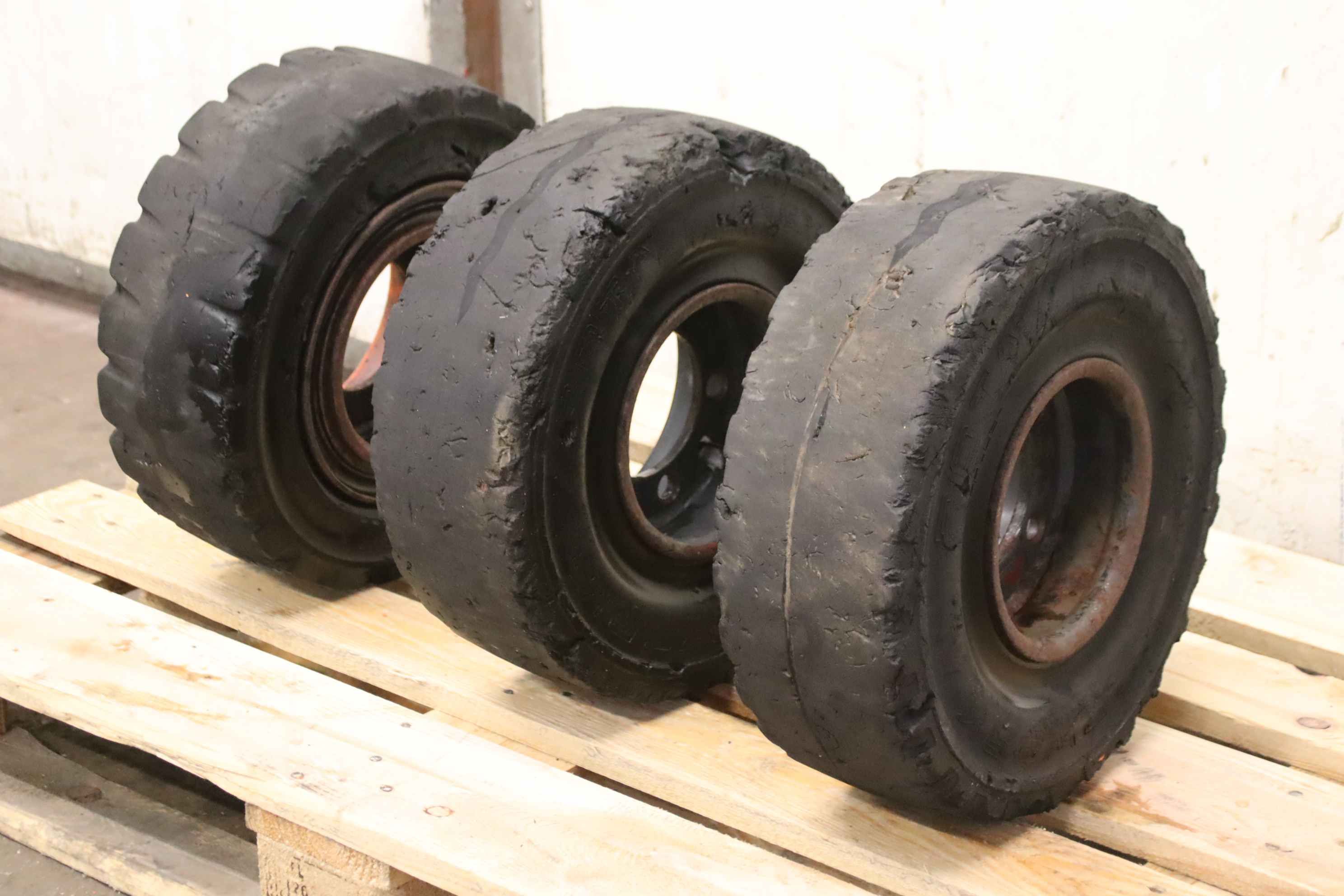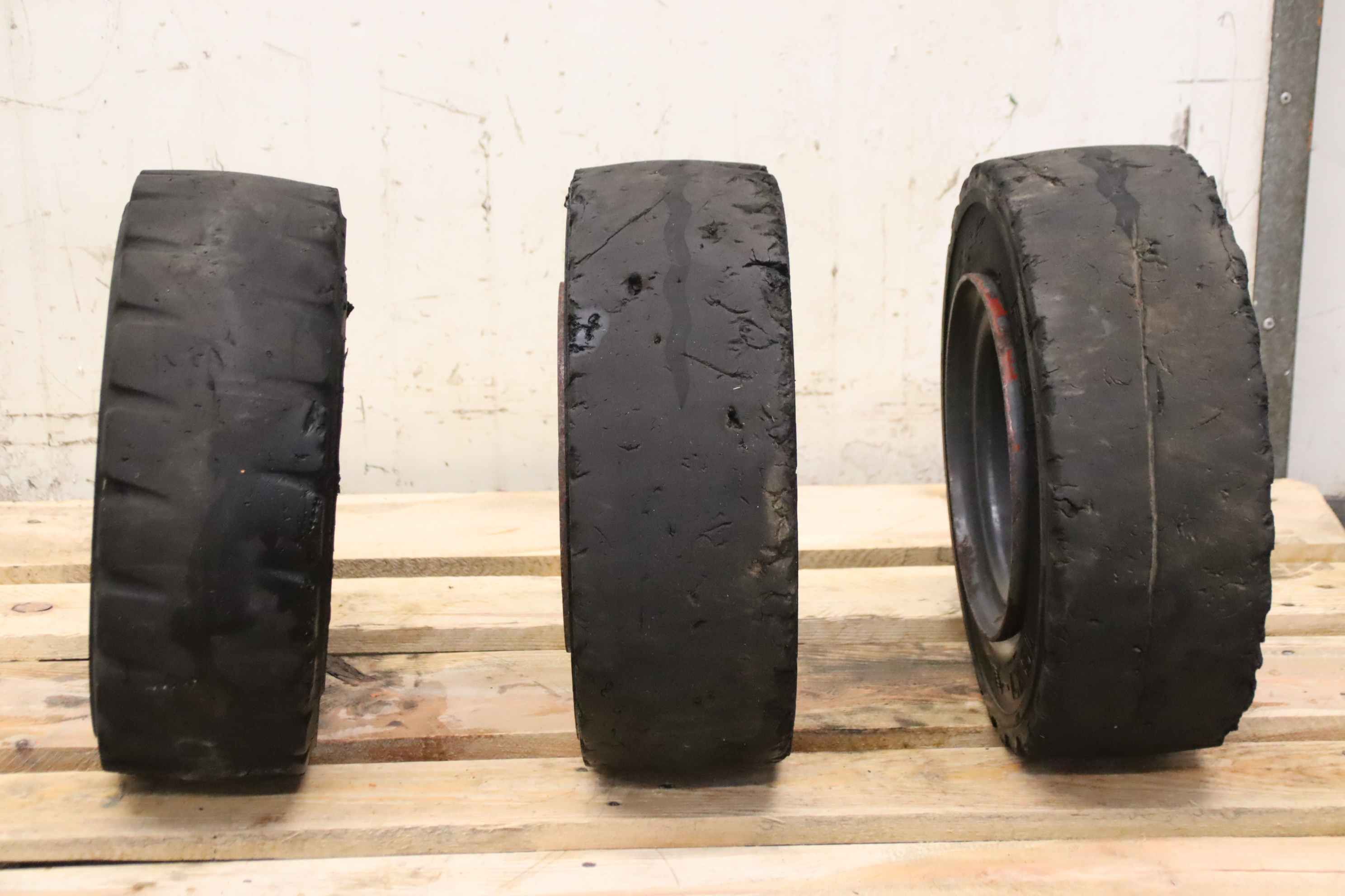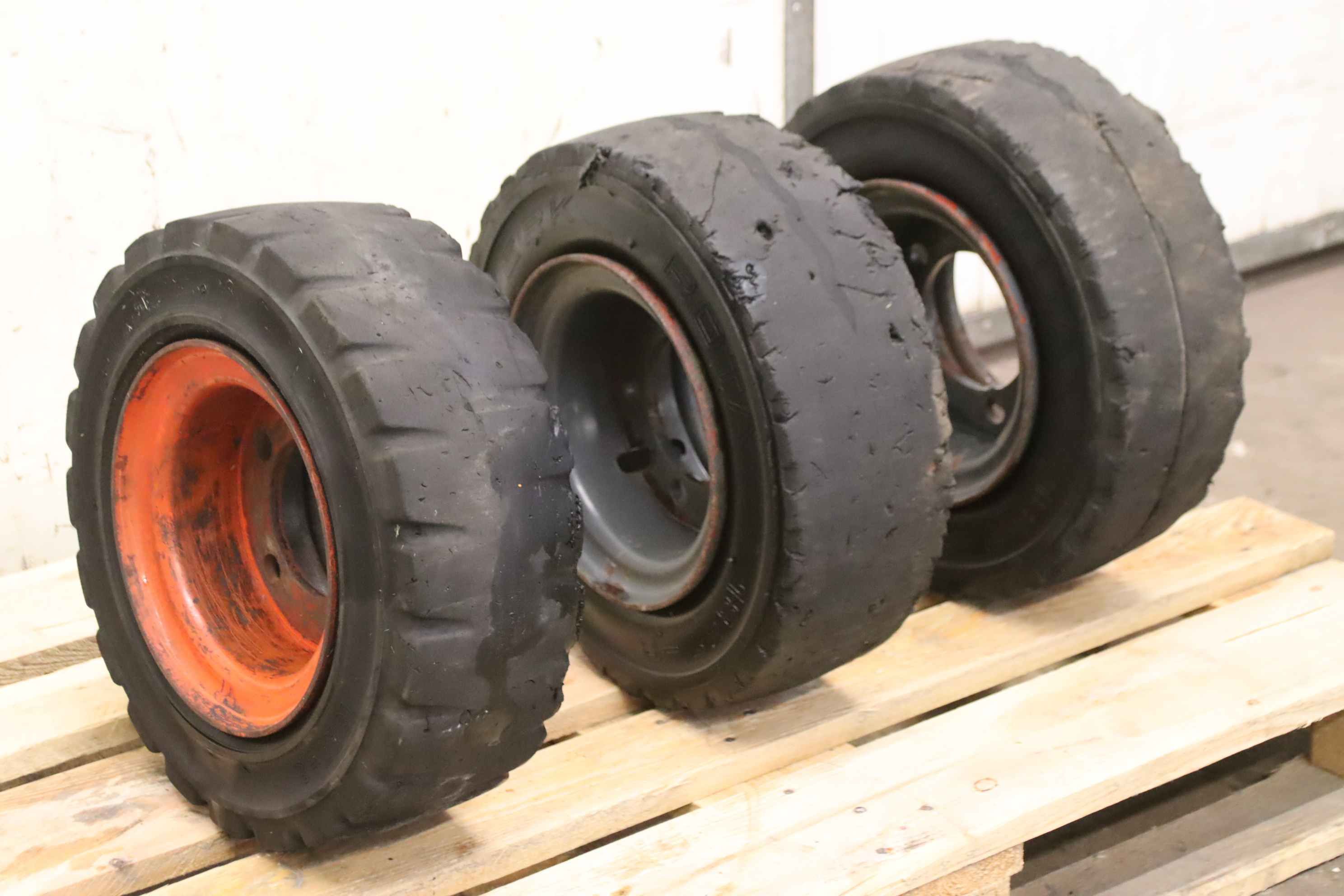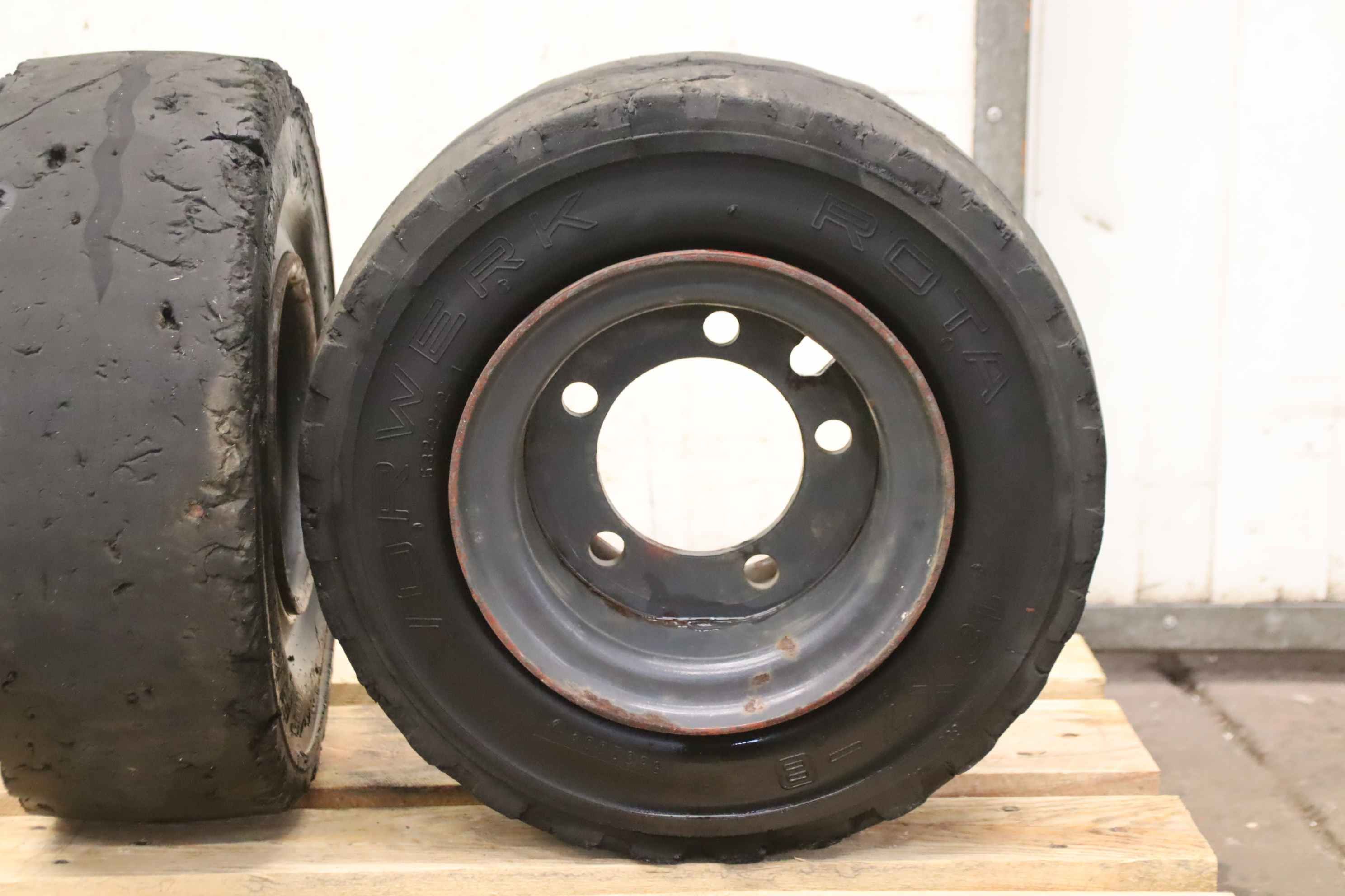tires, solid rubber tires, forklift tires-Manufacturer: Vorwerk Rota, solid rubber tires 3 pieces-Tire size: 18x7-8 rim 4.33 R-8 532/272-1-Bolt circle: Ø 148 x 18 mm-Recess: Ø 110 mm-Price/Delivery: complete-Weight: 22 kg/piece