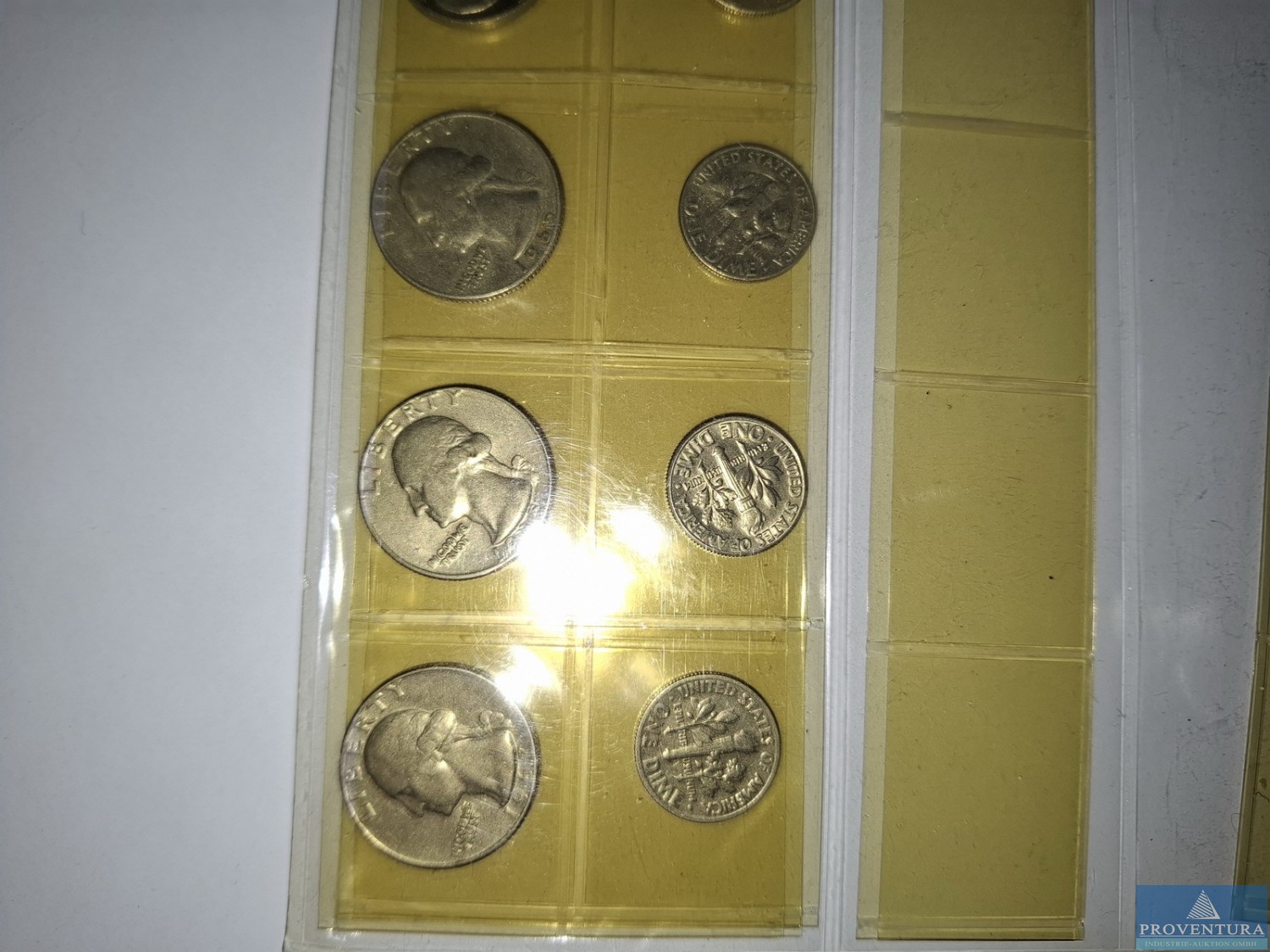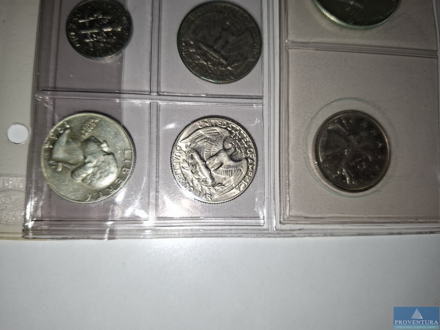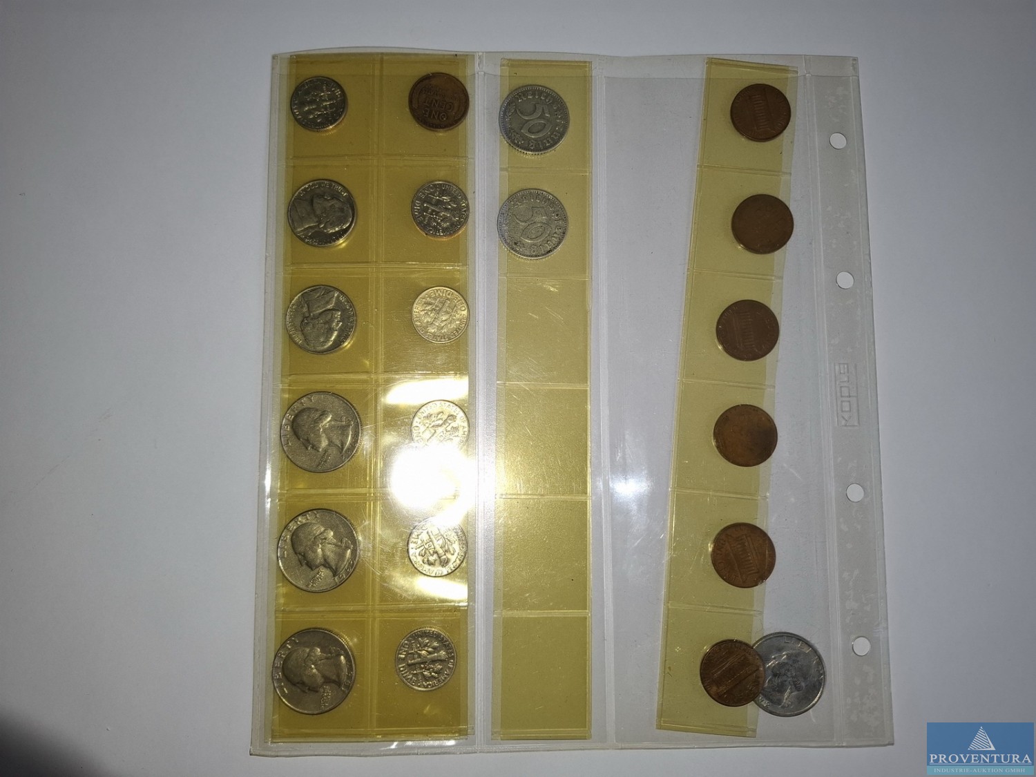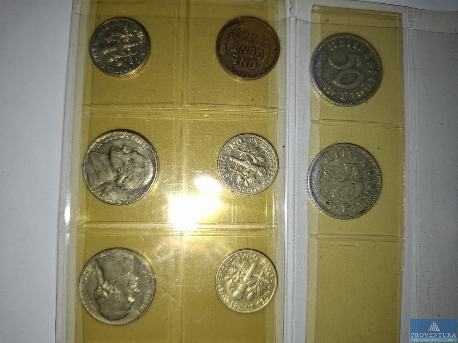 Оборотные монеты США/Германская империя 9x 2 пфеннига 1924-1936, 6x 1936-1939, 3x 1 пфенниг 1940-1944, 1x 4 пфеннига 1932, 5 пфеннига 1940-1944, 2x 10 пфеннига 1940-1944, 2x 50 пфеннига 1935, США 28x 1 цент, 4x 5 цента, 15x 10 цента, 10x 25 цента, 1x 50 цента 1964, 1 доллар 1976, Канада 1 цент + 25 цента, Италия 2x 500 лир, Испания 1 Песета Франко, Югославия 20 динаров 1955, всего 28x Германская империя, 59x США