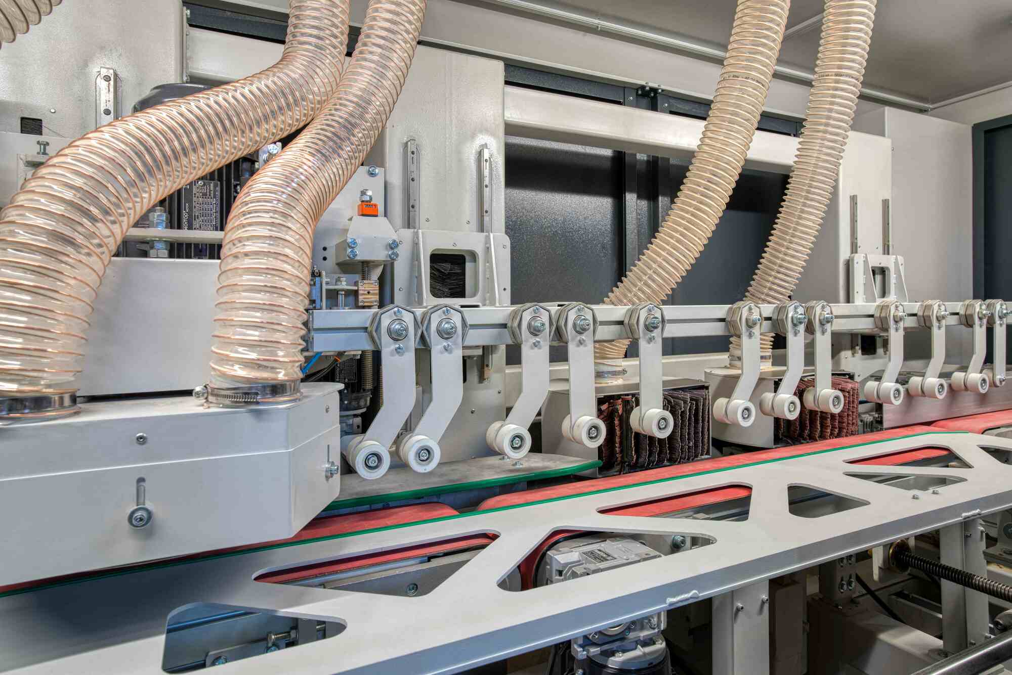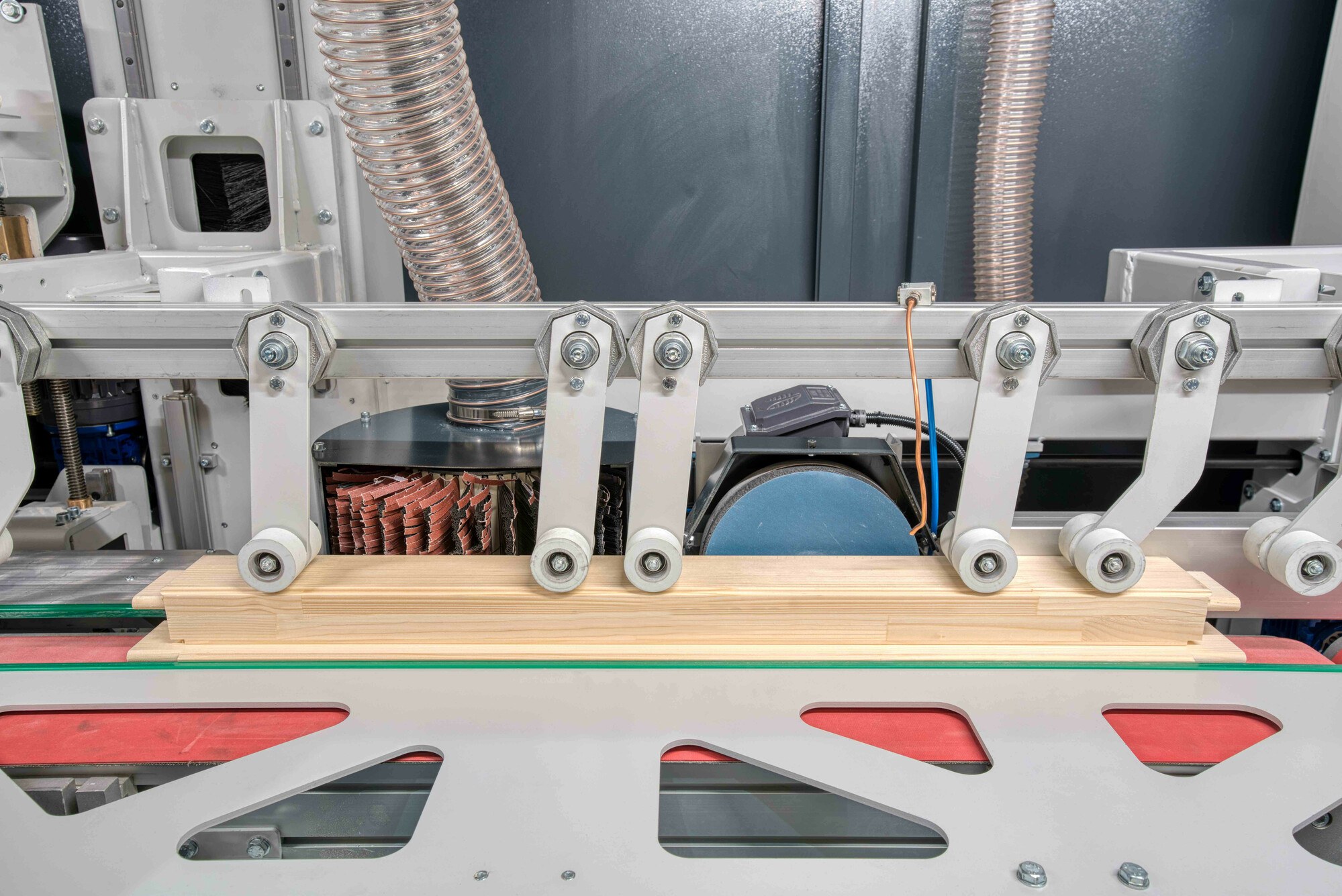 - Pressure rollers are positioned at the top along the entire length of the machine to ensure the stability of the workpiece feed in the machine. The rubberized rollers are equipped with a spring system.