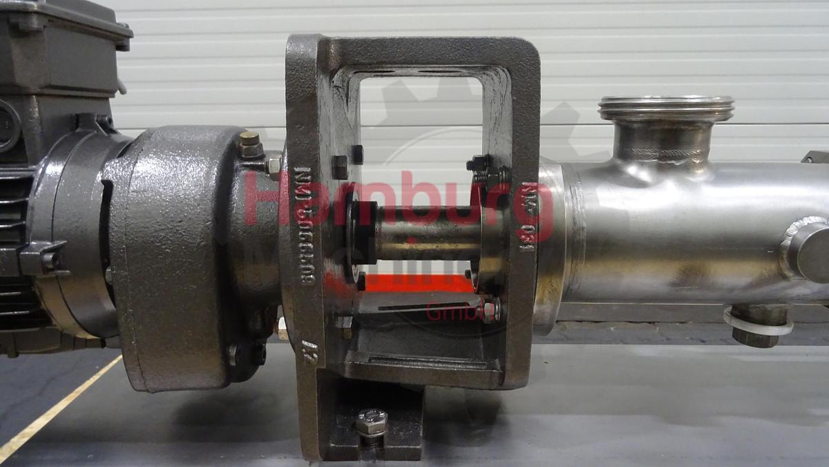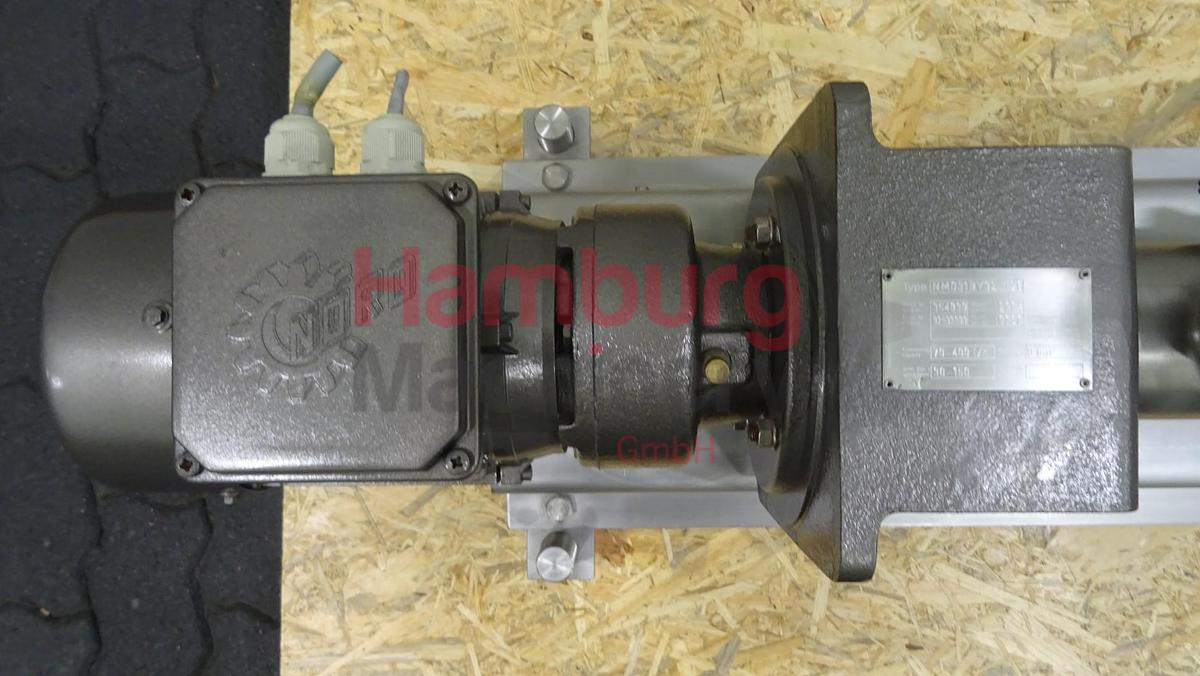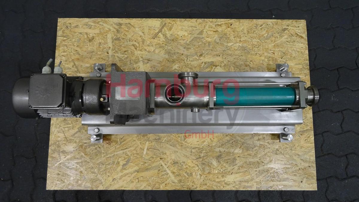 The NETZSCH NM031BY02S12B NEMO® pump is a progressing cavity pump (also known as a mono or screw pump), engineered for the continuous and gentle transfer of challenging media. This pump operates on the well-proven progressing cavity principle, consisting of two primary components: a precision-machined helical rotor and a resilient elastomer stator. The rotor features a single-helix design with a large pitch, deep thread profile, and small core diameter. As the rotor rotates eccentrically within the stator, sealed cavities are formed that convey the product continuously and pulsation-free from inlet to outlet. This pump is previously used in a dairy factory. Motor: 0,75 kW - 230/400 V - 50 Hz - 1.375 rpm - 3,64/2,10 A. Connections on the inlet/outlet: DN 50. Current capacity: 70 - 400 ltr/h. Pressure: up to 8 bar. Rotor speed: 30 - 150 rpm., Key Advantages:, - Valve-free design with stable, proportional flow rate relative to rotor speed., - Excellent self-priming and suction capability., - Suitable for inhomogeneous, viscous, abrasive, gaseous, and solids-laden media., - Gentle product handling, ideal for shear-sensitive materials., - Capable of dosing applications., - Designed for Cleaning-in-Place (CIP)., Limitation:, - The pump must not be operated dry. Even short periods of dry running may result in stator damage., Type of Machine: Progressing Cavity Pump, Stock Number: 1372, Capacity: 70 - 400 ltr/h, Maximum product pressure: 8 Bar, Rotor speed: 30 - 150 rpm, Motor: 0,75 kW - 230/400 V - 50 Hz - 1.375 rpm - 3,64/2,10 A