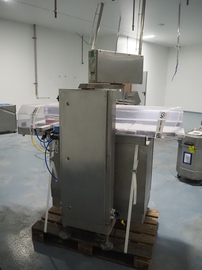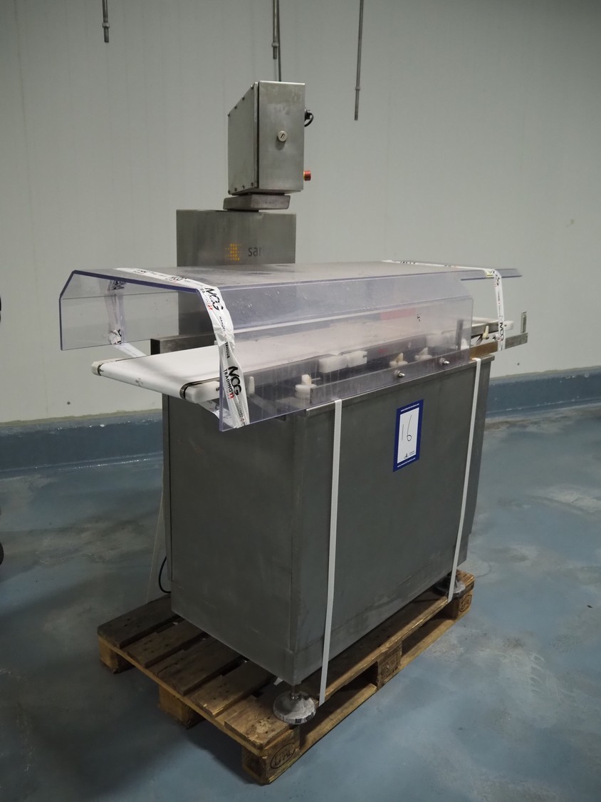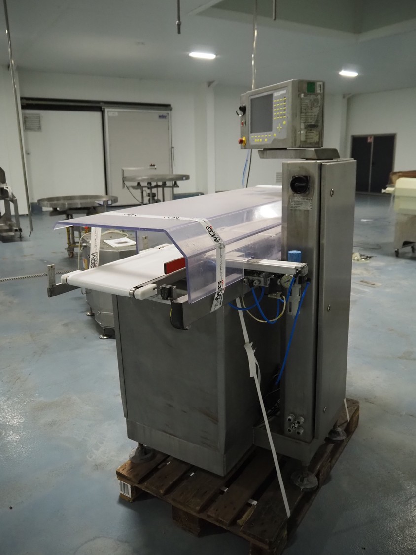 Sartorius SYNUS10 Metal detector checkweigher Stainless, overall belt dimensions 1700mm x 150mm, with Sartorius MDP Plus metal detector aperture 200mm W x 330mm H, checkweigher platform 260mm x 150mm, weight rang 100g to 2000g, two push arm rejects, previously used for jars of olives, 1Ph Password 1827