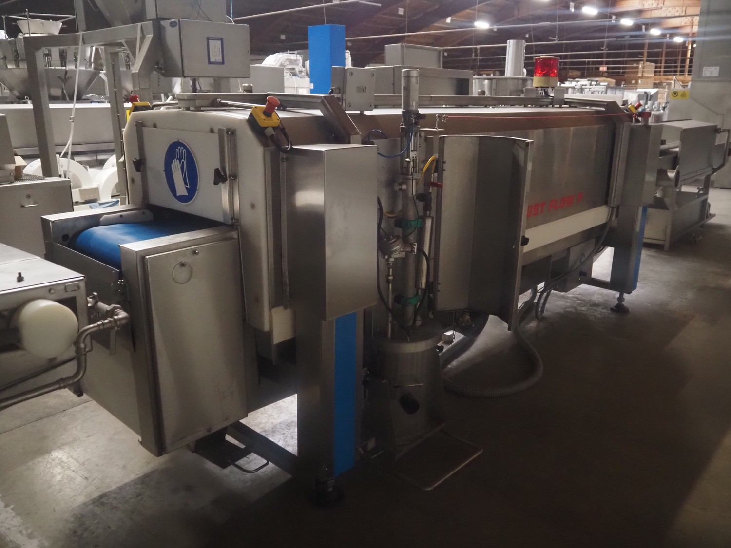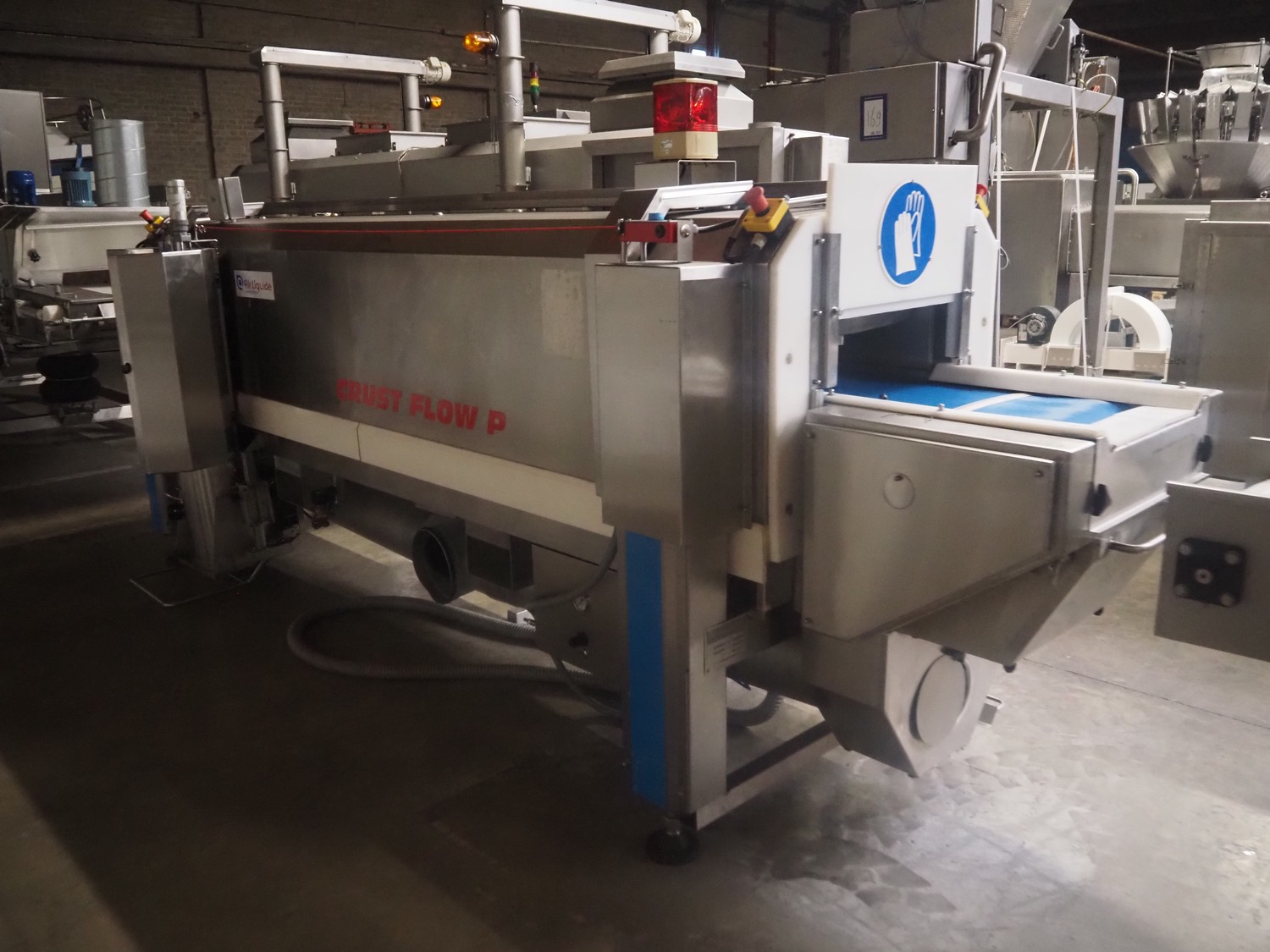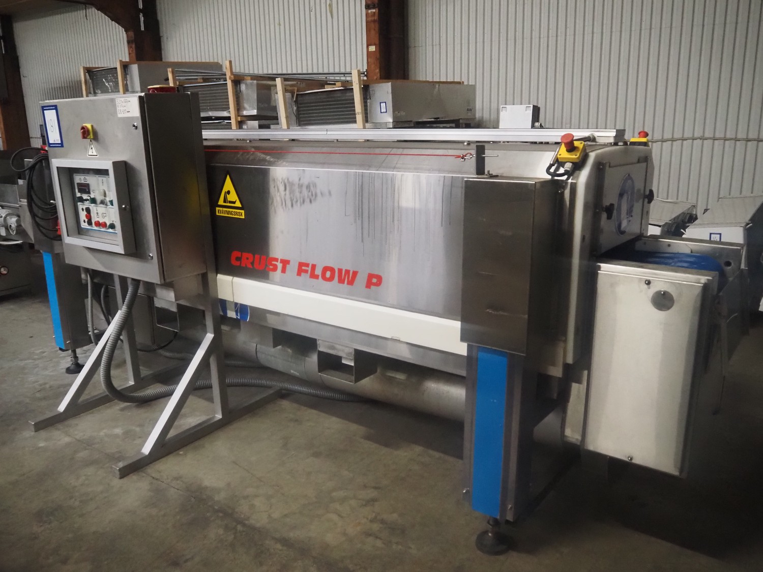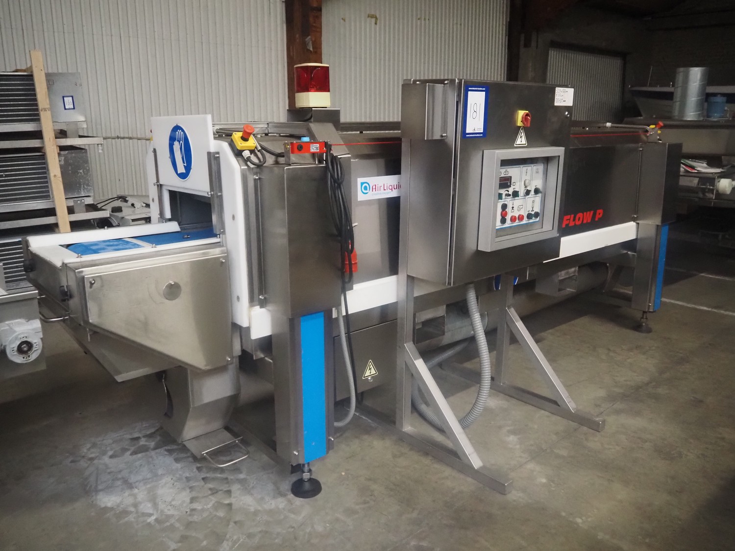 Serap shock freezing tunnel, type: CRUST FLOW P, number: P95.05, year of construction: 1997 (revised in 2020), 400 V, 3 Ph, 50 Hz, 1 kW, weight: 1300 kg, plastic belt, belt width: 450 mm, clearance: 440 mm x 110 mm, total dimensions: 4300 mm x 1200 mm x 1700 mm. Including s/s switch cabinet, dimensions: 1000 mm x 920 mm x 1600 mm.
