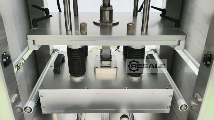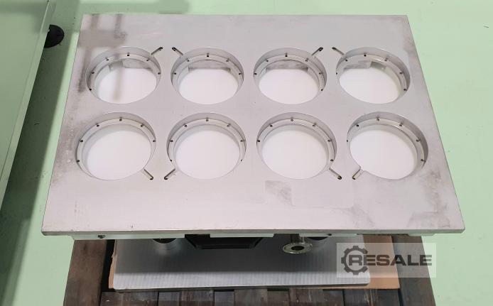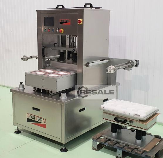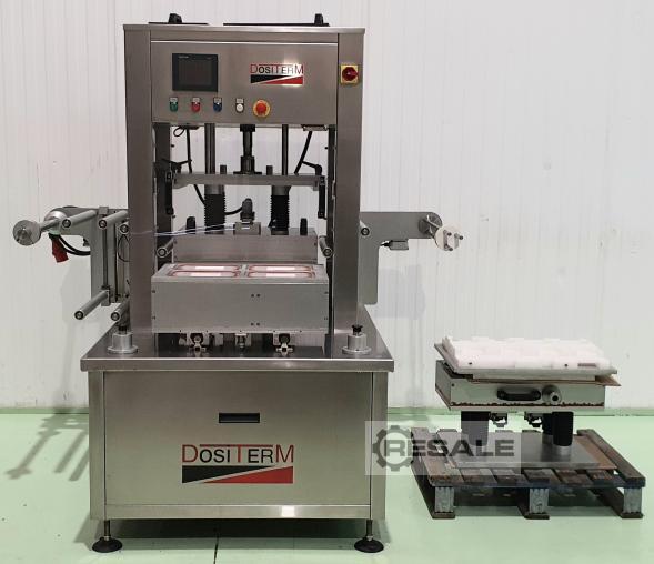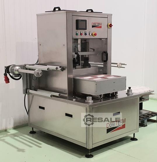 Semi-automatic traysealer from the manufacturer DOSITERM, model SEMI V/G, ready for packaging with protective atmosphere, with vacuum or only heat sealing. Semi-automatic traysealer, works at cycles of 4 or 8 containers depends mold, 5/8 cycles per minute, depends on the working function. Tray feeder by automatic trolley. Output of the machine through the same input carriage. The heat sealing machine performs a welding process from one thermoplastic to another thermoplastic or other compatible material using heat and pressure. It is used to make a protective atmosphere by extracting oxygen from inside the container and replacing it with an inert gas, or it only performs the sealing action and can also be sealed with vacuum. The machine is ready to plug in and work with. External measurements (mm): Height: 1800, Length: 1720, Depth: 1400. It has 2 molds to work. Rect ...