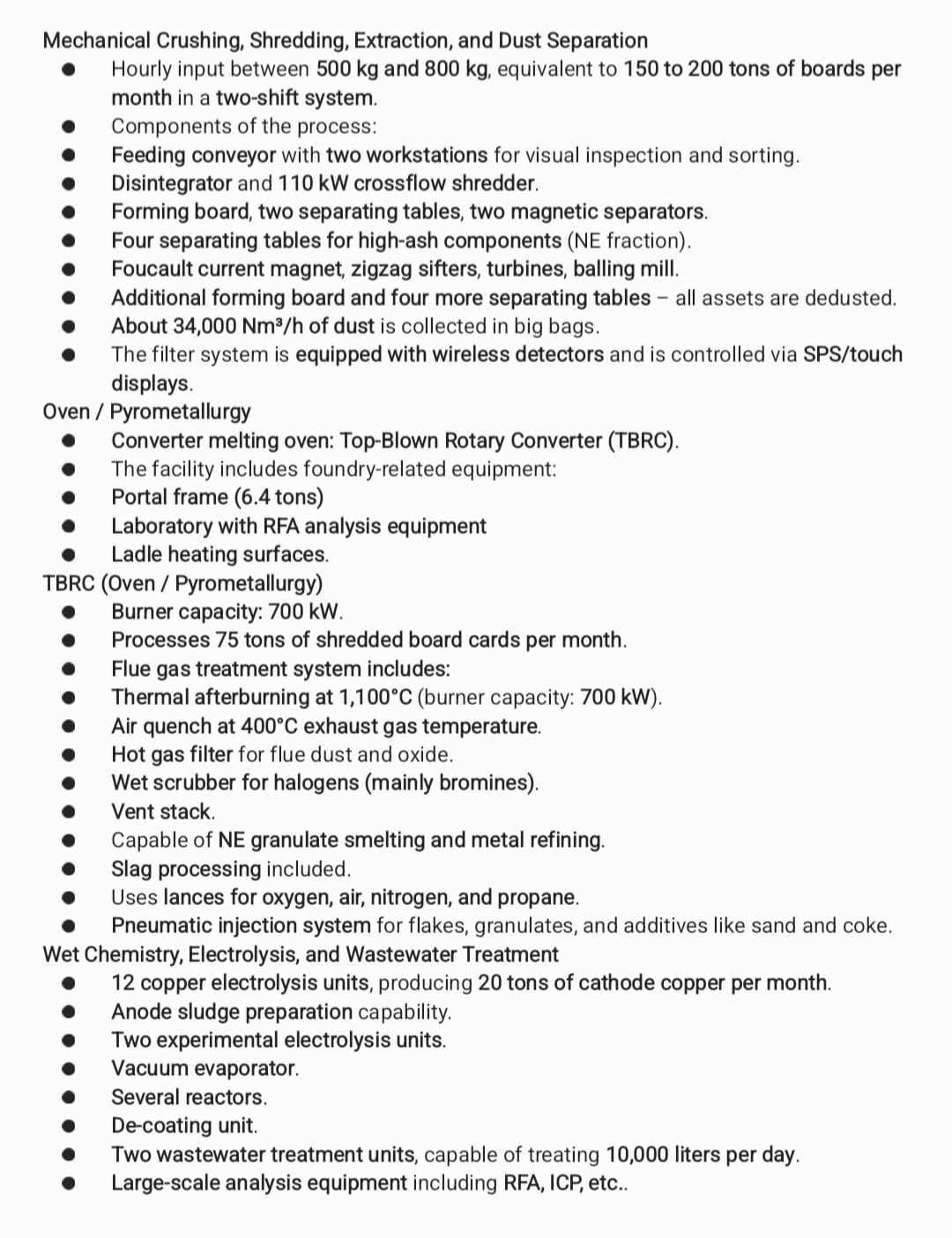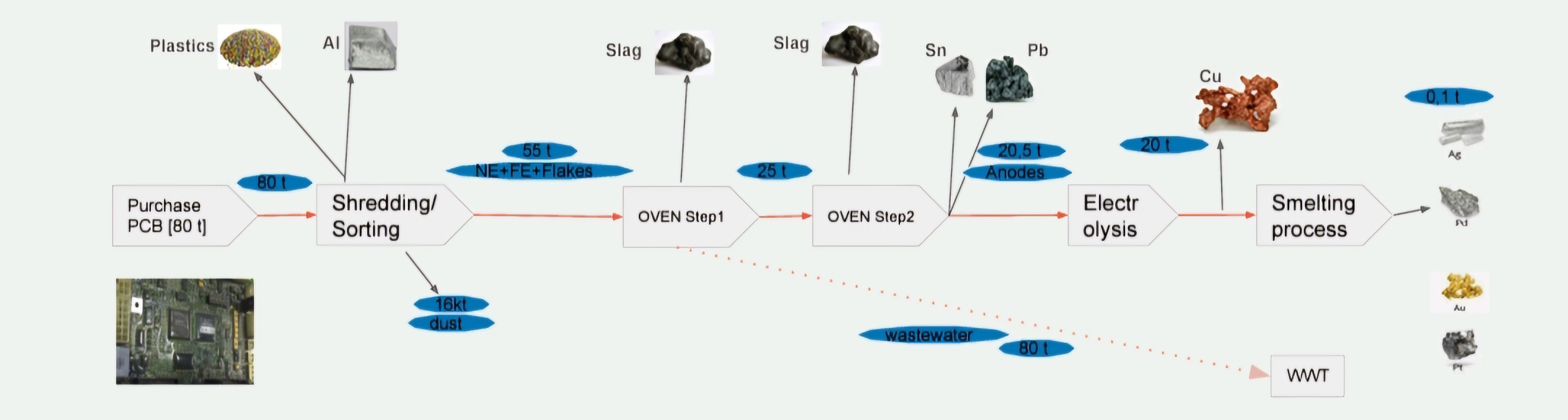 Metal recovery is carried out in several steps. Through the anode process, lead and silver are separated, while electrolysis is used to extract copper. In the final stage, a smelting process is applied to recover gold, silver, platinum, palladium, copper, tin, and lead.