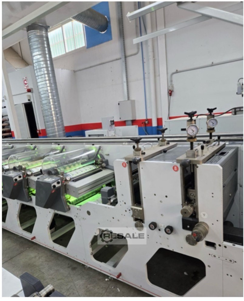 Gallus EM 430 S (6 renk) Yapım yılı 2017 - Makine hızı 1 – 150m/dak (ürün < bağlı olarak maks.) - UV dahil elektrik gücü, 60m/dk'da yaklaşık 80kW (20kW bekleme) - Malzeme kalınlığı 36μm ila maks. 450μm, genişlik 215 -425mm - Çözme ve geri sarma (iki sarma mili ile geri sarma, sol ve saat yönünde) çapa. 1000mm ve 150kg rulo ağırlığı - Sensör ile çözme ucunun algılanması - Gerginlik Kontrol Beslemesi 30-300N (± 10N) - 0,1 mm± ağ kenarı kontrolü yanal toleransı - 6 adet baskı ünitesi fleksografik baskı (12" – 24" silindir çevresi), 1 adet baskı ünitesi Önden ve arkadan baskı mümkündür - 6 GEW UV kurutucu 1 döner delme ünitesi - Otomatik gerginlik kontrolü 0 – 400N (± 5N) - Korona izi tedavisi - Temas yolu temizliği - Boyuna kayıt kontrolü (tümü) - Çapa açılan 1 mobil laminasyon istasyonu. 800 mm (10- ...